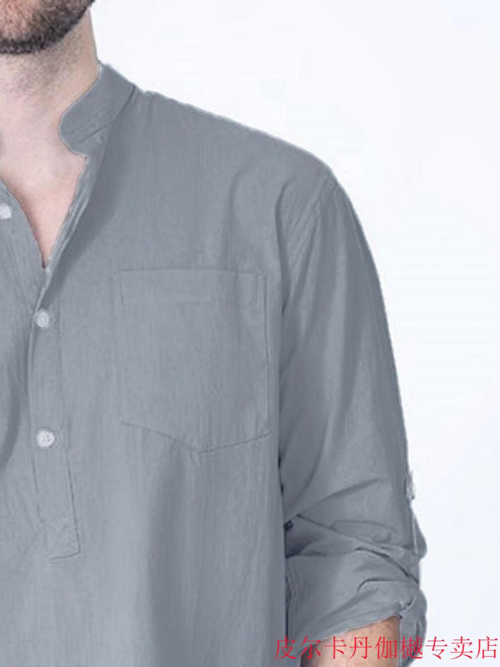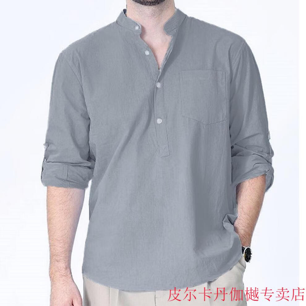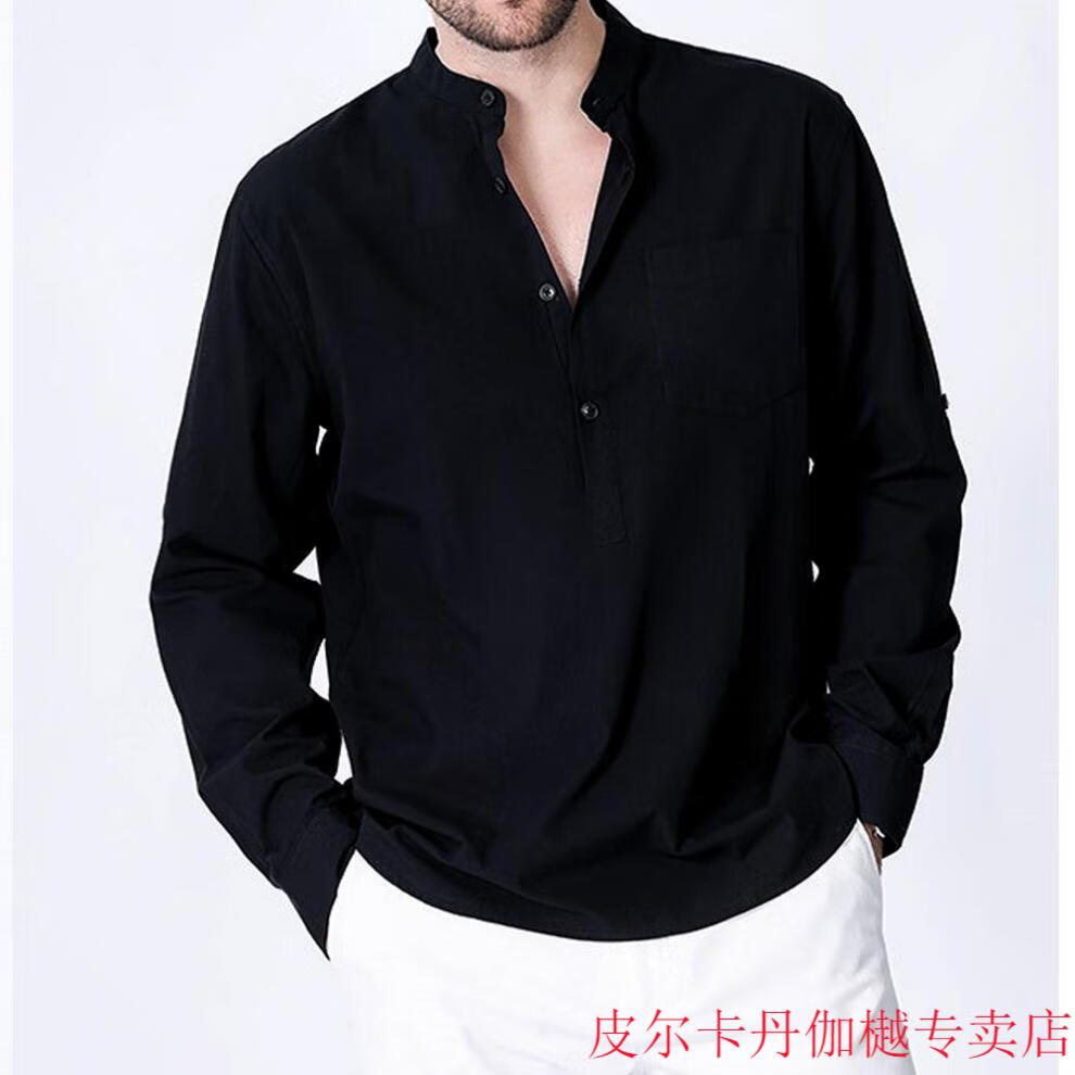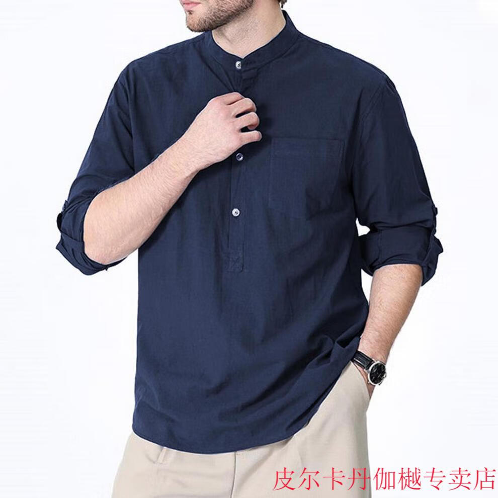 Pierre Cardin Spring and Summer New Henley Shirt Long Sleeve Men's Solid Color Cotton Beach Shirt Casual New Chinese Style Shirt Navy S