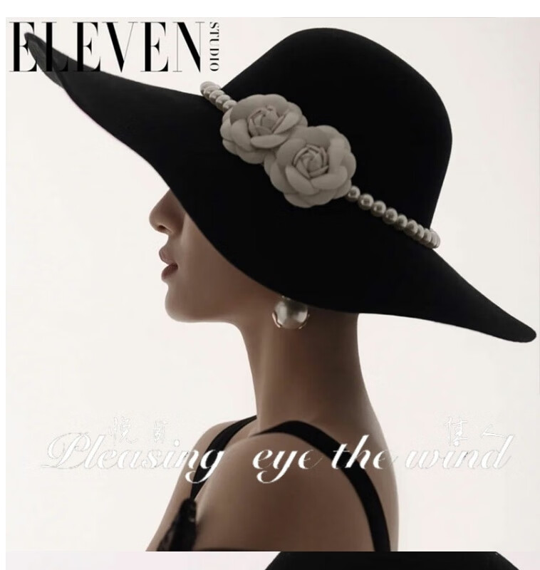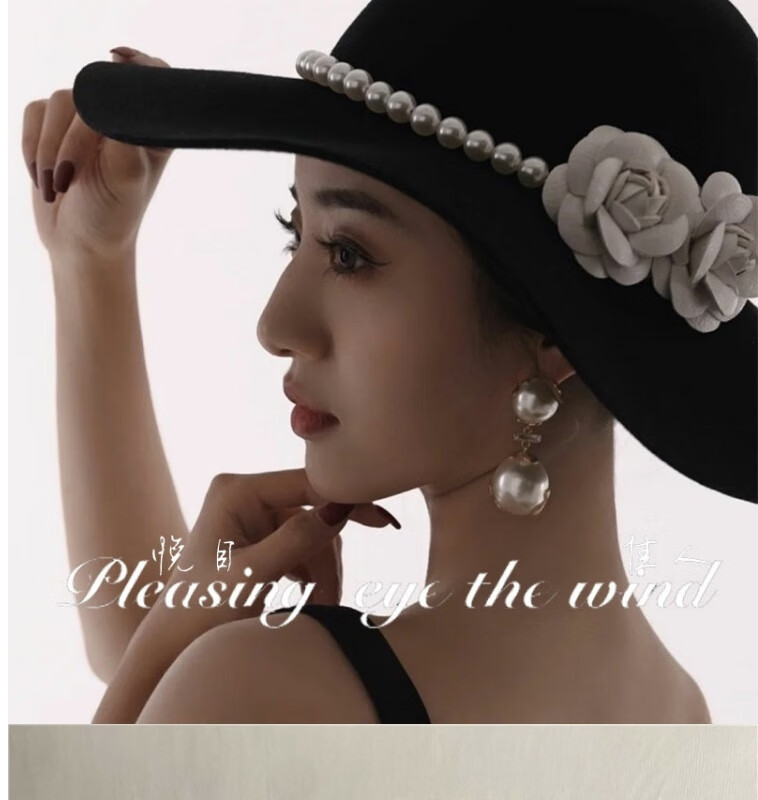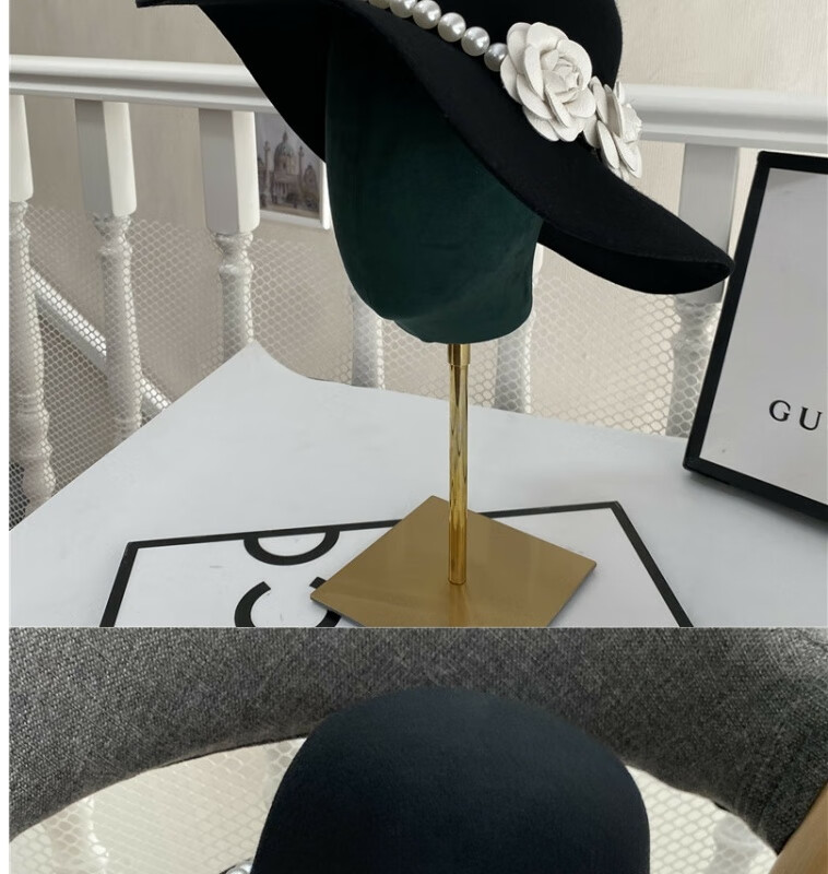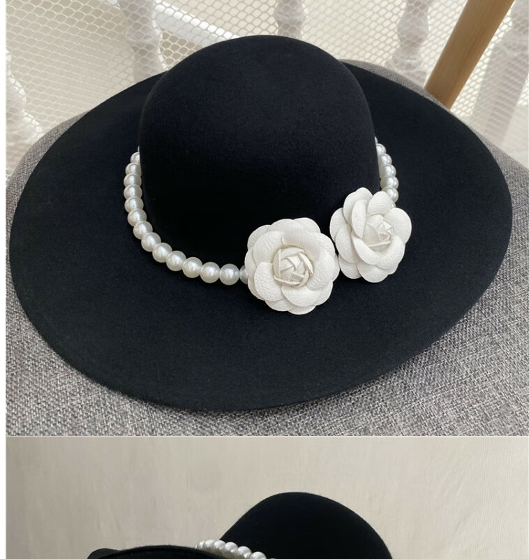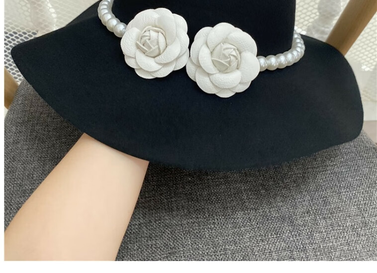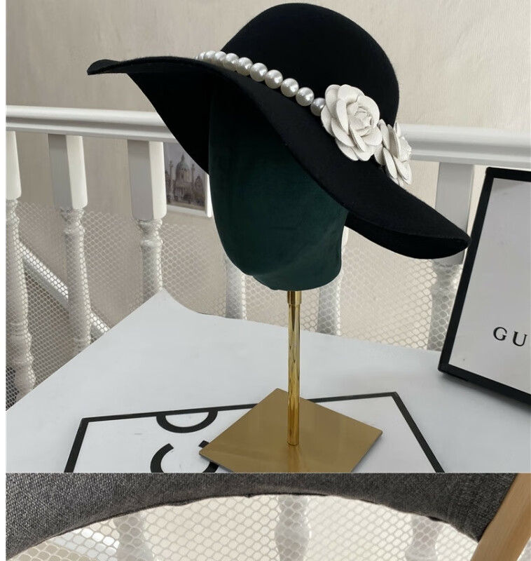 Gisela Hepburn style hat French black big brimmed hat Elegant retro Hepburn style British pearl big brimmed hat Model basic same style (suede) diameter 40cm S (54-58cm)