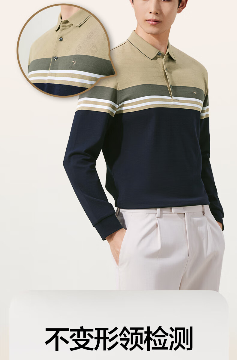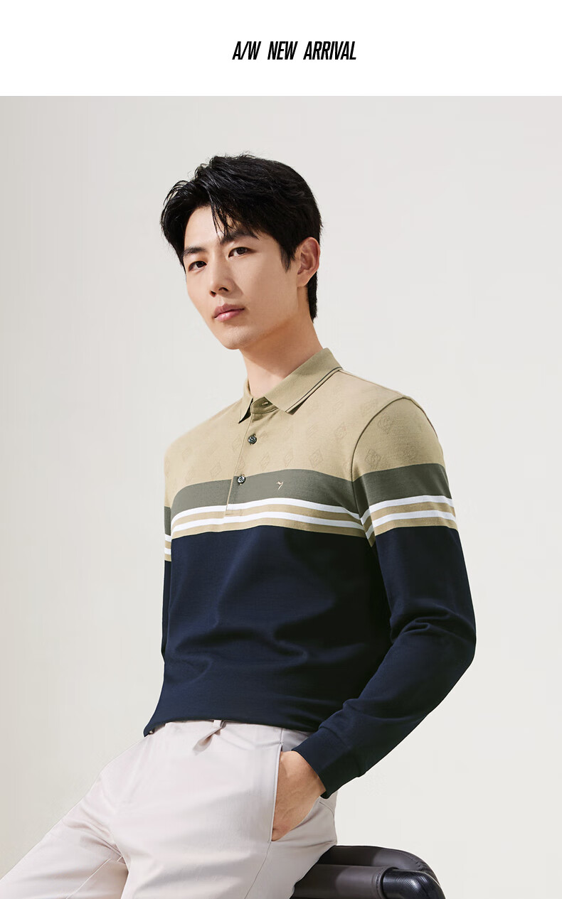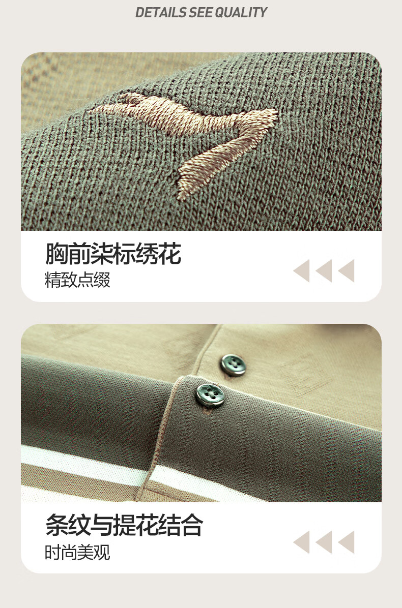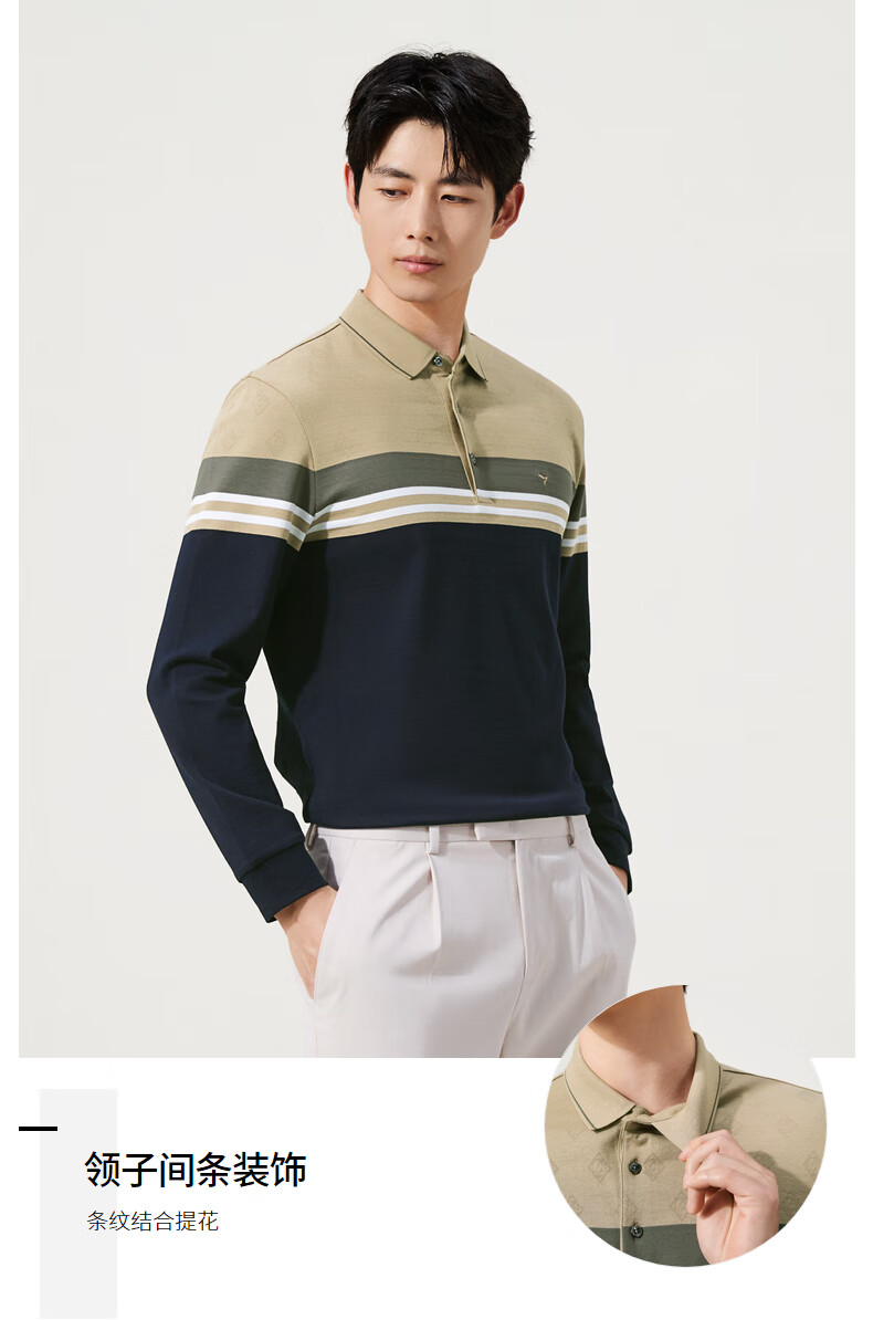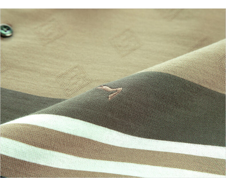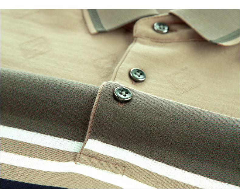 Qipai striped polo shirt/non-deformable collar polo shirt men's long-sleeved autumn business versatile lapel T-shirt khaki L