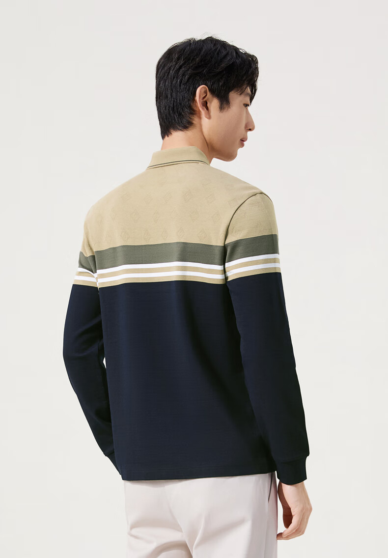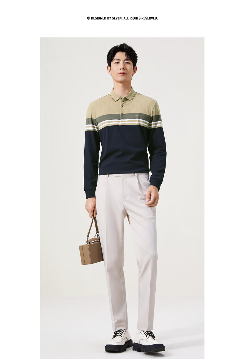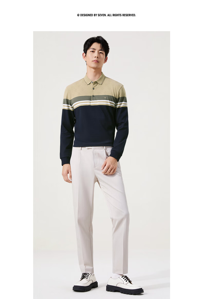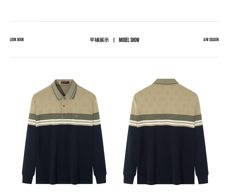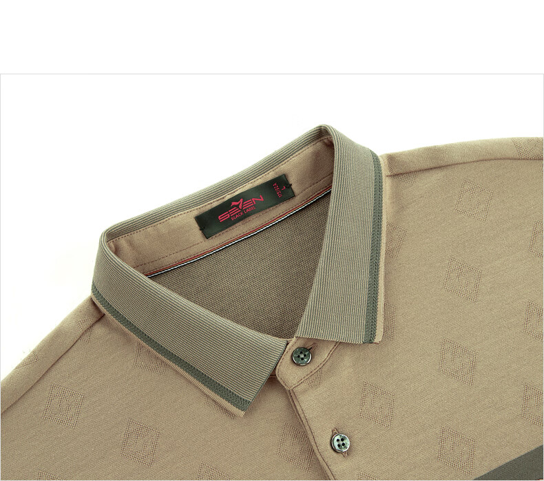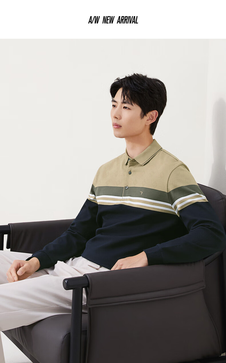 Qipai striped polo shirt/non-deformable collar polo shirt men's long-sleeved autumn business versatile lapel T-shirt khaki L