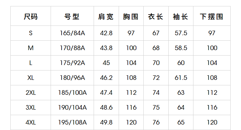 China (cm) 165 / 88-90 170 / 96-98 175 / 108-110 180 / 118-122 185 / 126-130