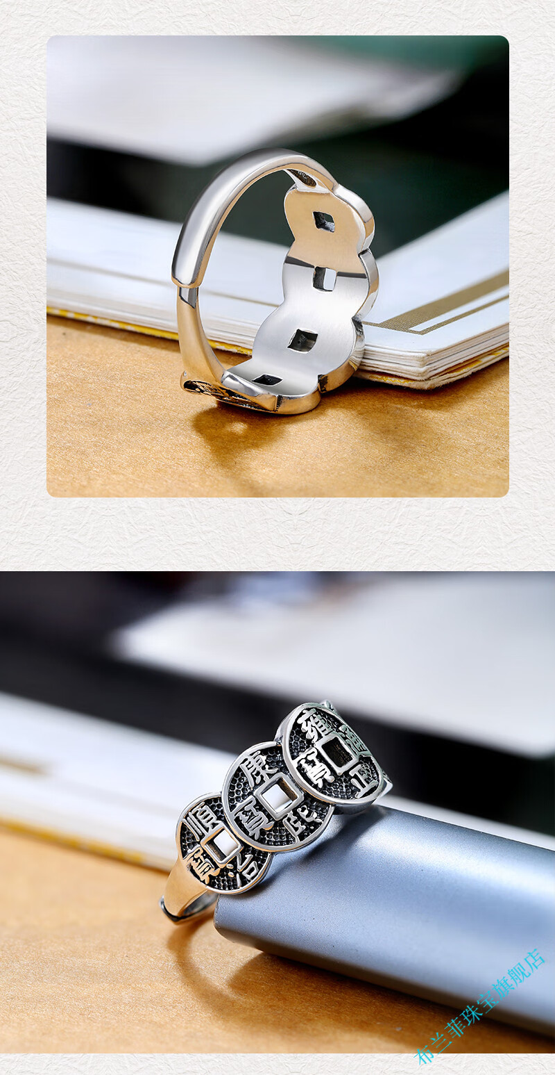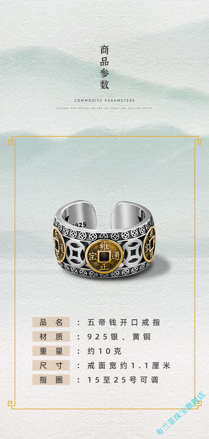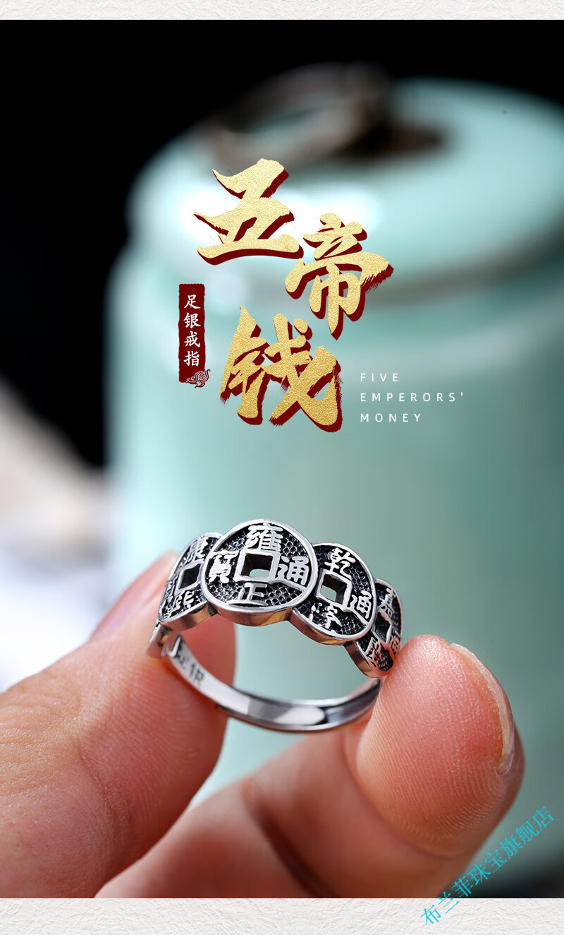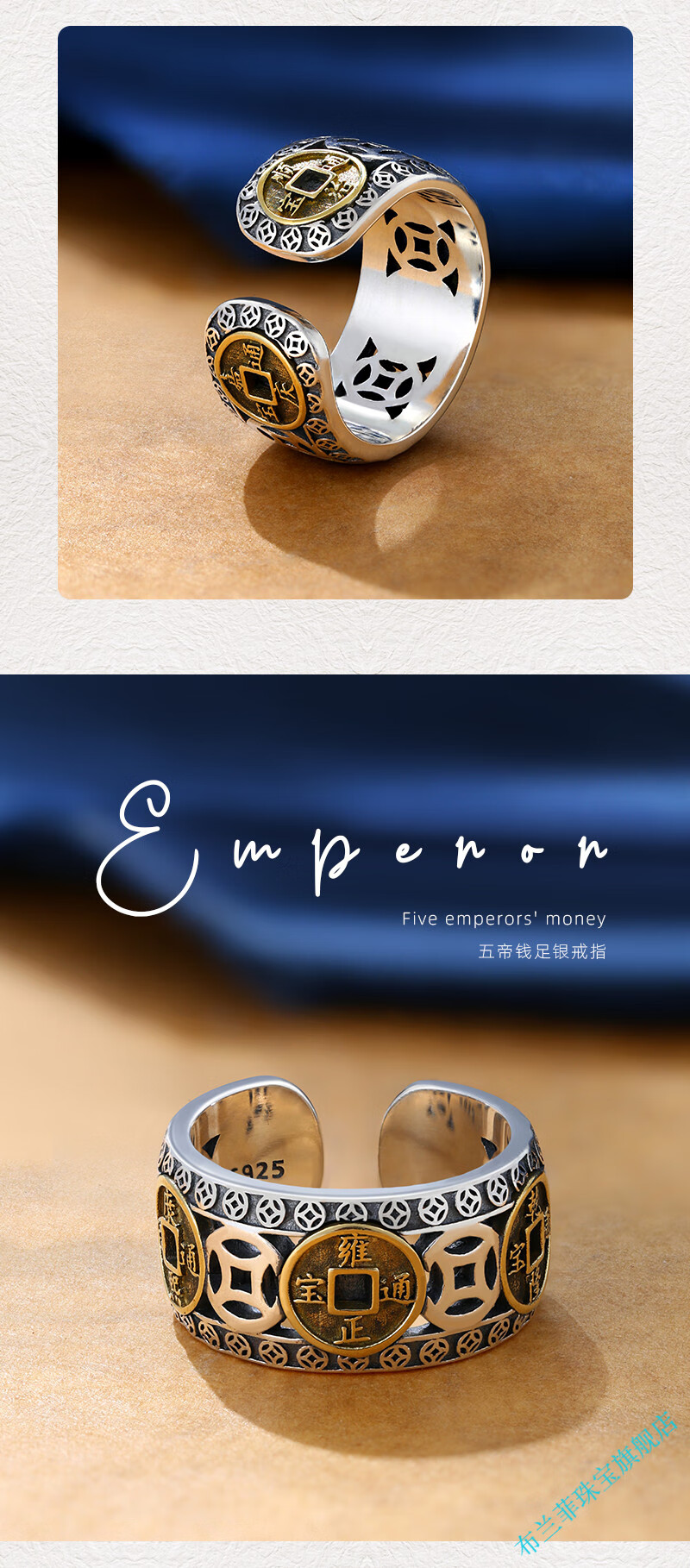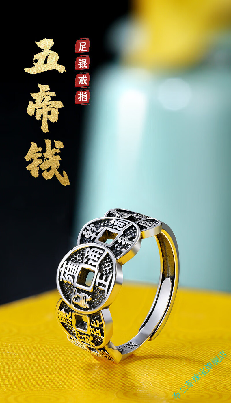 Xinheming Men's Ring Five Emperors Money Solid Color Silver Coins Silver Jewelry Thai Silver Men's and Women's Index Finger Ancient Style National Trend Personality 99 Pure Silver 925 Silver Gold Color Five Emperors Money Small Open Ring About 1