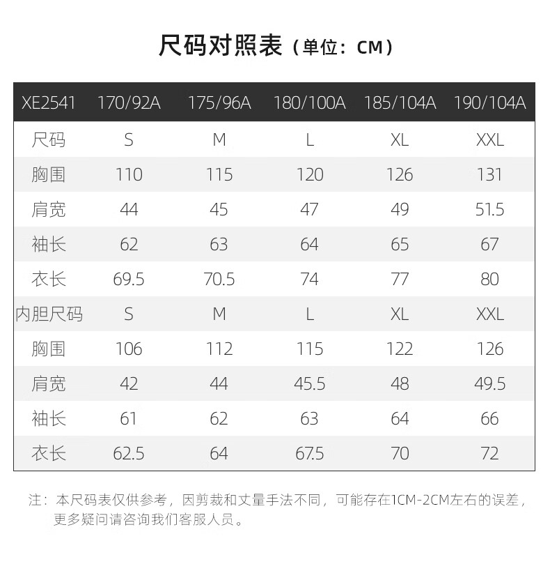 China (cm) 165 / 88-90 170 / 96-98 175 / 108-110 180 / 118-122 185 / 126-130