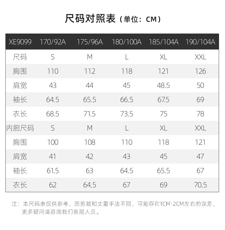 China (cm) 165 / 88-90 170 / 96-98 175 / 108-110 180 / 118-122 185 / 126-130