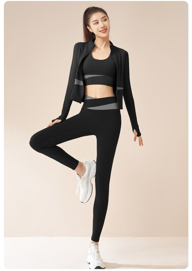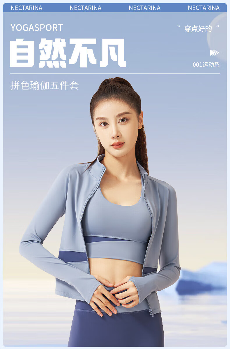 Fluniyou yoga wear women's sports suit women's five-piece color matching fitness suit running breathable quick-drying Pilates shock-proof clothing and pants gray lake blue five-piece suit XL recommended weight 115-130 Jin Jin equals 0.5 kg