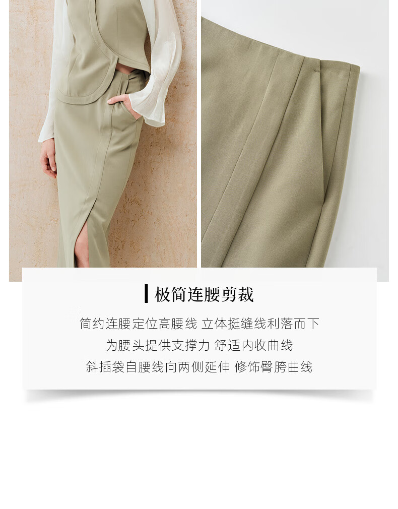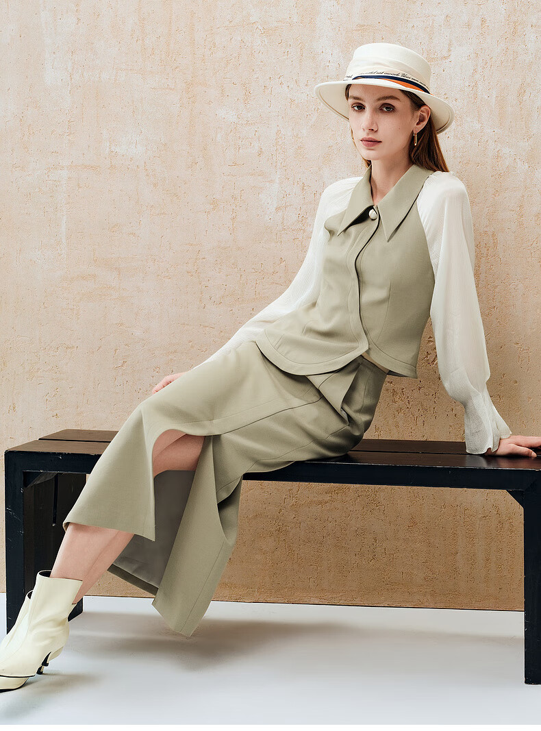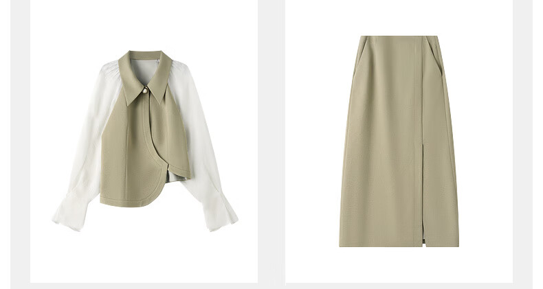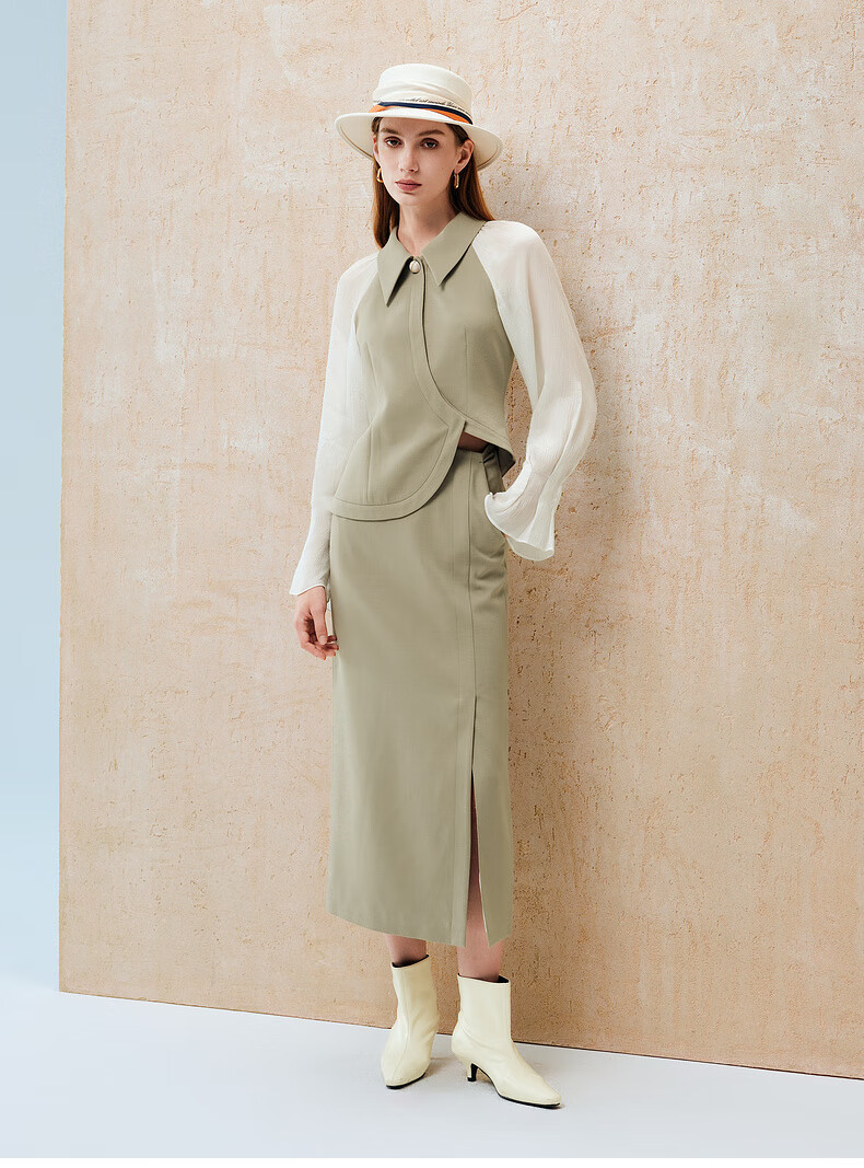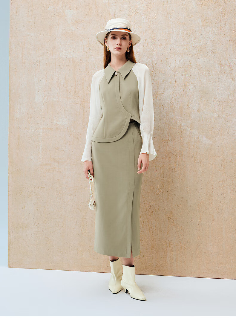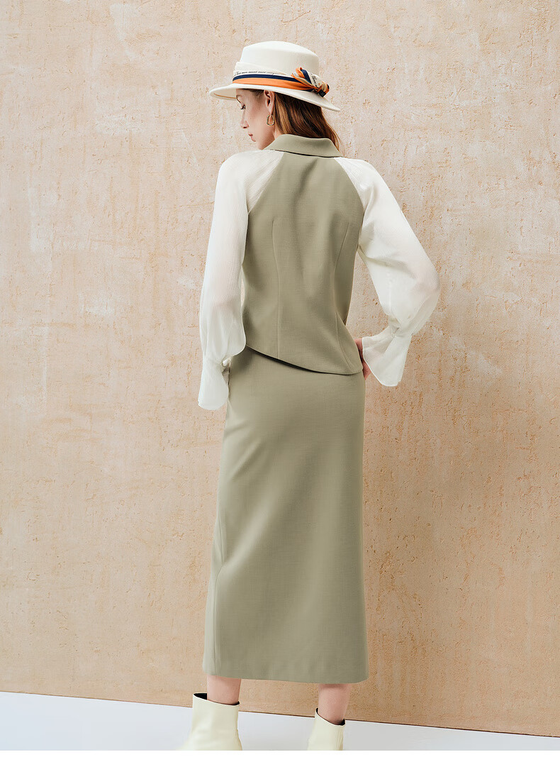 SUSHE Crescent Moon Deconstruction Wool Spliced Sleeve Cropped Top and Waist Straight Skirt Set Licorice Green-Skirt S