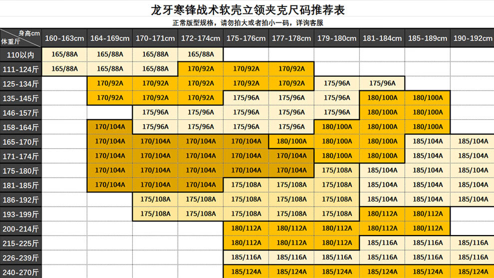 China (cm) 160-165/84-86 165-170 / 88-90 167-172 / 92-96 168-173 / 98-102 170-176 / 106-110
