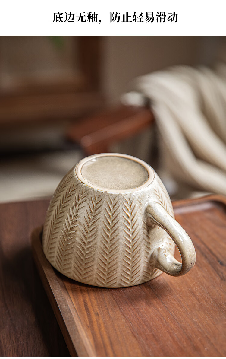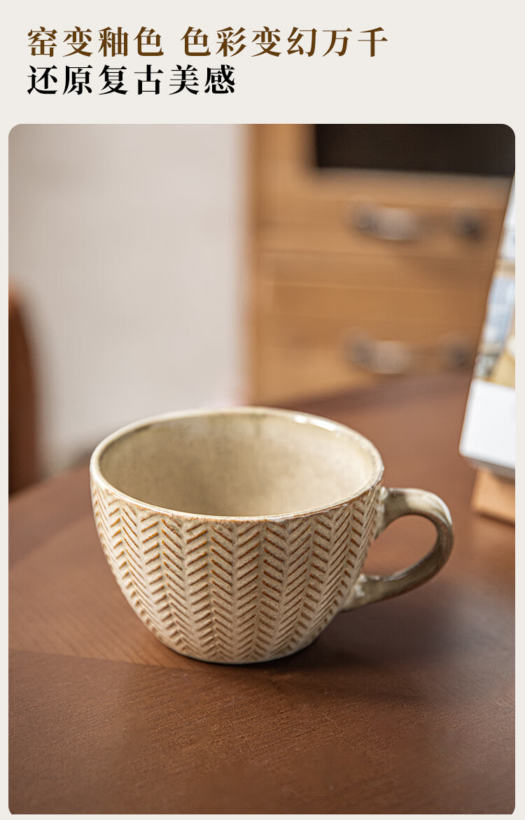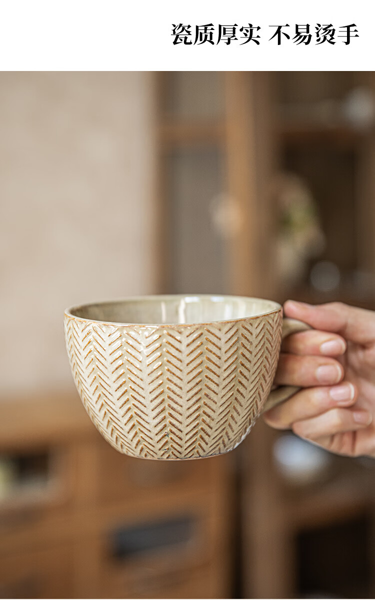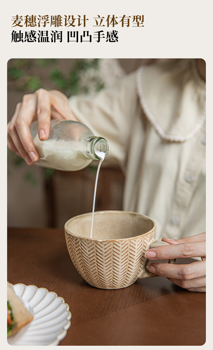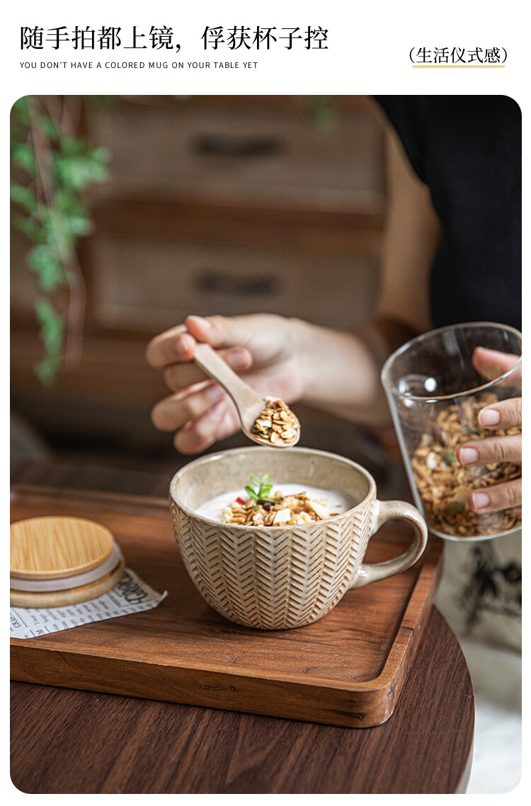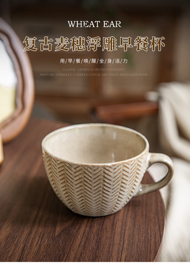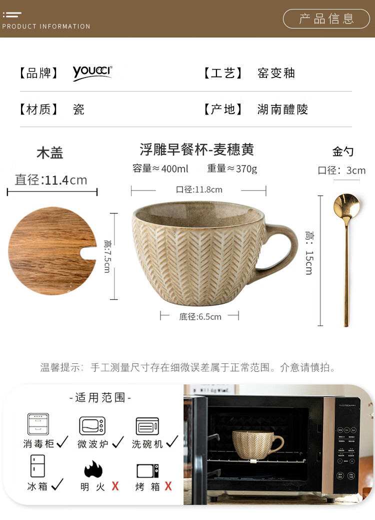 Youcci high-looking embossed ceramic cup oatmeal cup personalized kiln-turned mug retro cup coffee cup household water cup embossed breakfast cup - wheat ear yellow covered spoon