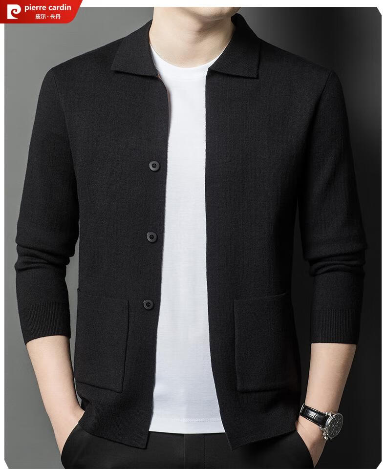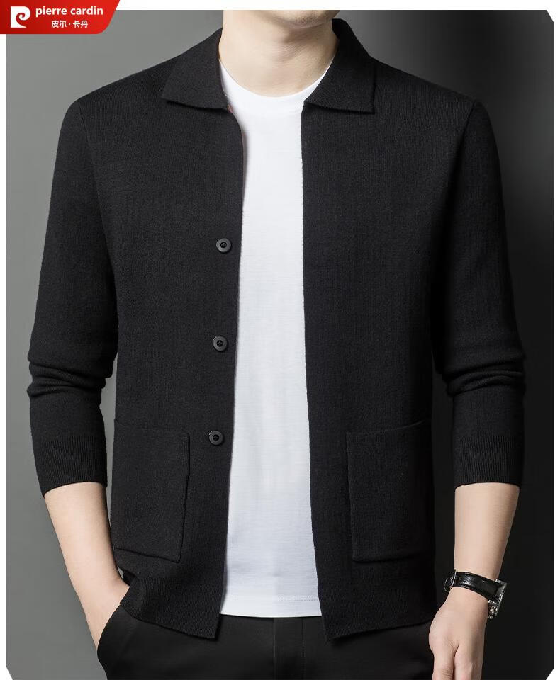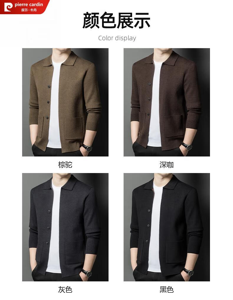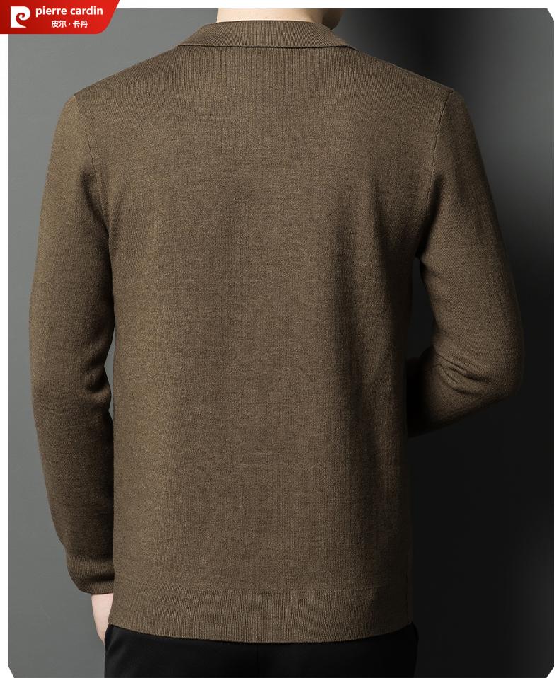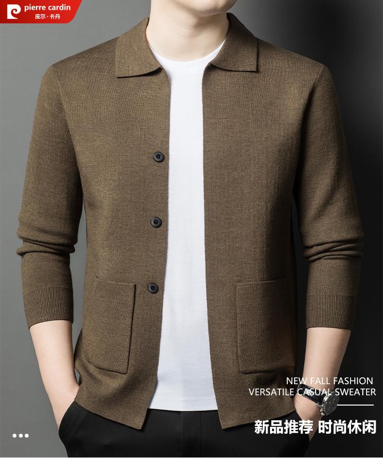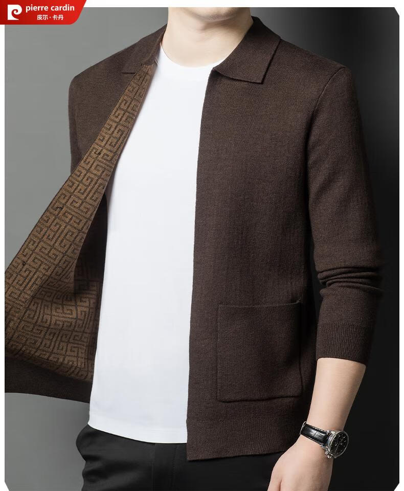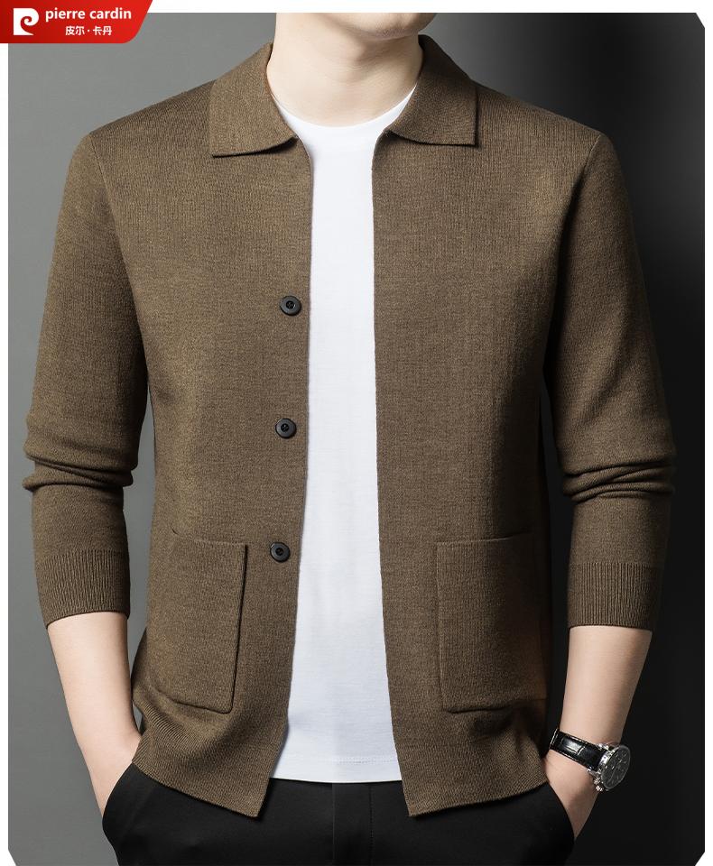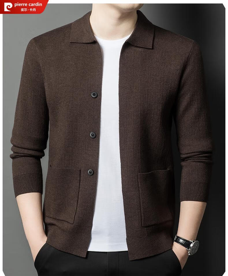 Pierre Cardin 100% pure wool cardigan men's cardigan spring and autumn thin lapel knitted sweater middle-aged pocket coat for men Brown Camel XL 175 recommended weight 135-155Jin Jin equals 0.5 kg