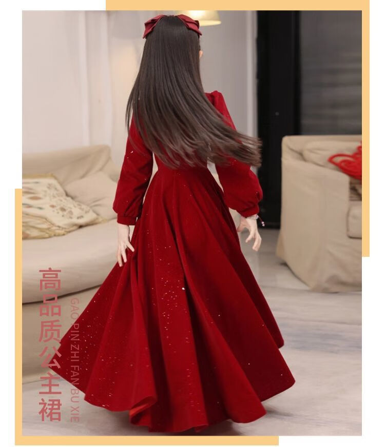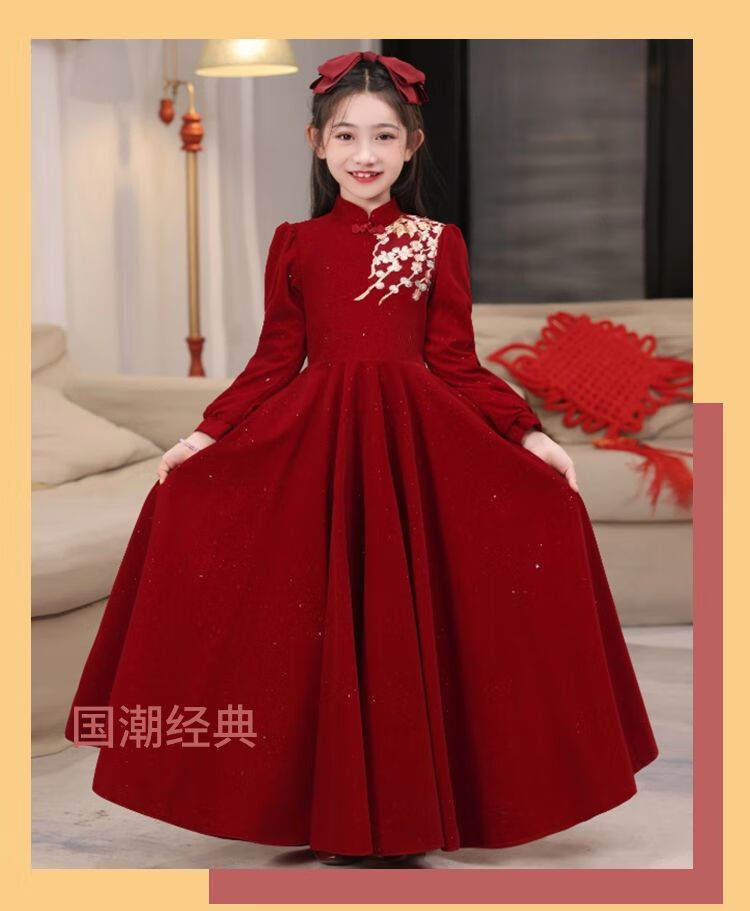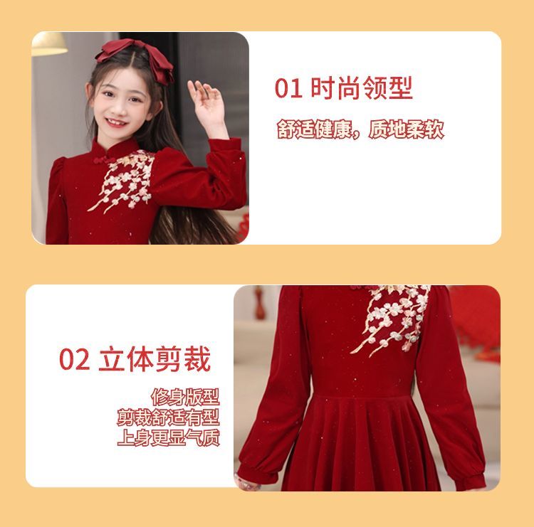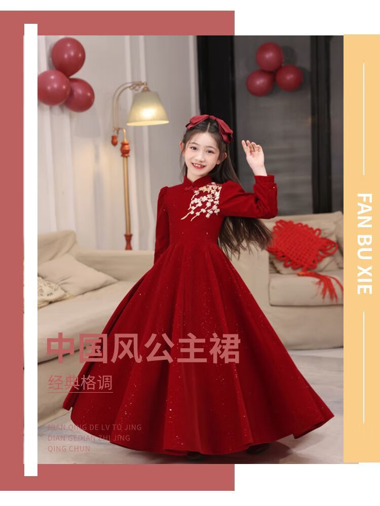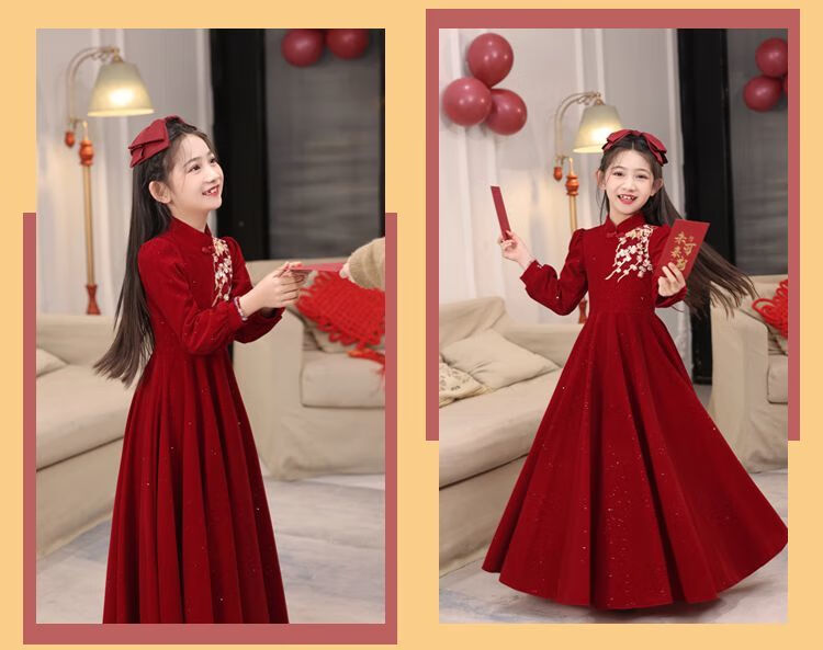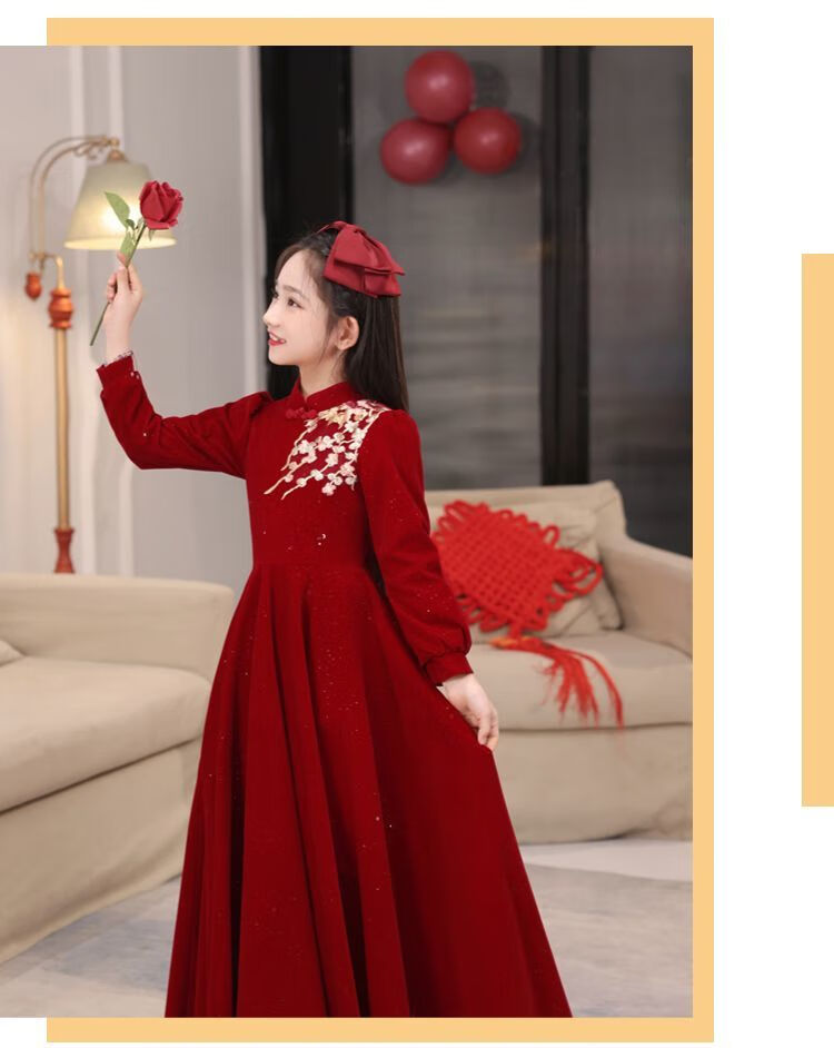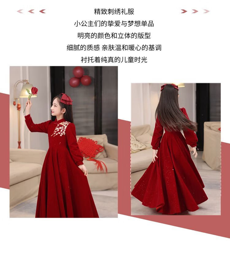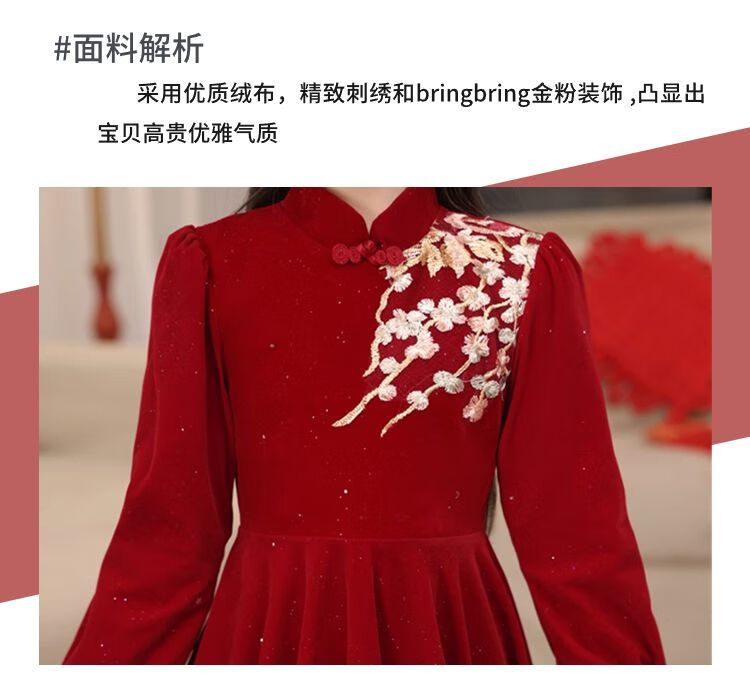 Disney Girls Dress Long Sleeve Dress 2025 Autumn and Winter New Medium and Large Children's Clothing Red New Year Style Embroidered Long Dress Red Velvet Style 150 (Upgraded Style)