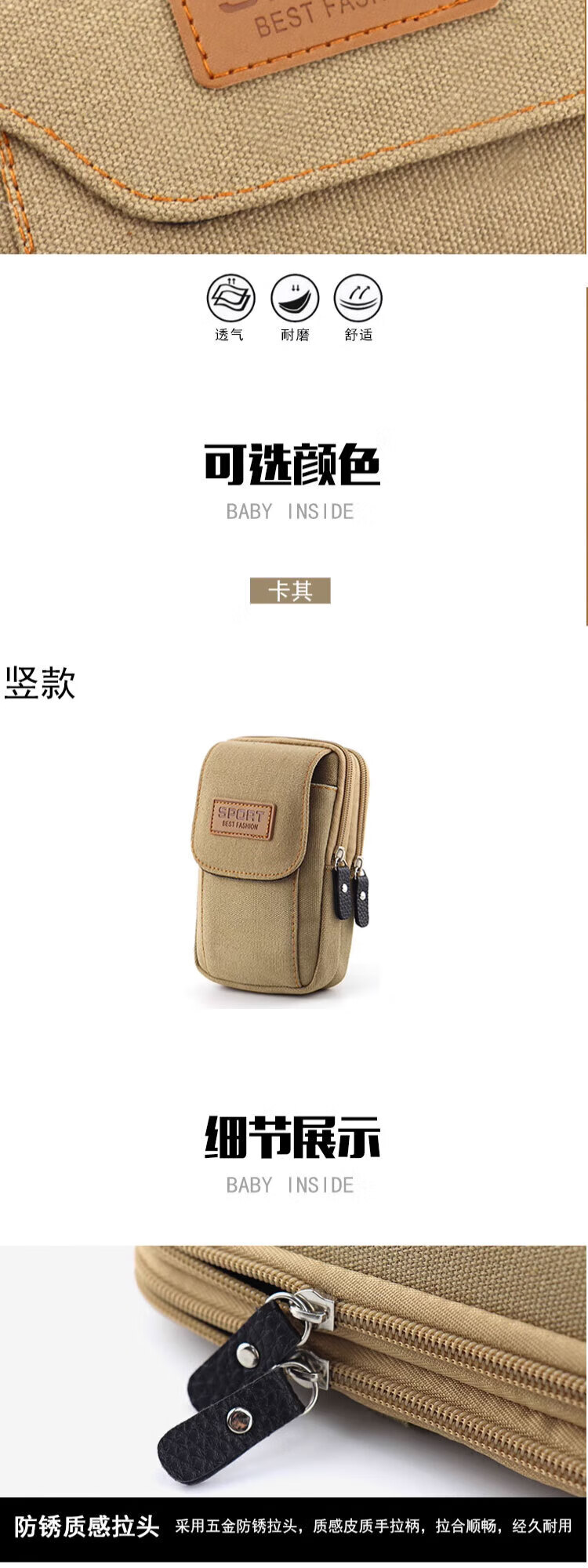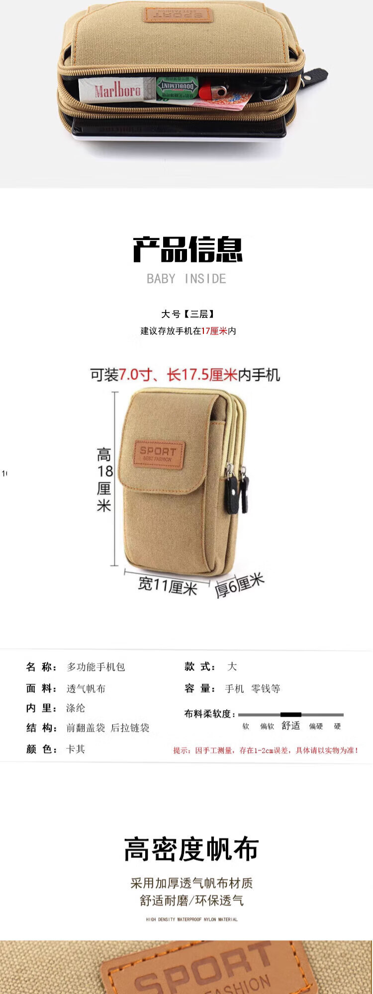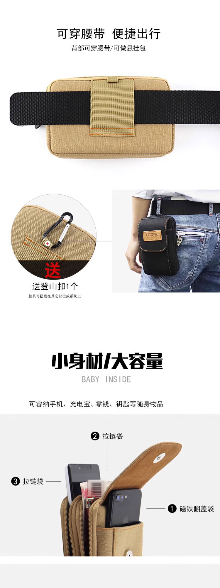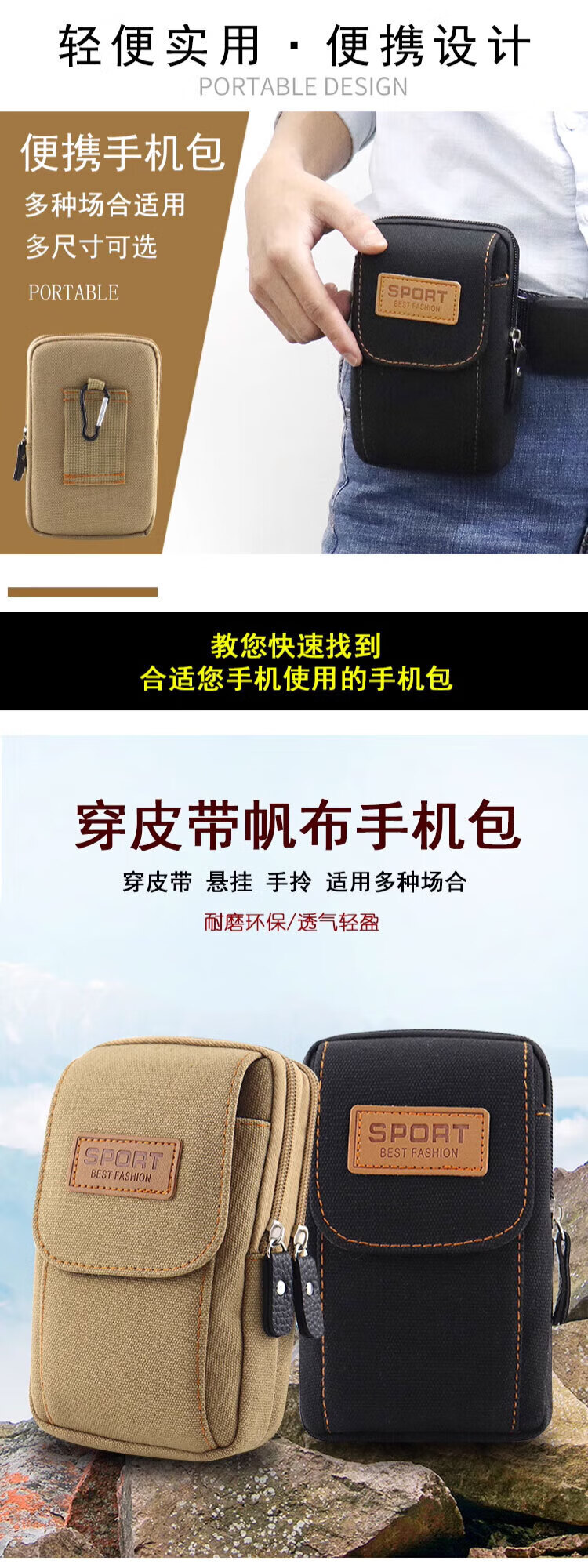 Shantou Lincun canvas mobile phone bag men's mobile phone bag wear belt mobile phone case horizontal and vertical wear-resistant sports waist hanging construction site work waist bag khaki color with carabiner