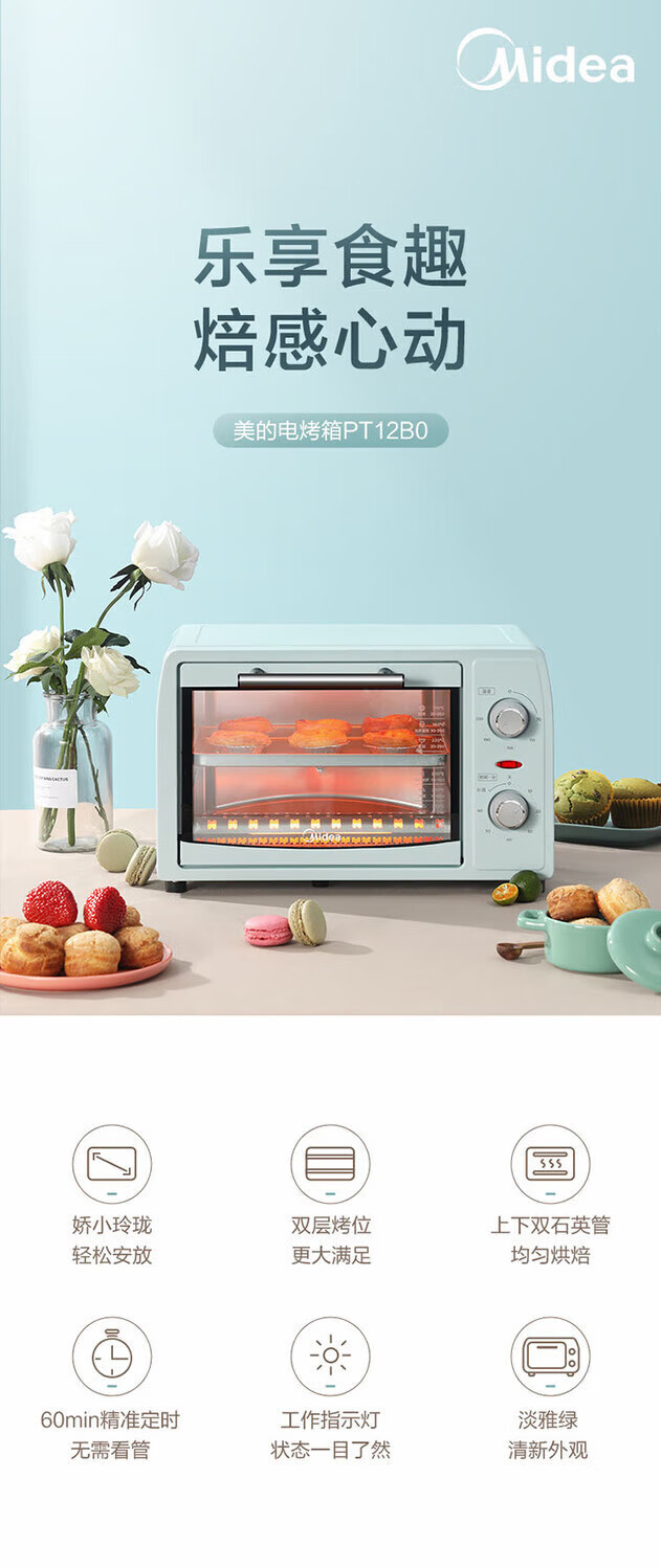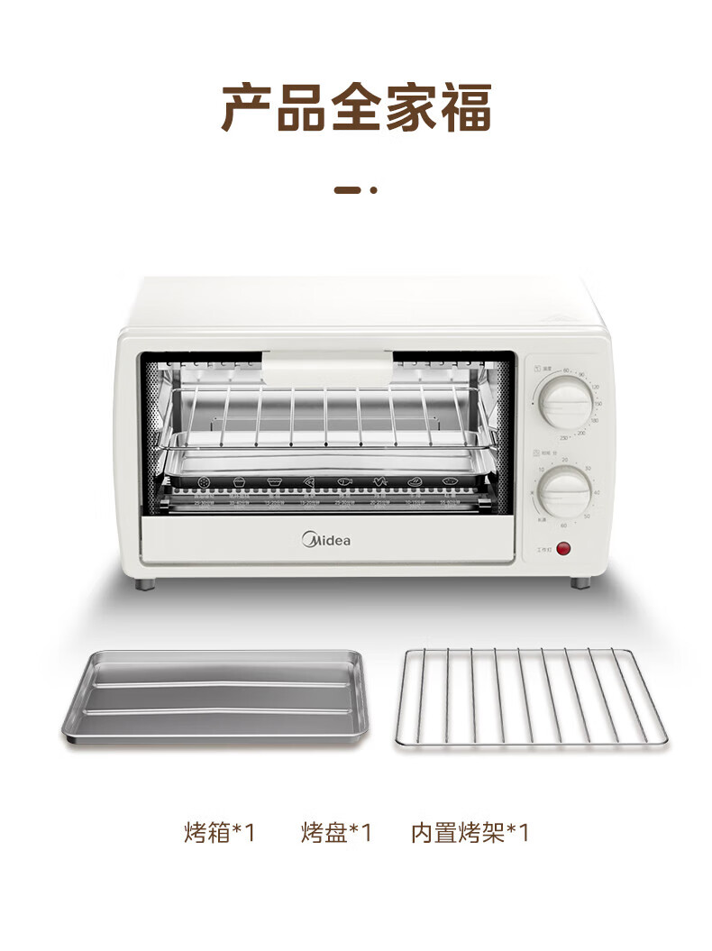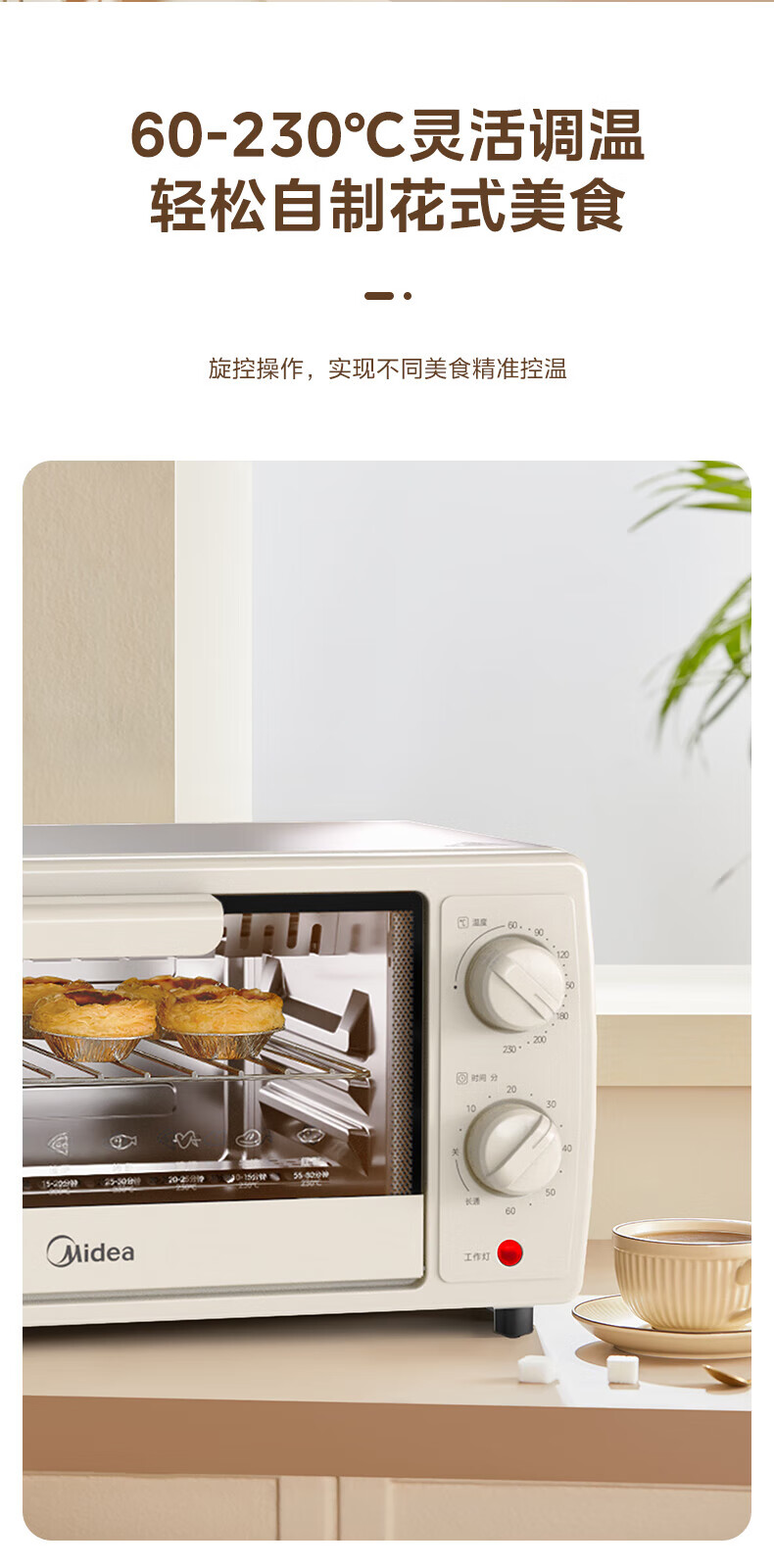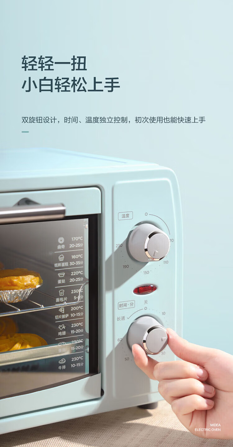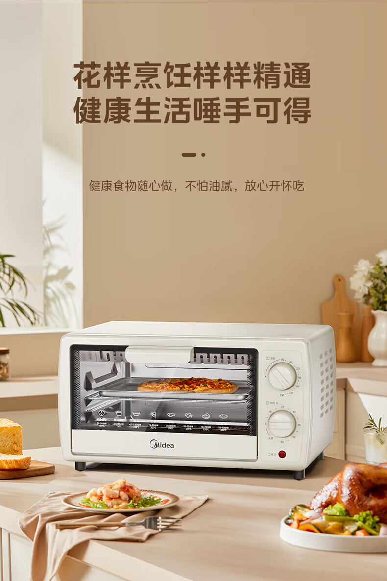 Midea household multifunctional electric oven with mechanical control, professional baking, easy operation, baking cakes and breads PT12X3, hot air baking and frying 12L