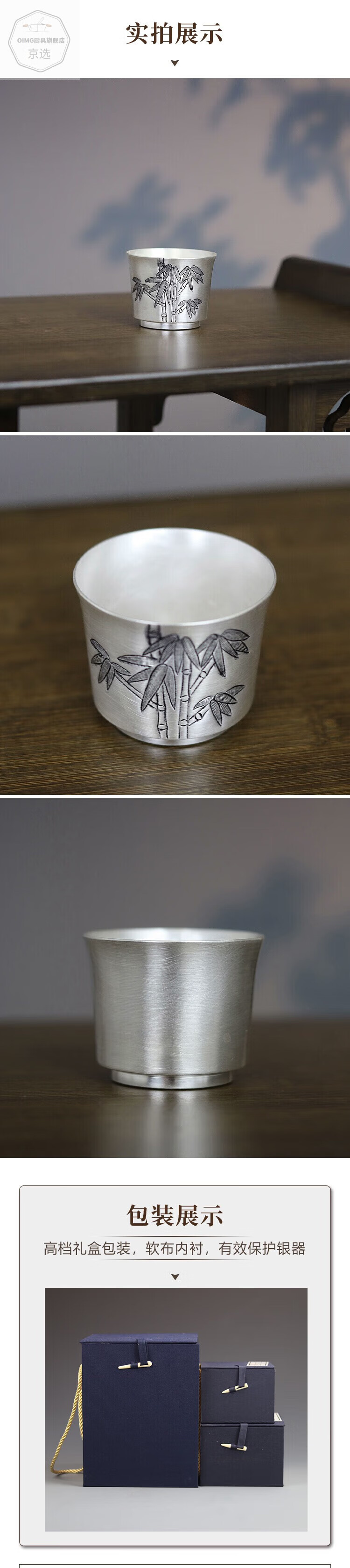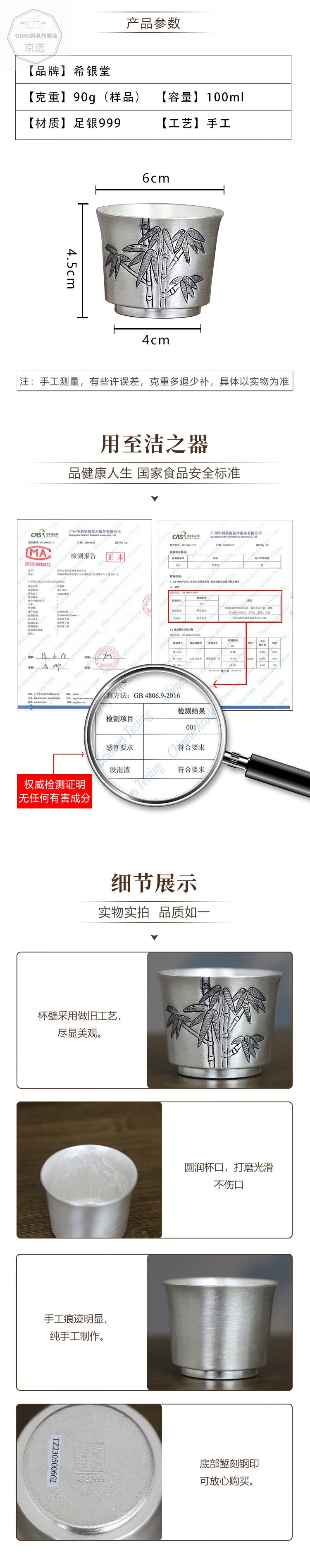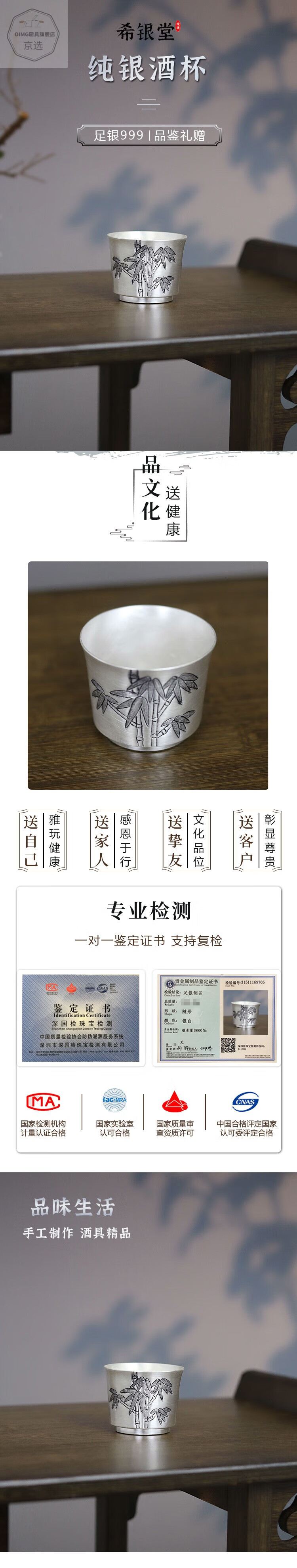 ZHIO flat bottom bamboo wine glass pure silver 999 handmade Chinese style home large wine glass pure silver wine set collection bamboo model 86g