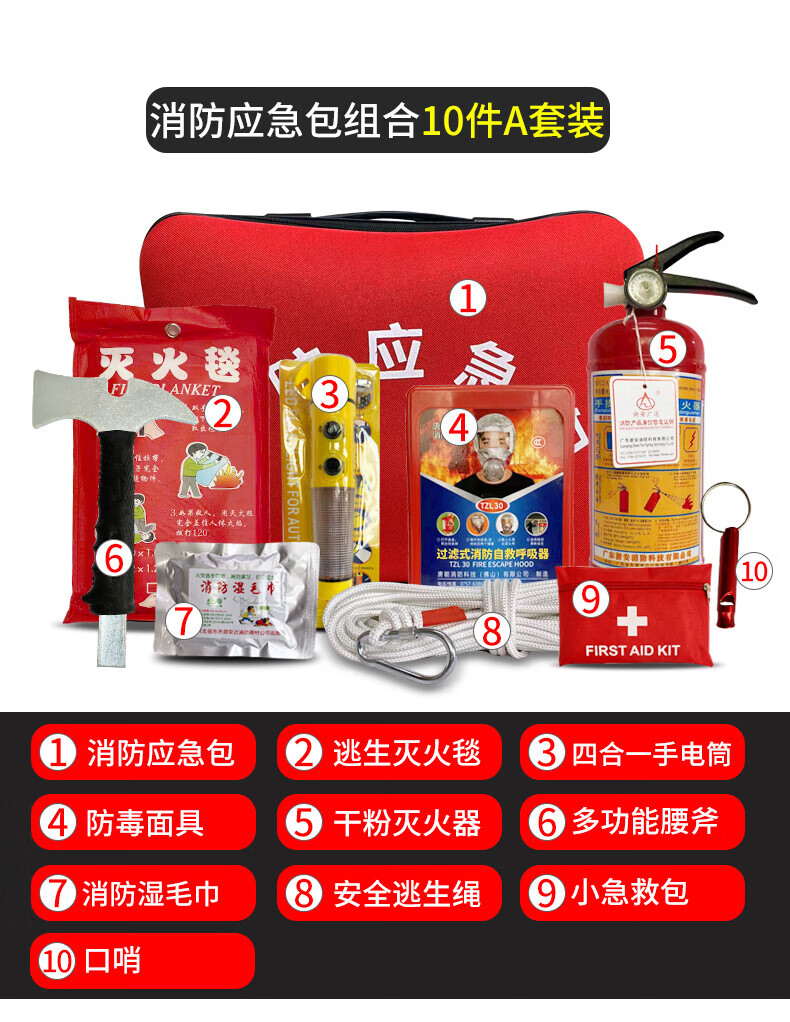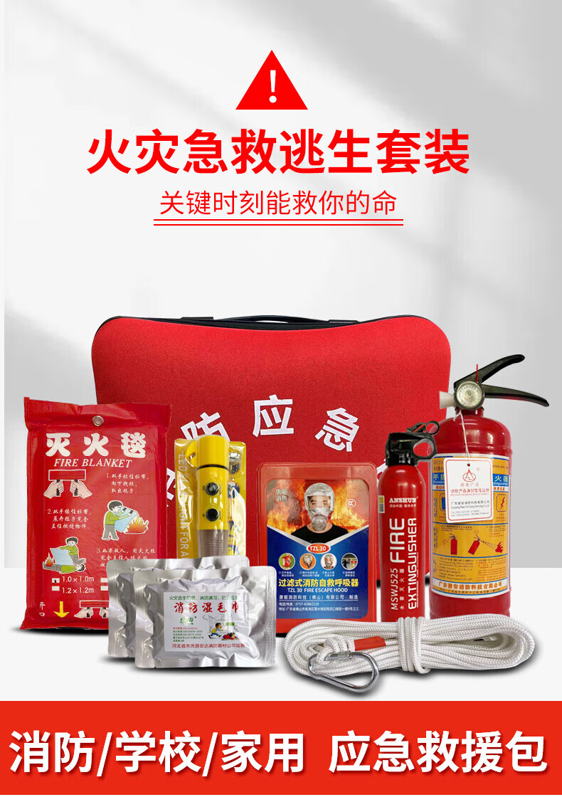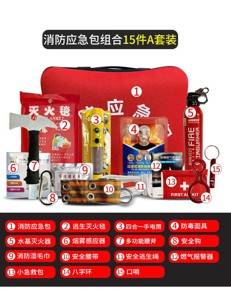 Home fire emergency kit, household fire escape emergency kit, water-based fire extinguisher, 9-piece fire extinguishing blanket, smoke mask, self-rescue set, family four-person model (23-piece set) with water base