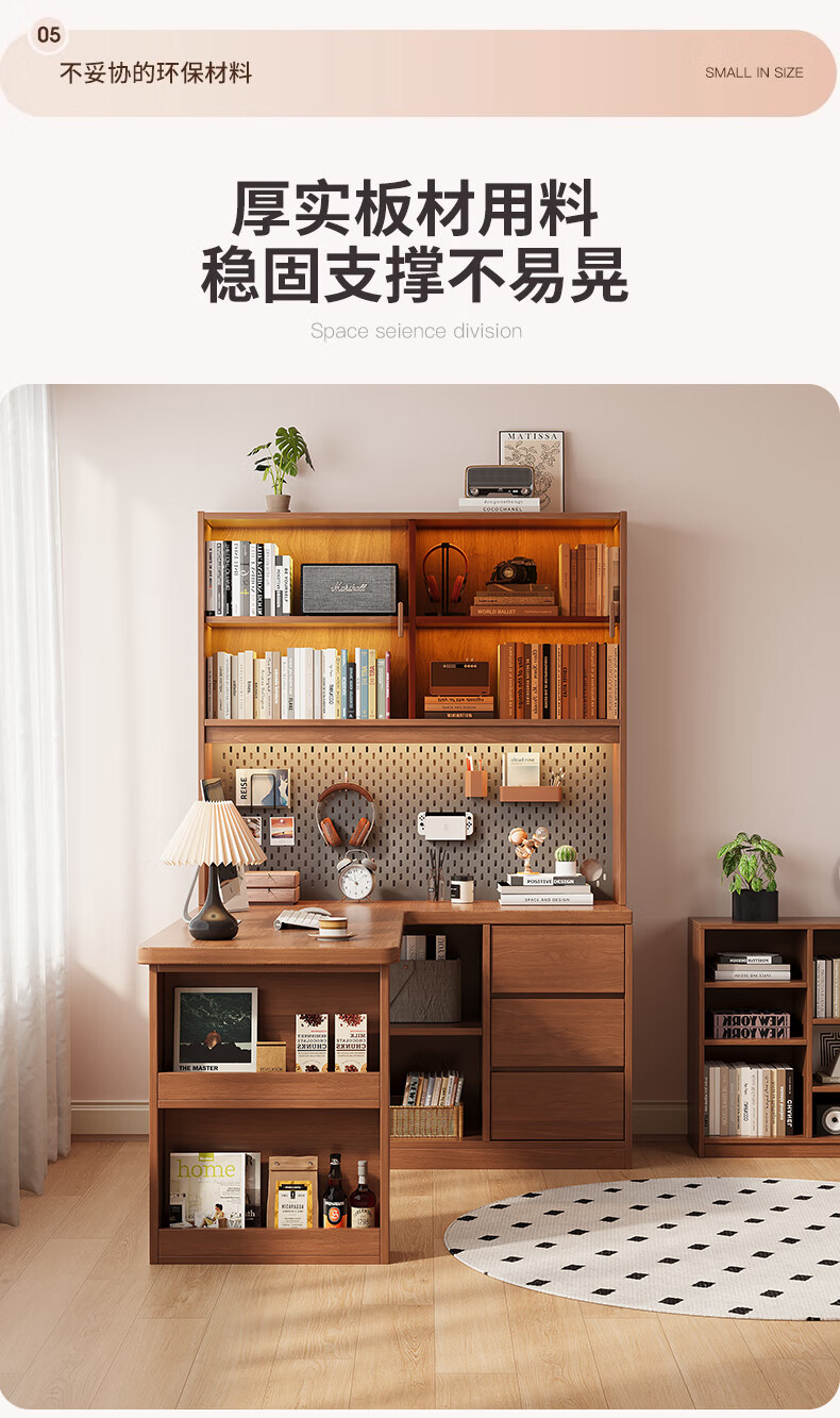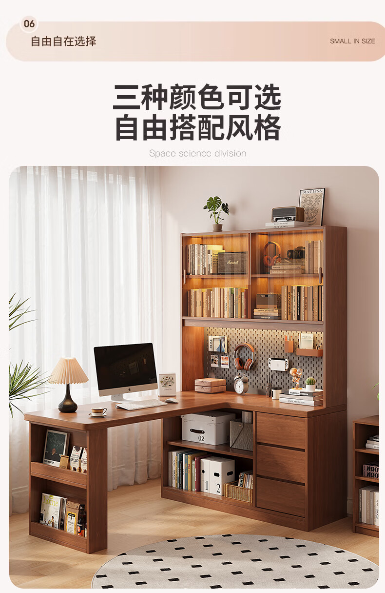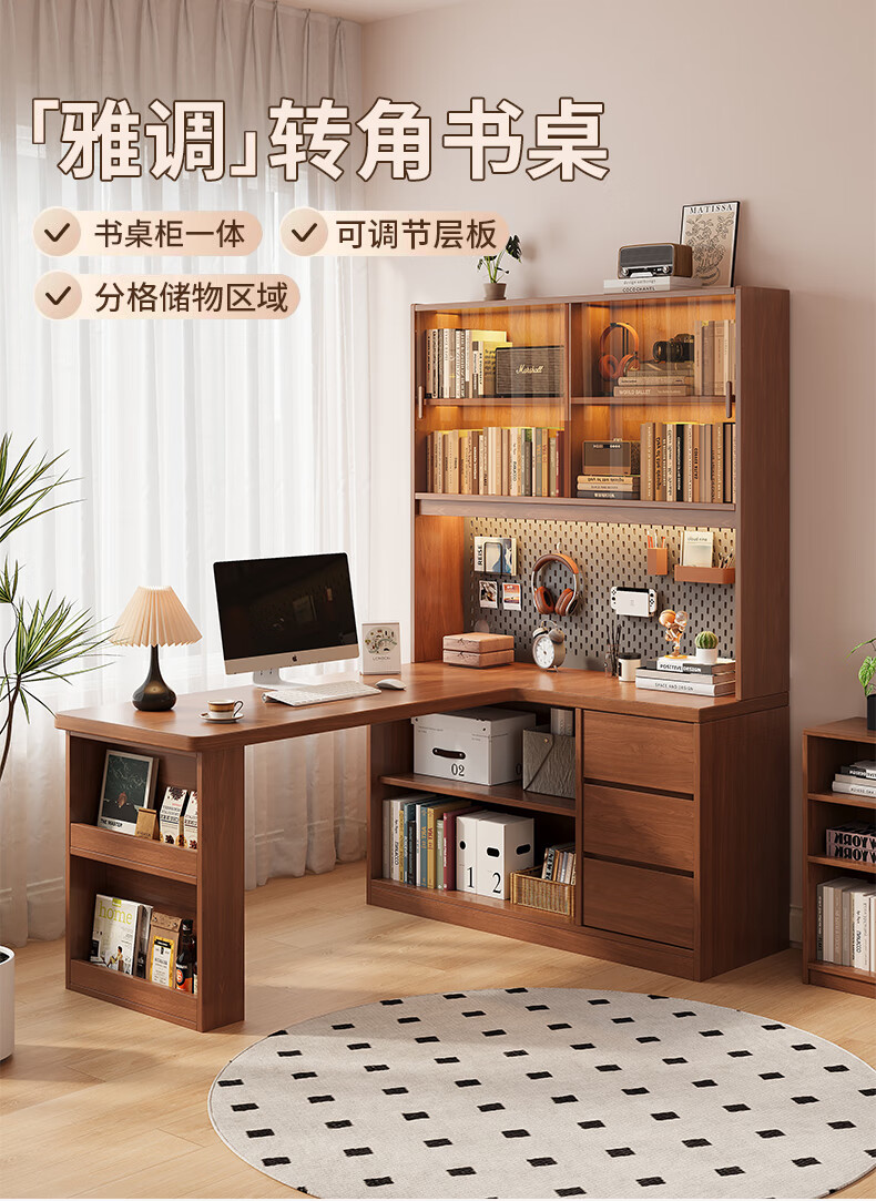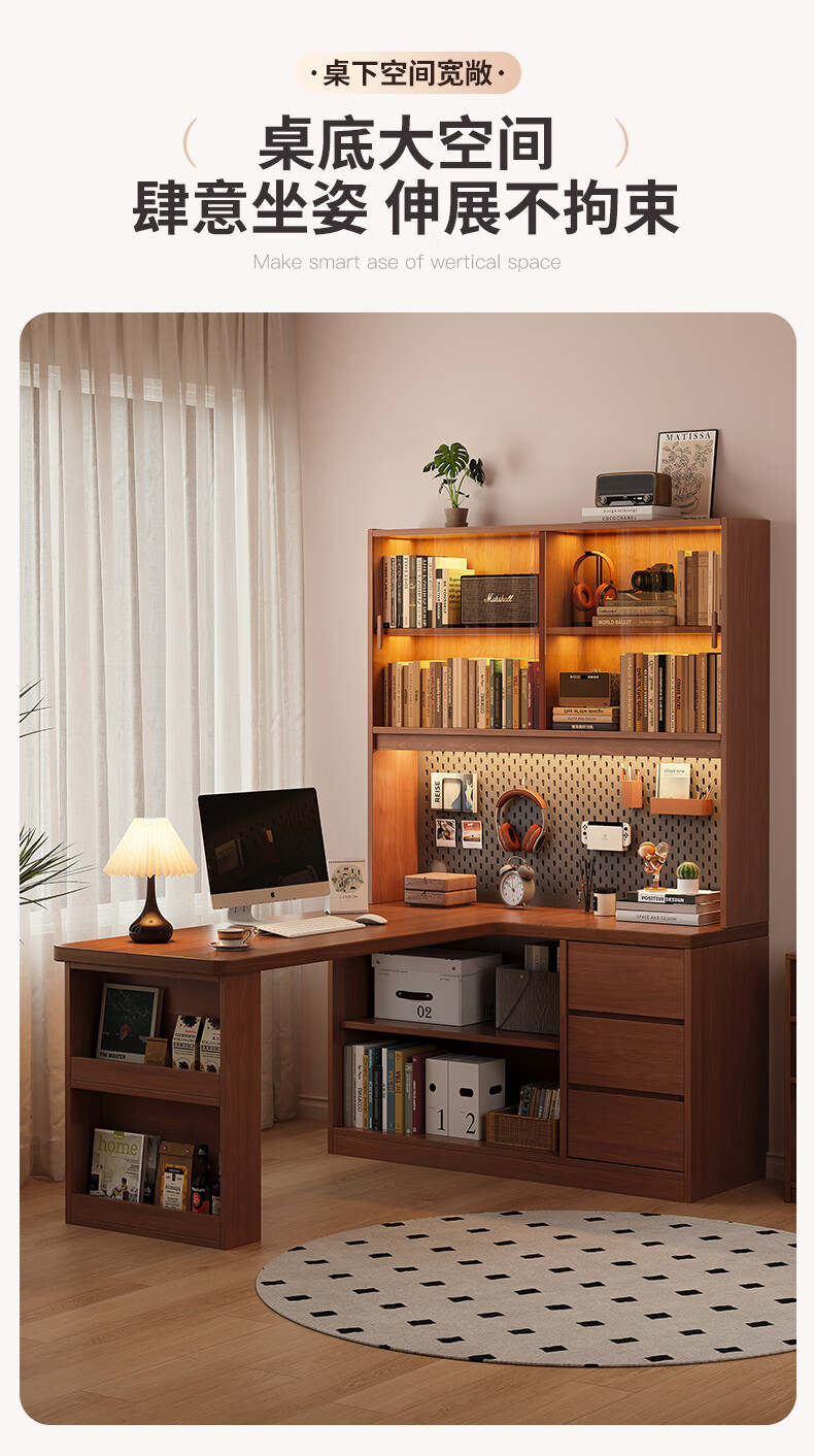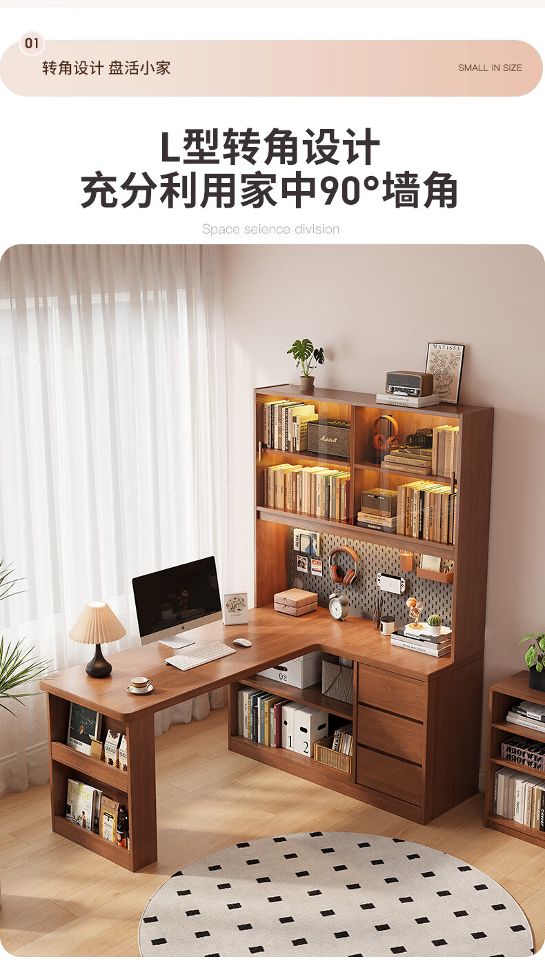 Yimuju solid wood corner desk bookcase bookshelf integrated study desk computer desk writing desk desk desk walnut color 160*100*195cm right bookshelf