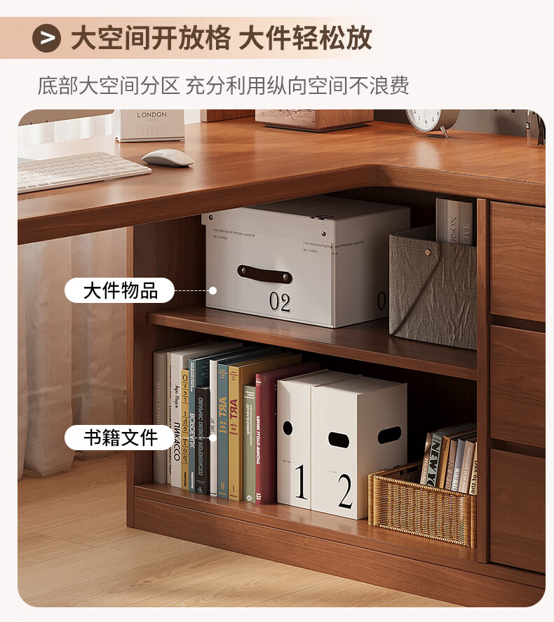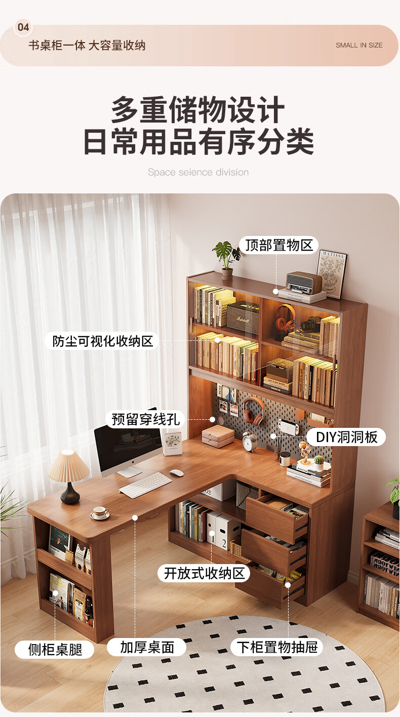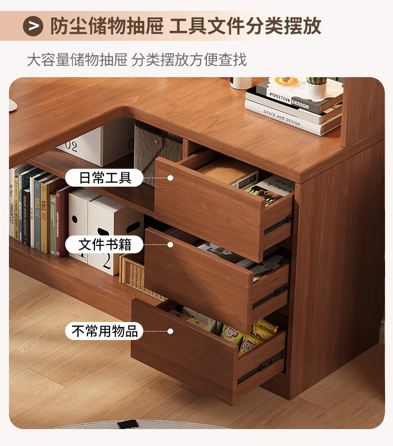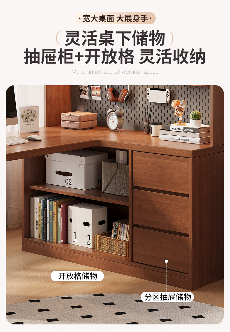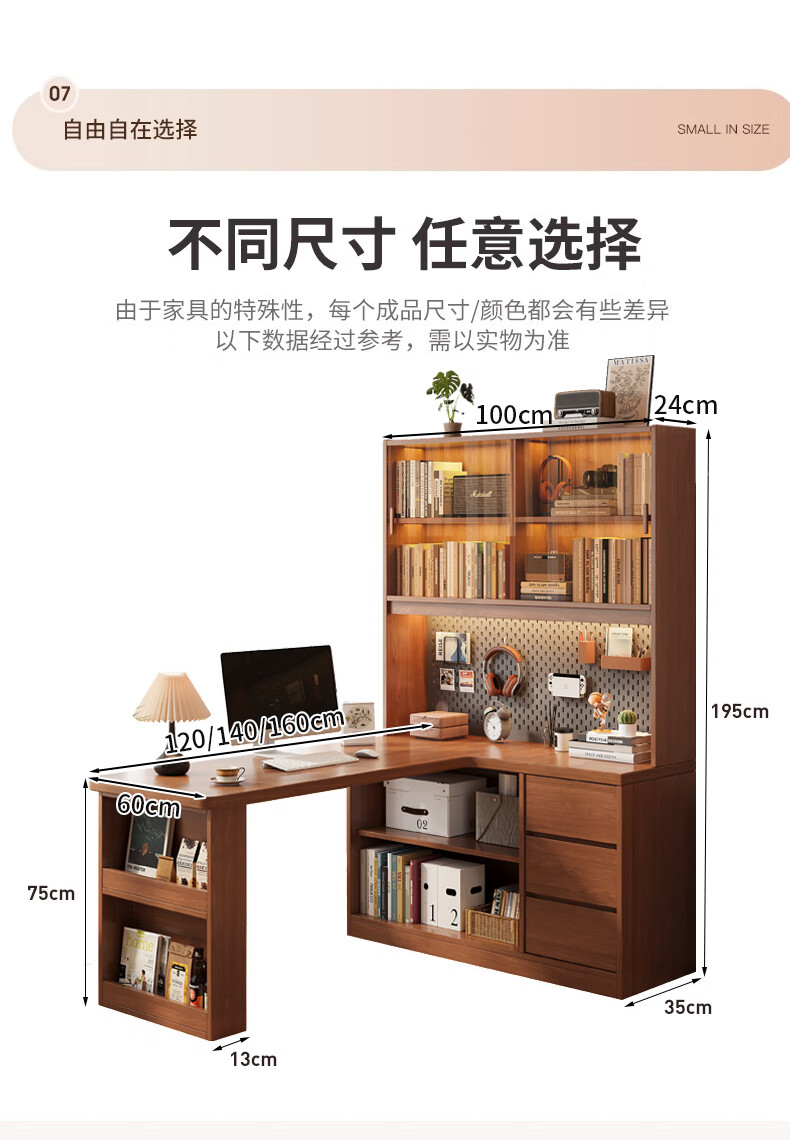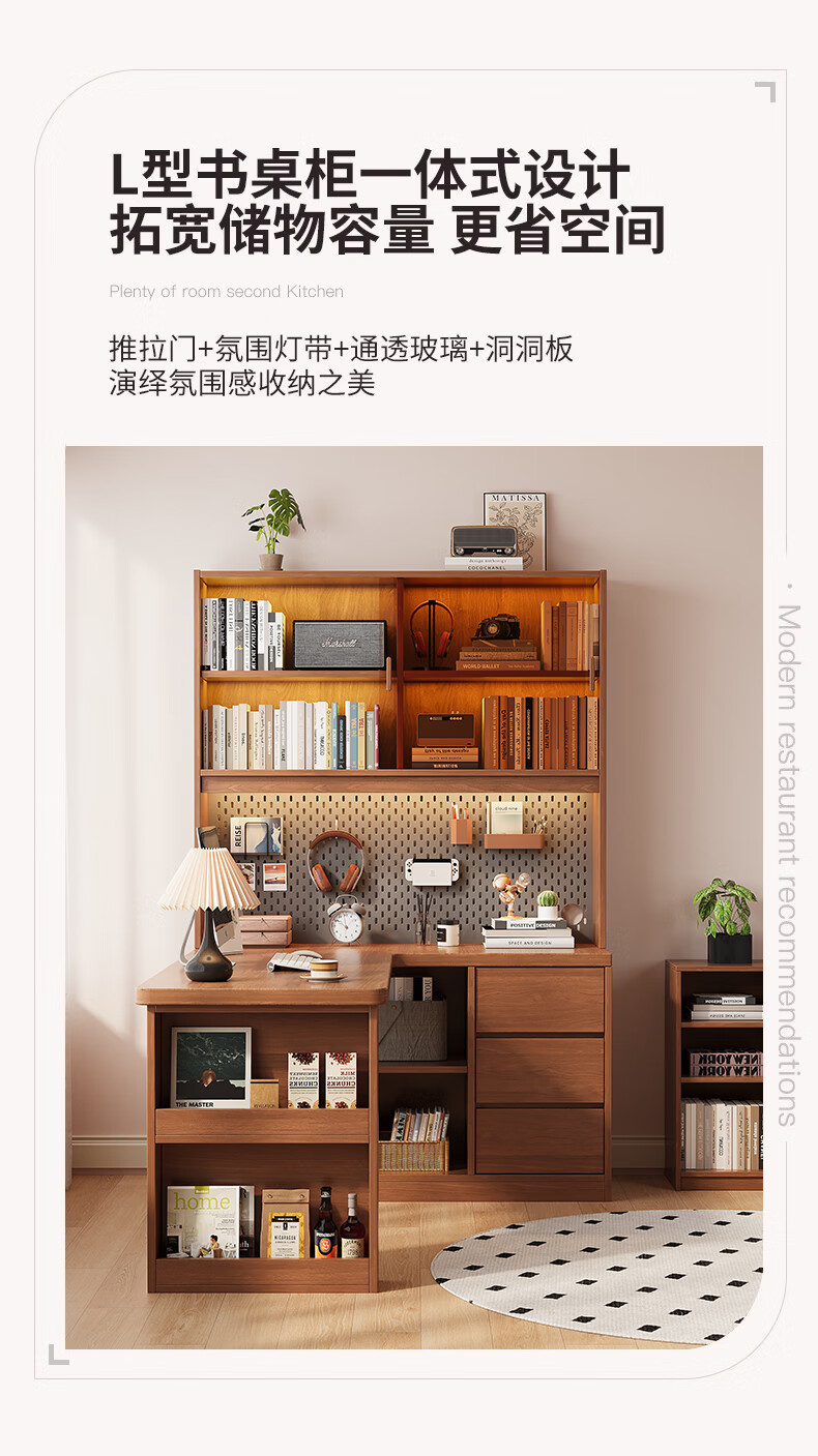 Yimuju solid wood corner desk bookcase bookshelf integrated study desk computer desk writing desk desk desk walnut color 160*100*195cm right bookshelf