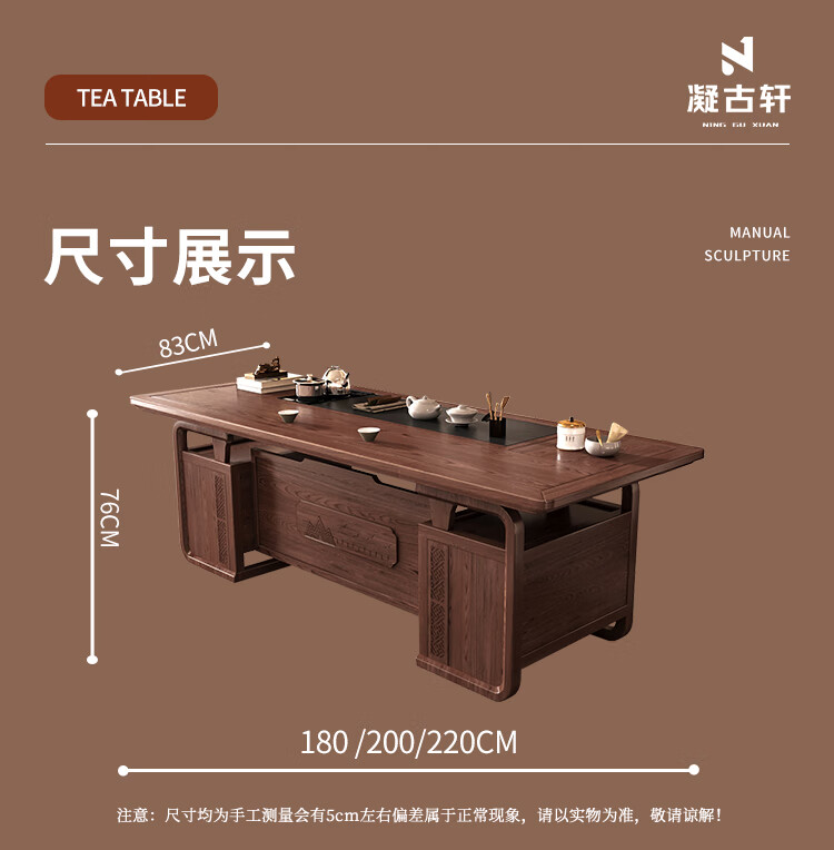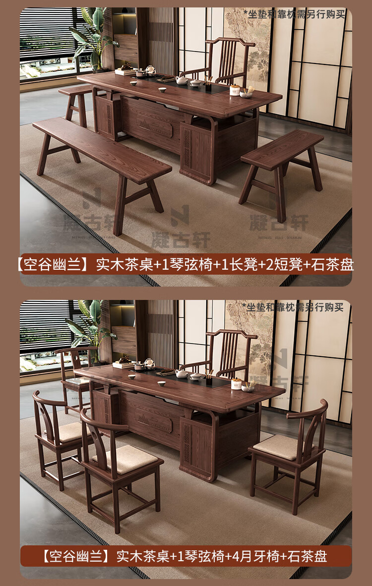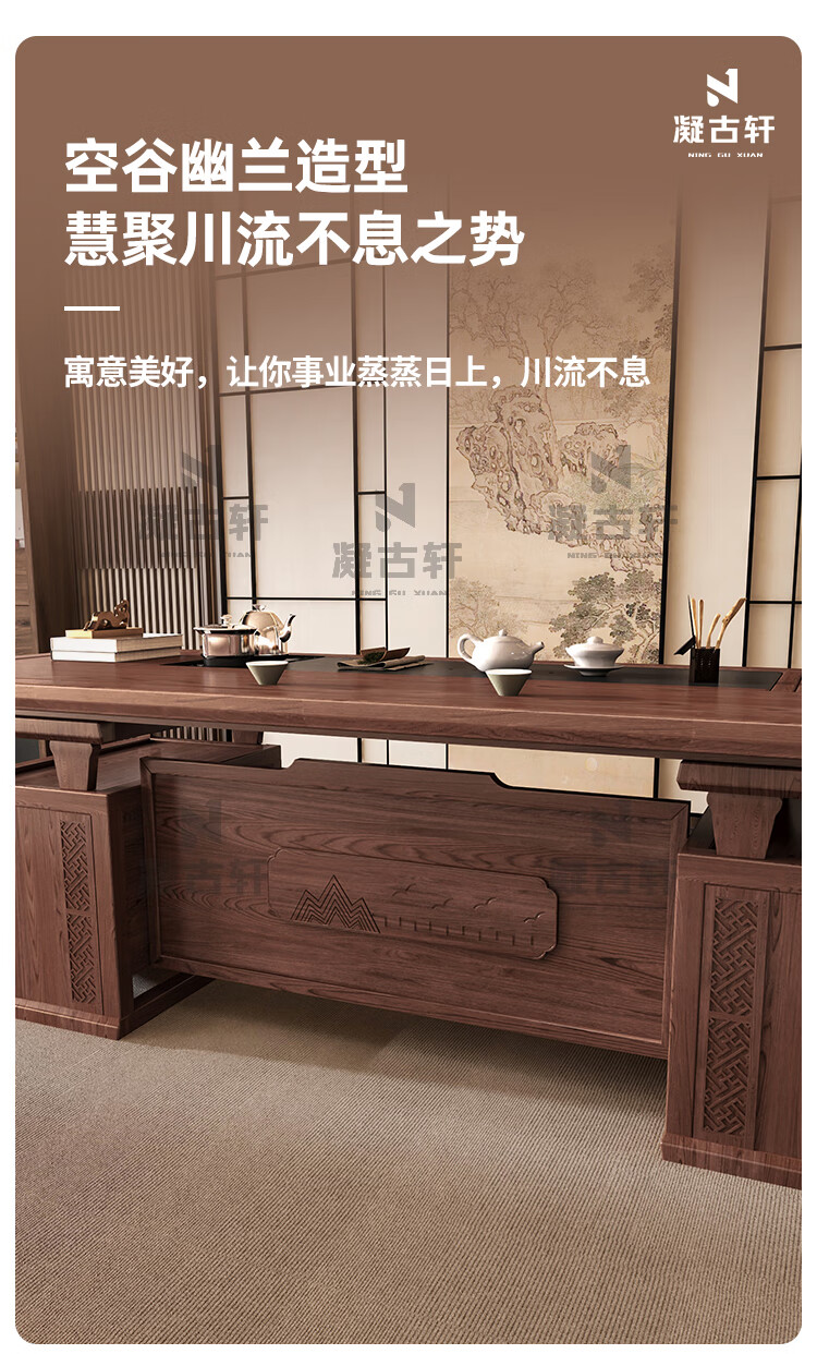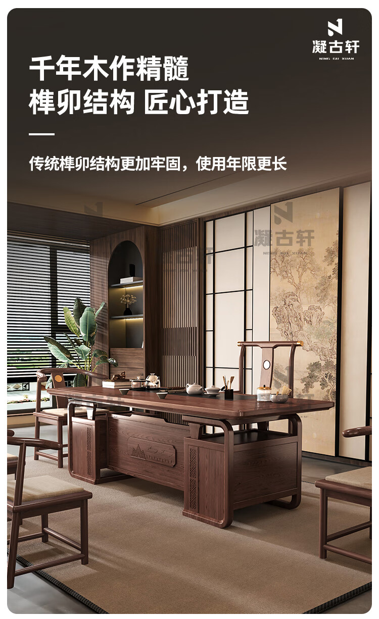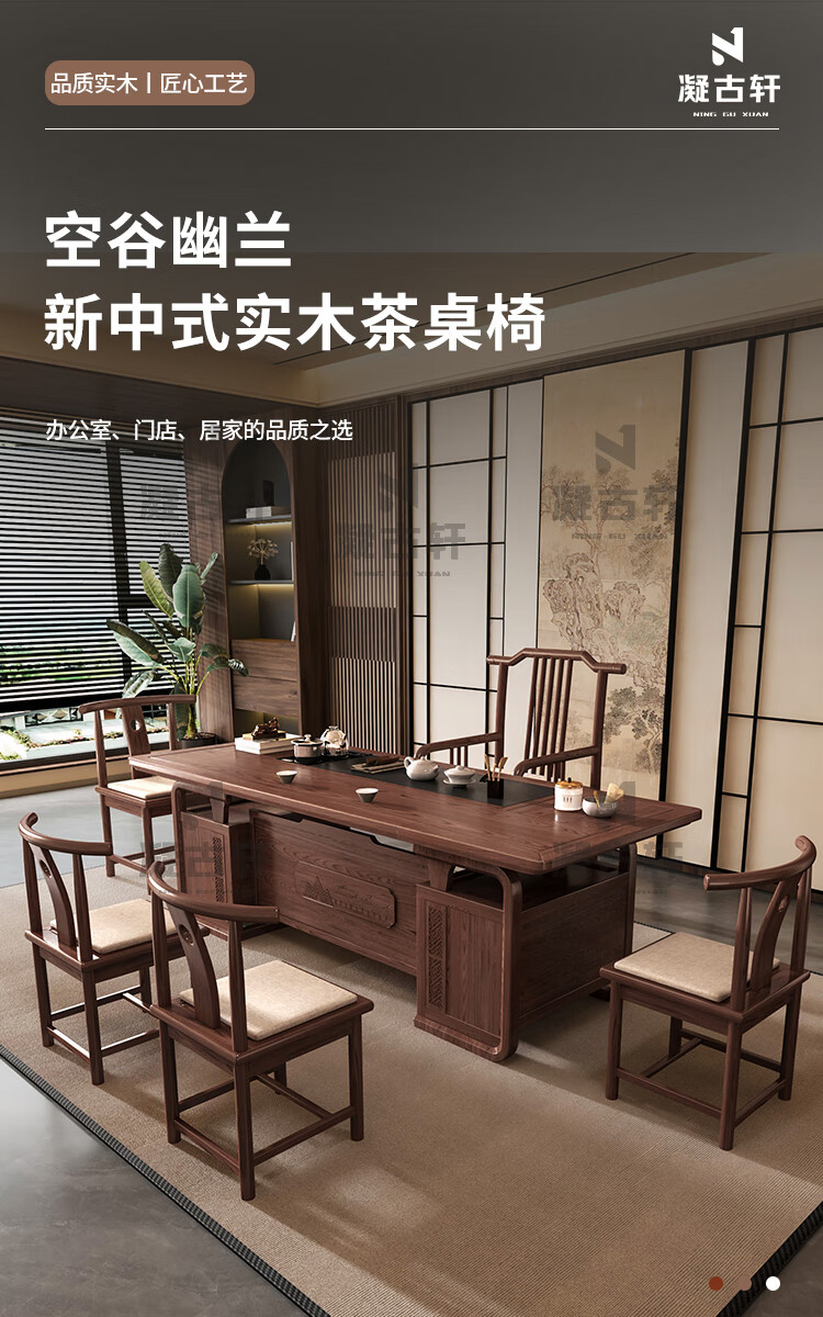 Ningguxuan ebony wood tea table and chair combination solid wood tea table large board living room with kettle integrated coffee table office complete set wet bubble table + 1 official hat chair + 4 arm chairs + stone tea tray 1.8m empty valley orchid carved dark pattern atmospheric storage feet
