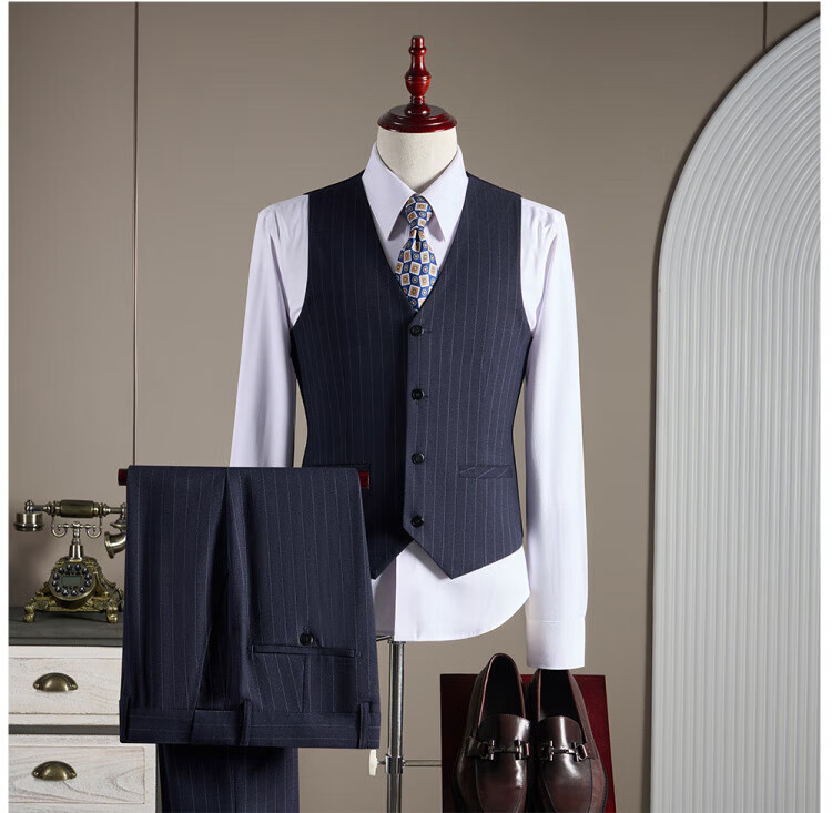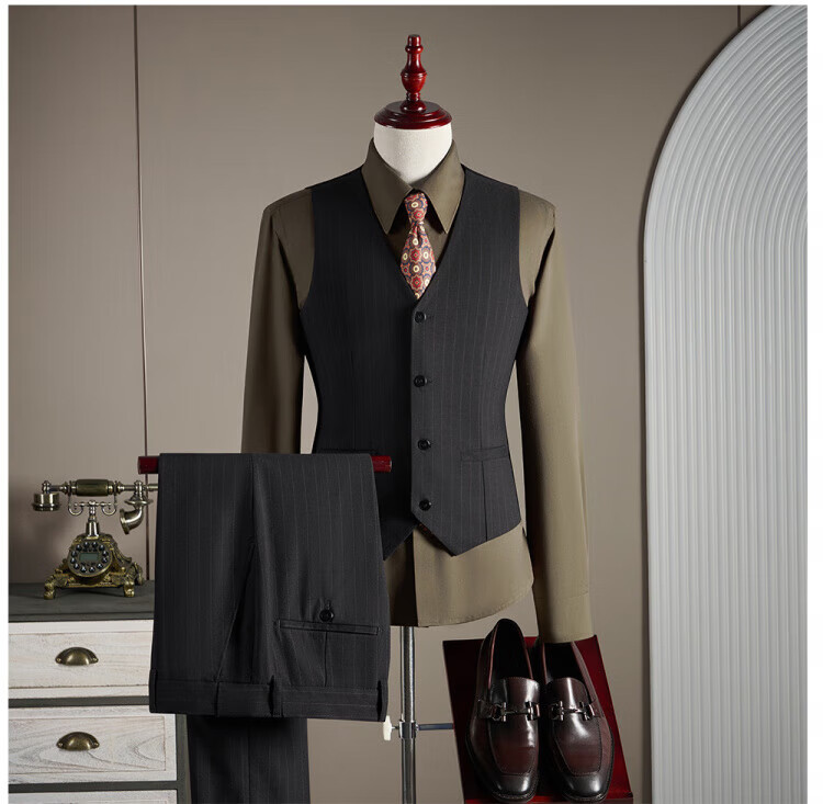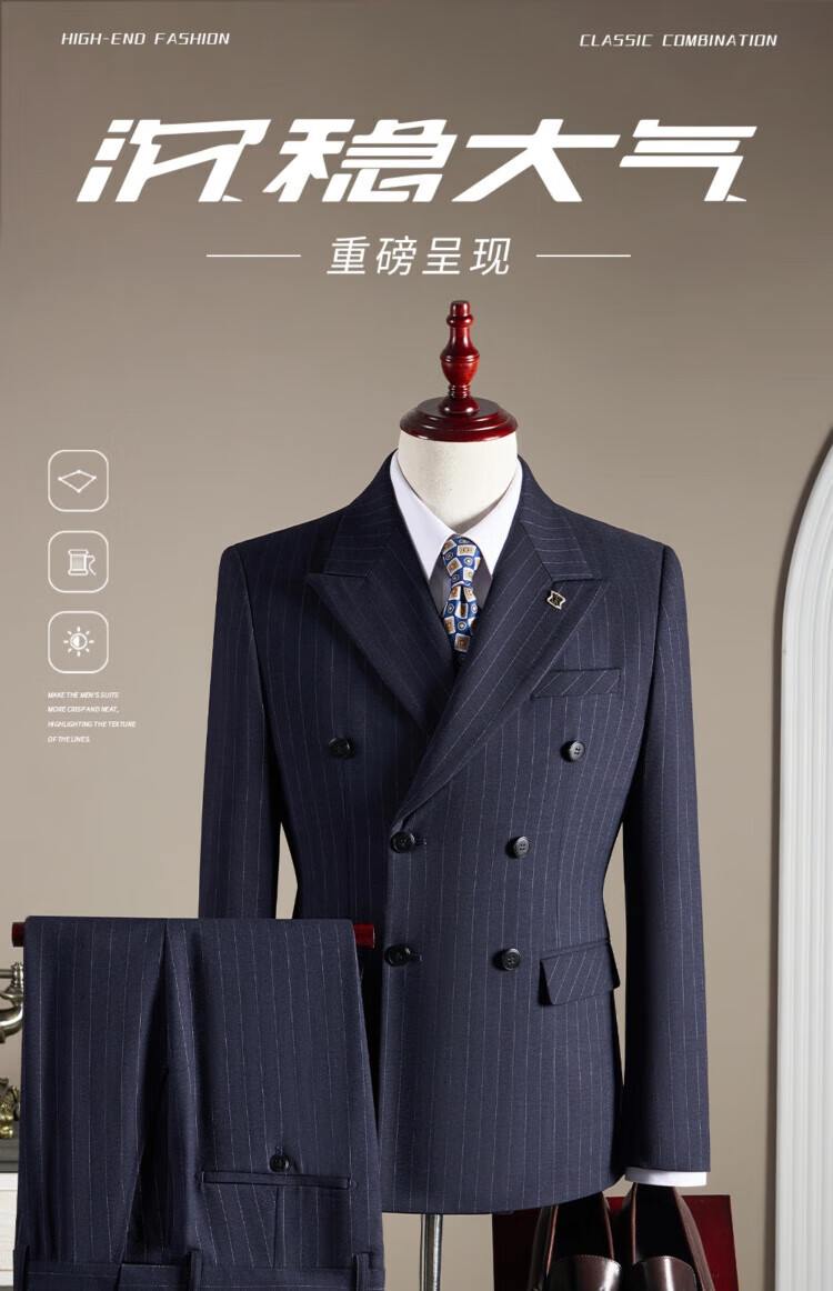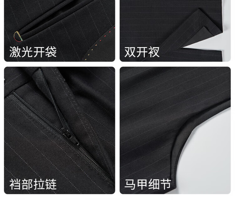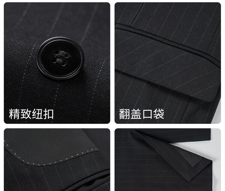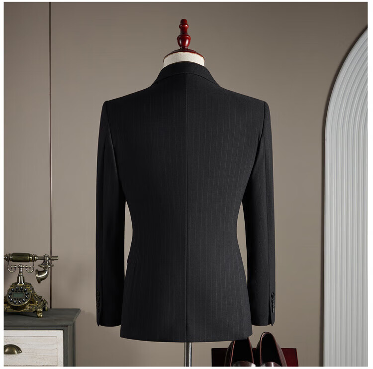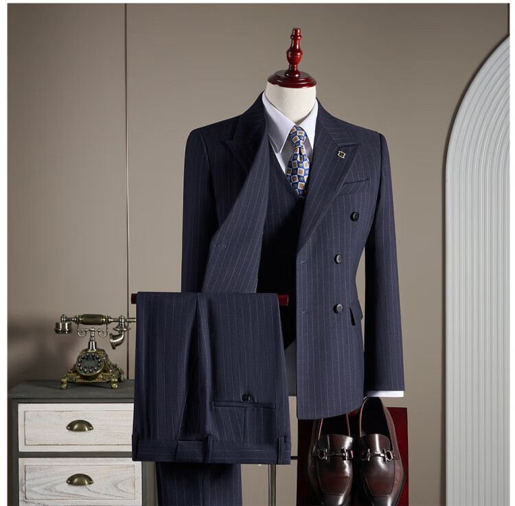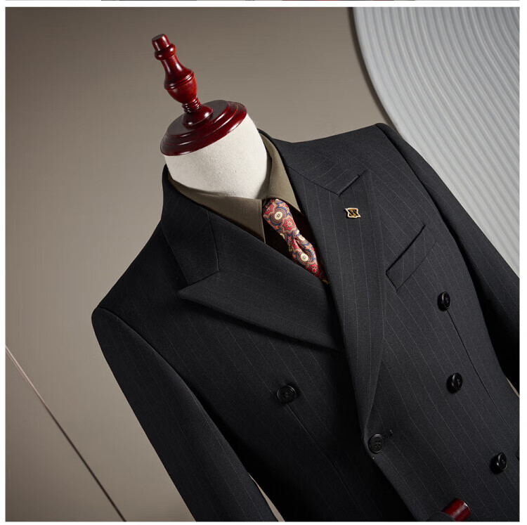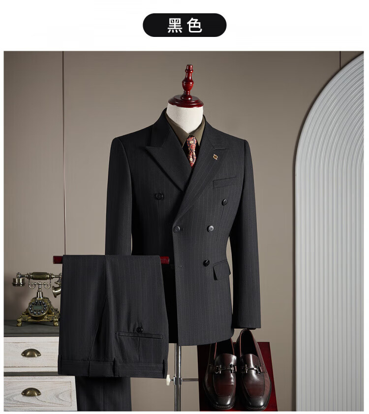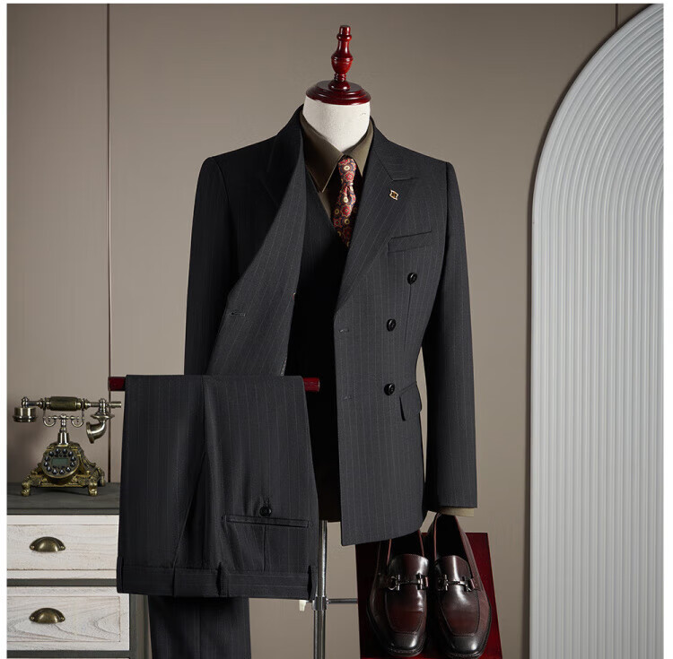ROMON Double-breasted Striped Suit Men's British Style Business Slim Small Suit Groom Wedding Dress Jacket Men's Three-piece Suit - Black Suit + Trousers + Vest (Free White Shirt + Brooch) 2XL /54 Size 135-148Jin Jin is equal to 0.5kg Wear