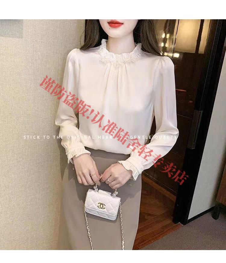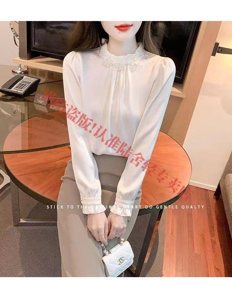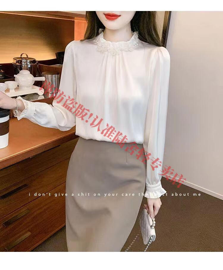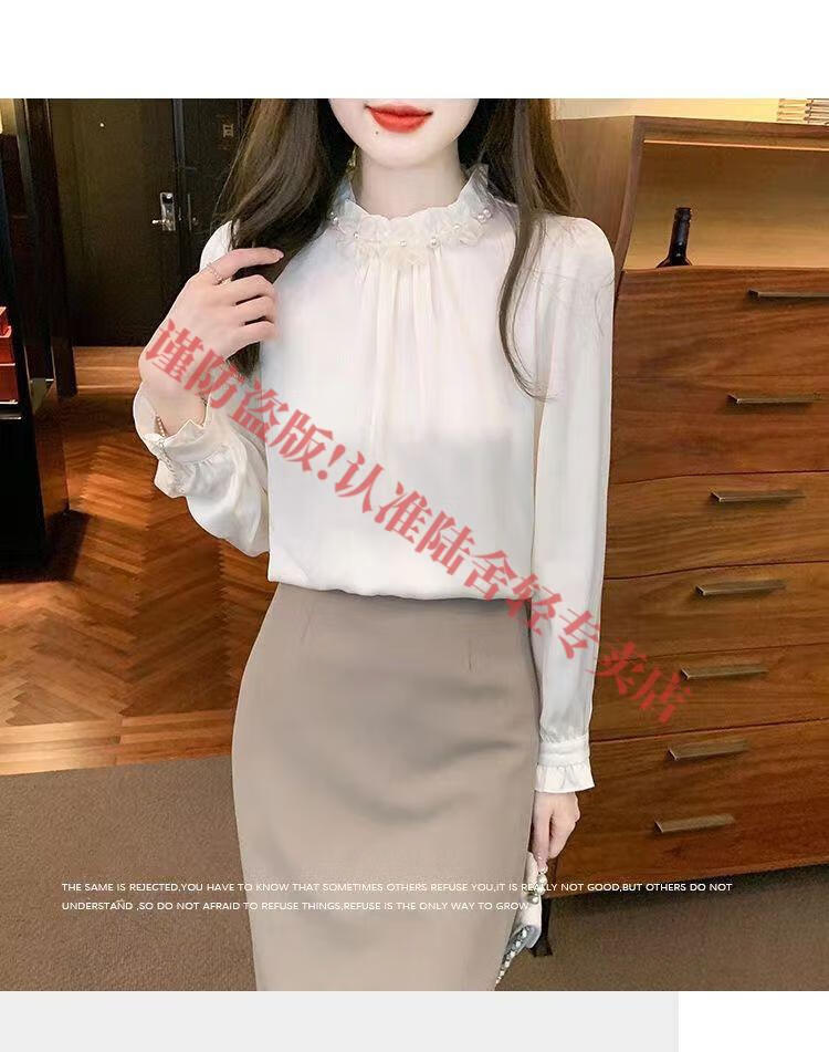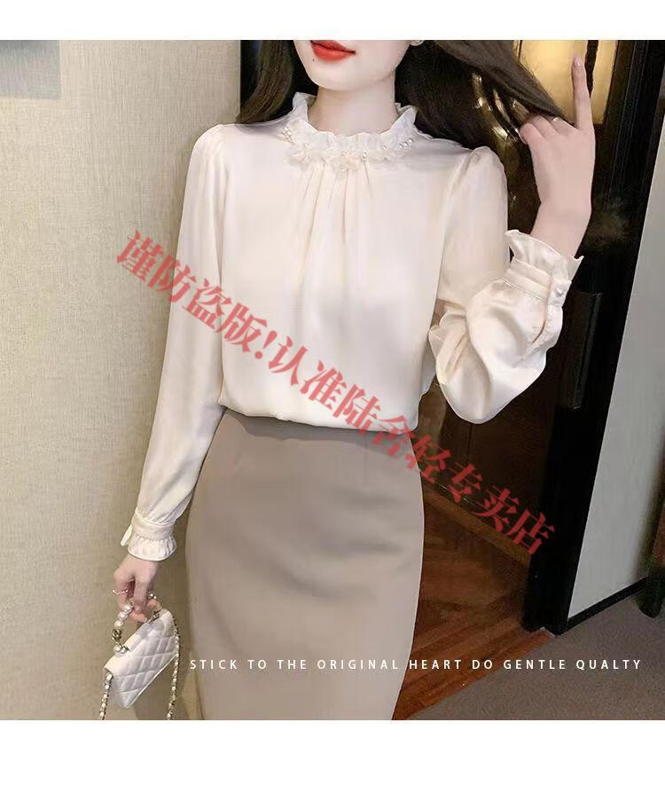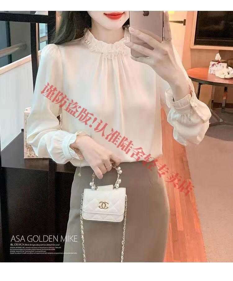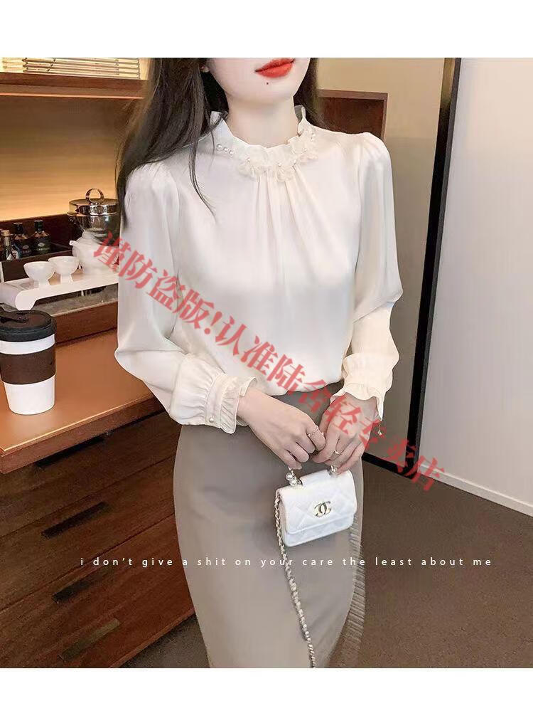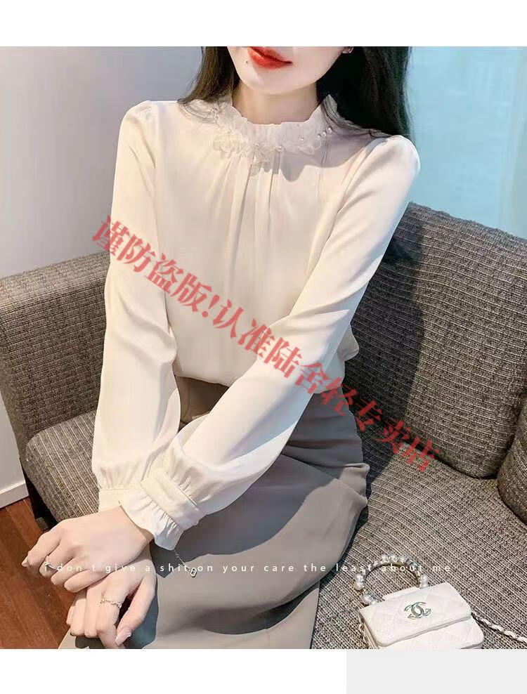 Pierre Cardin temperament stand collar beading spring and autumn 2025 new French long-sleeved chiffon shirt women's shirt age-reducing chic and beautiful shirt apricot L Recommendation 100Jin Jin is equal to 0.5kg -115Jin Jin is equal to 0.5kg