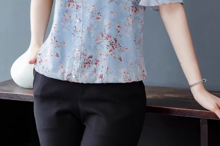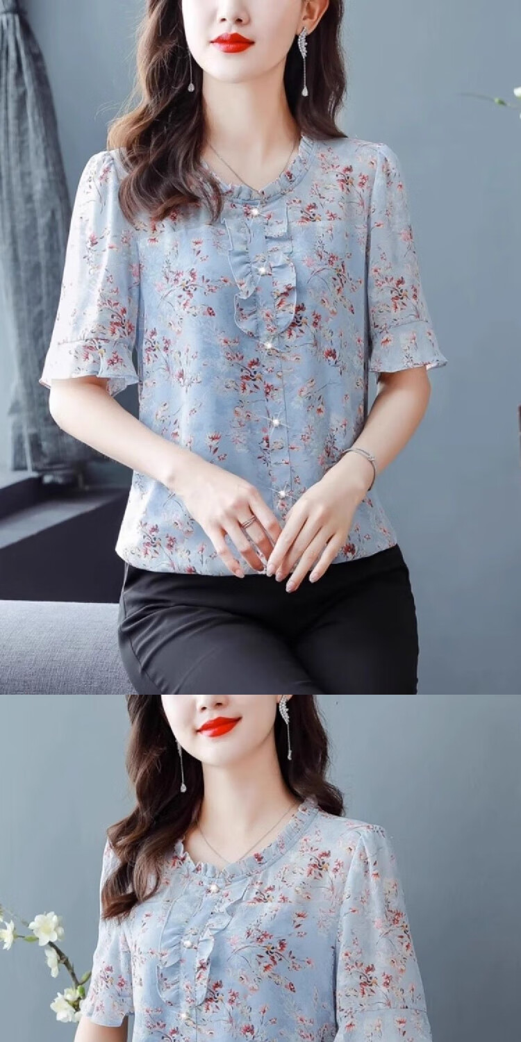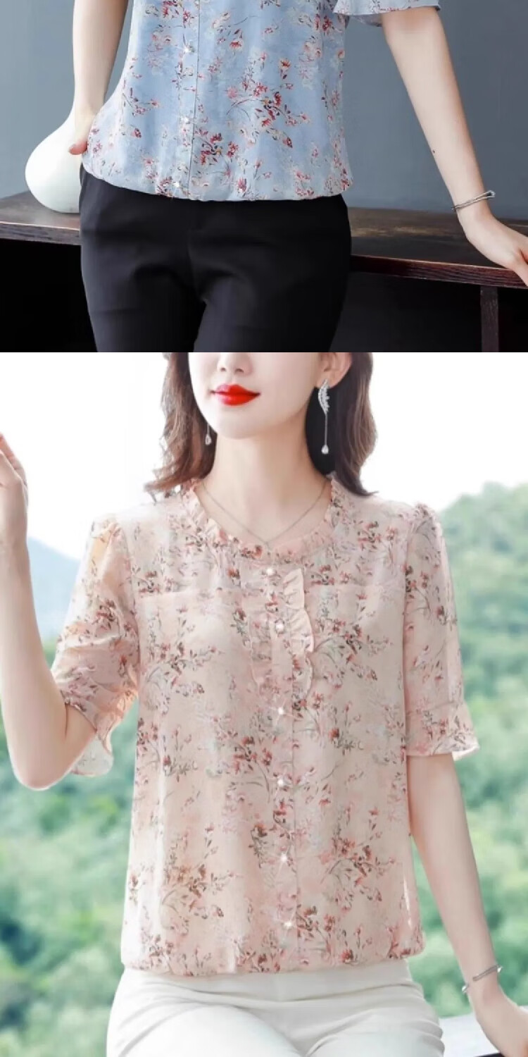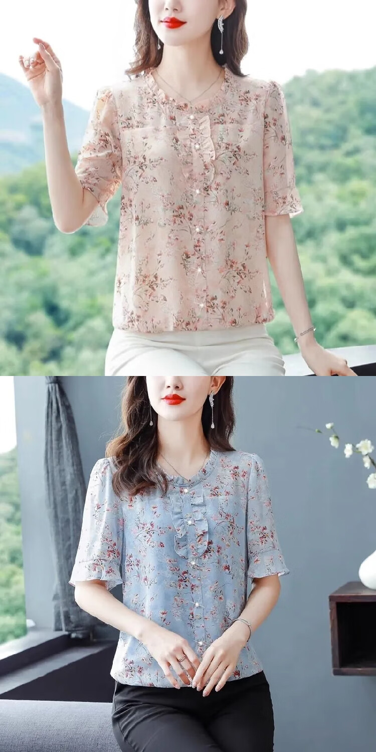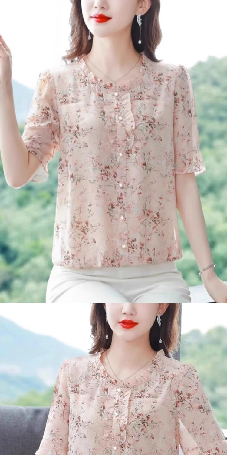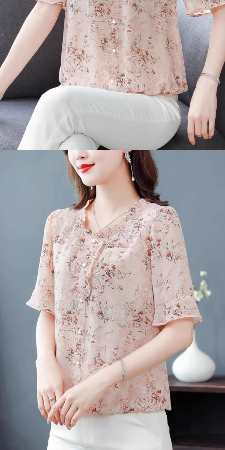 New summer short-sleeved floral chiffon shirt for women, loose belly-covering top, fashionable mother's age-reducing shirt, pink 3XL, recommended 135-145 Jin Jin equals 0.5 kg