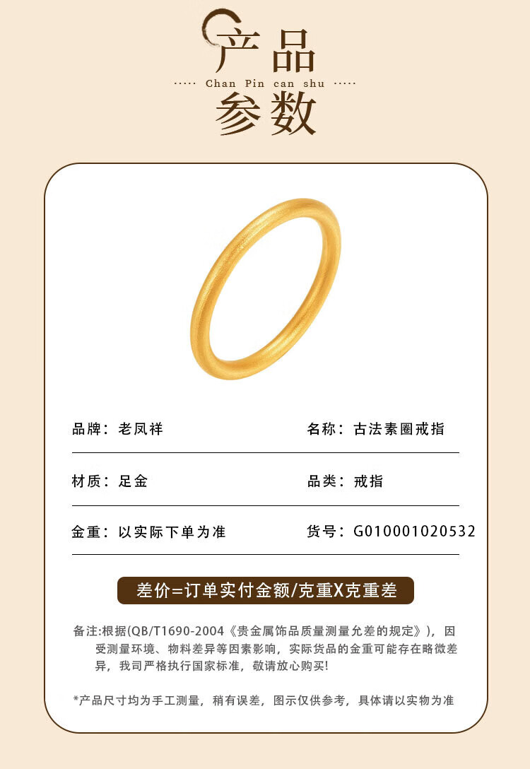 Lao Fengxiang gold ancient method pure gold ring for women and men, Valentine's Day birthday gift for girlfriend, wife and mother, circle mouth No. 12, ancient method, about 2g