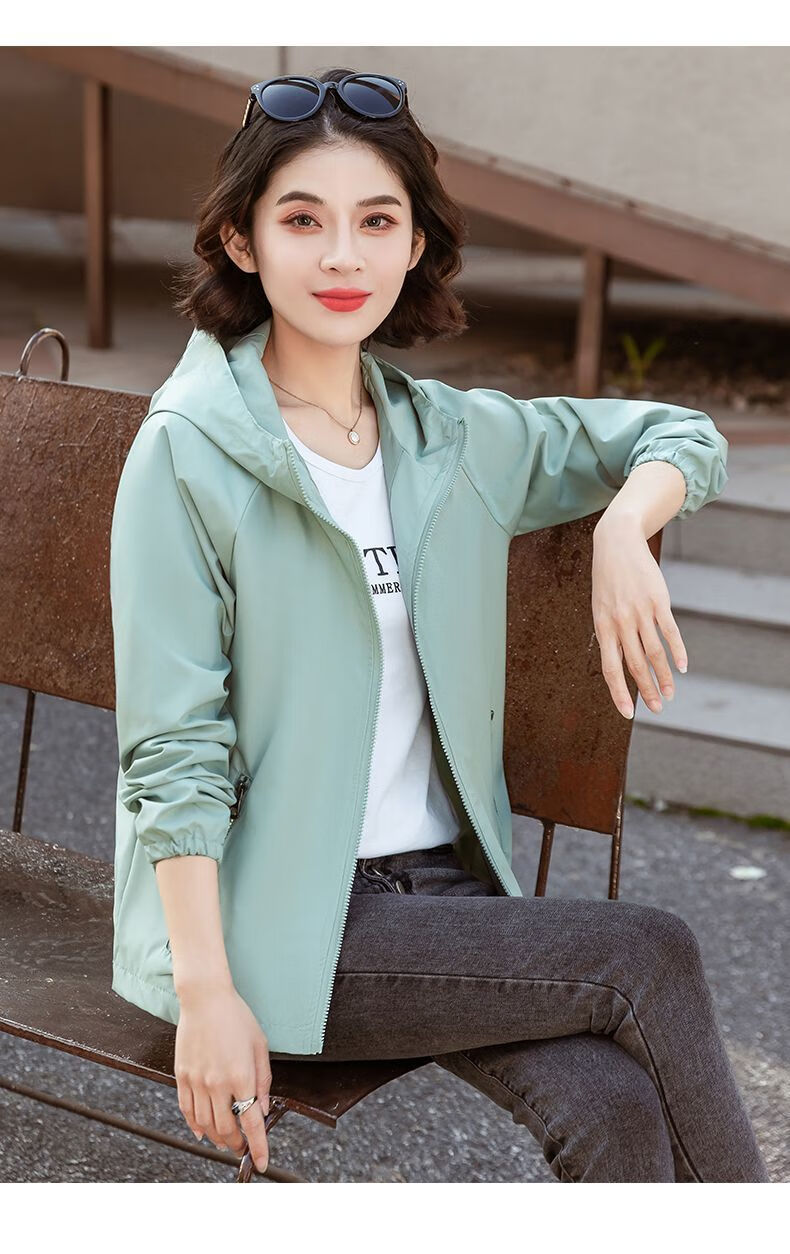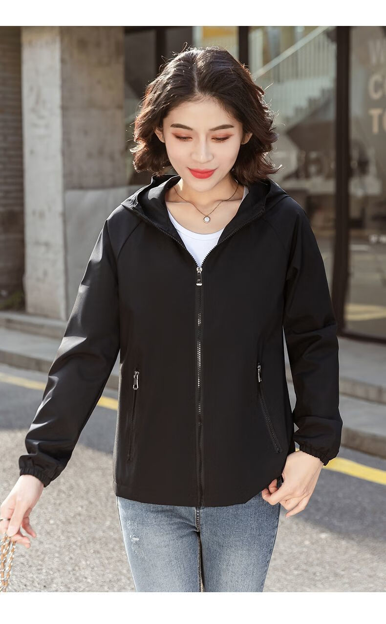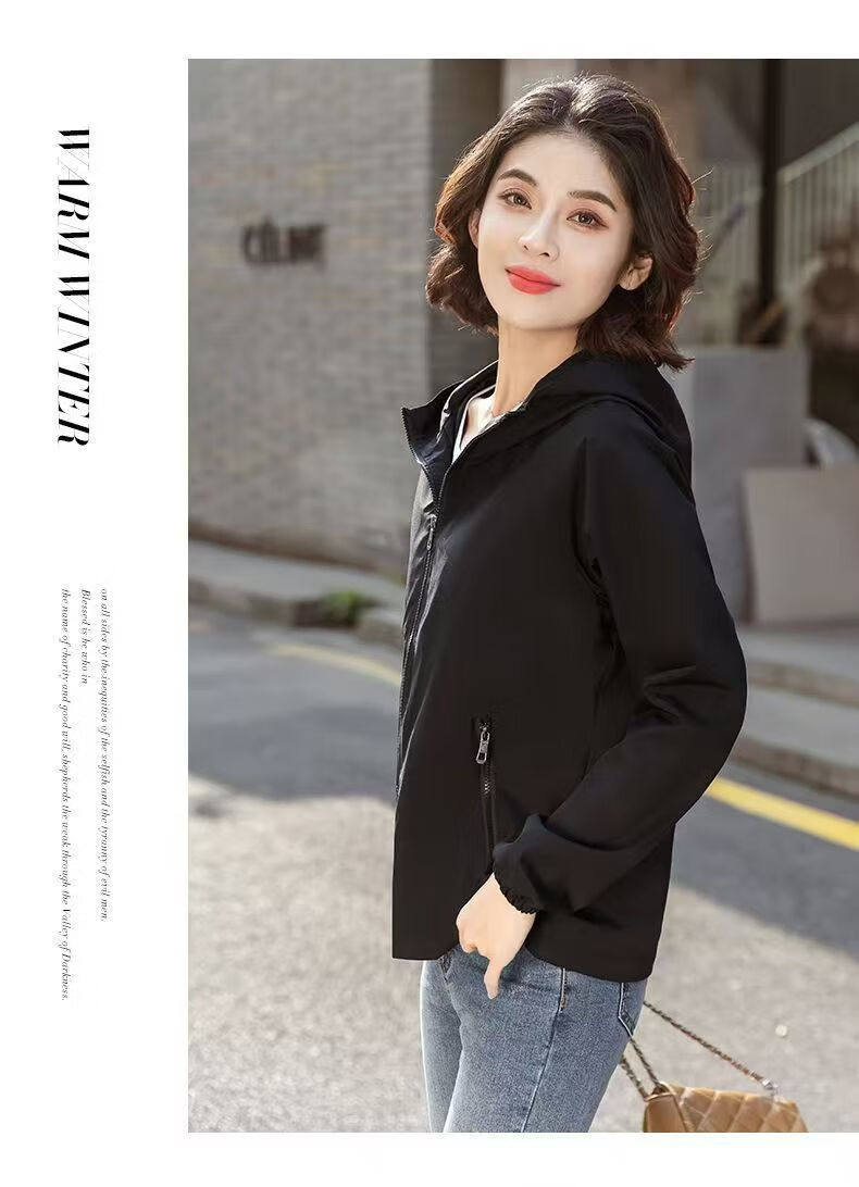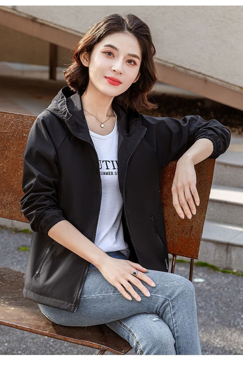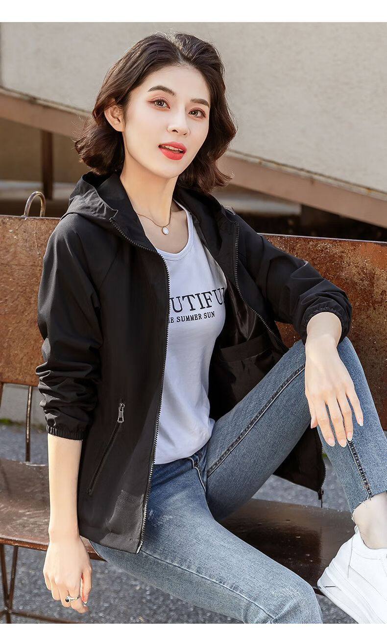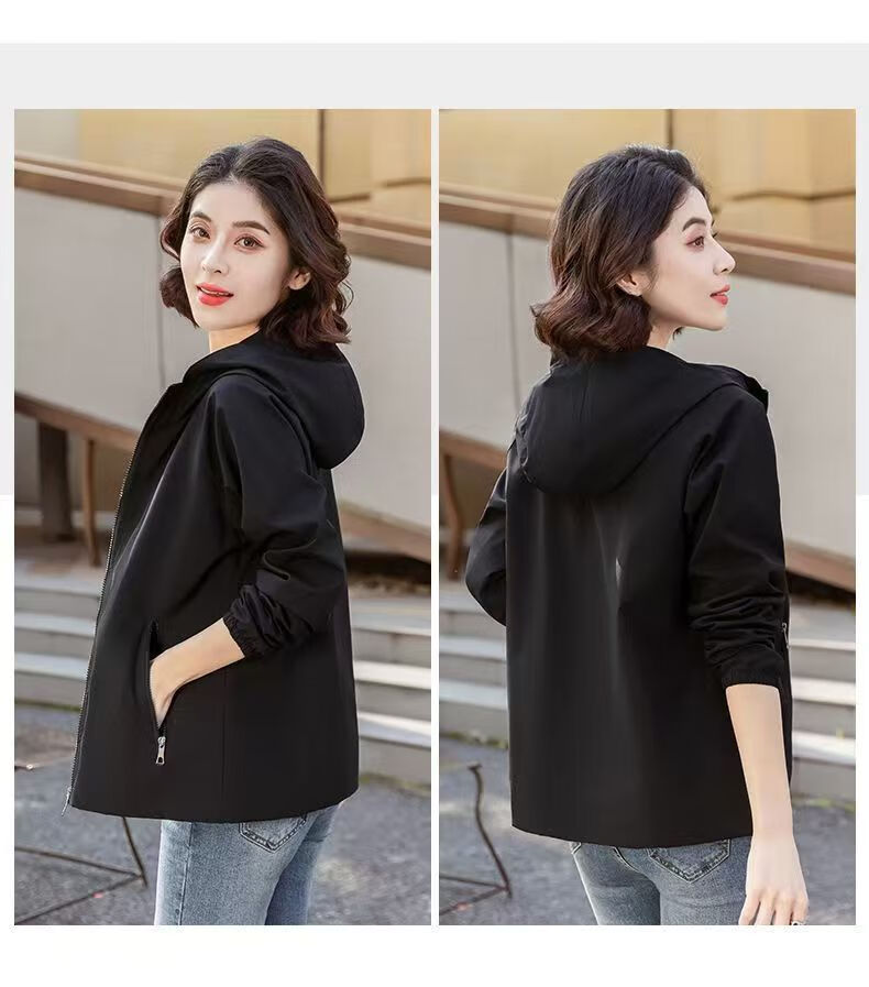 Windbreaker Women's Short Spring and Autumn New Loose Casual Versatile Large Size Thin Hooded Small Fragrance Jacket Jacket Black XL 120-135Jin Jin is equal to 0.5 kg