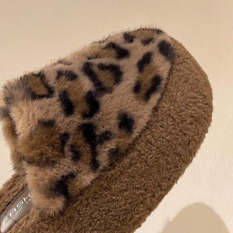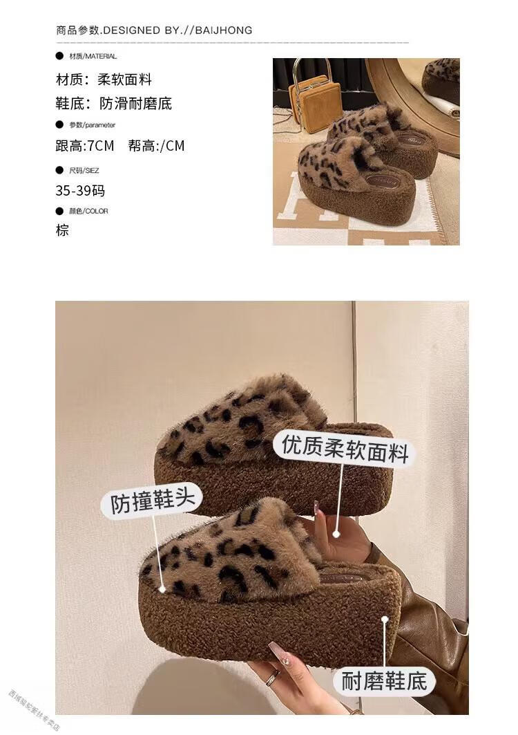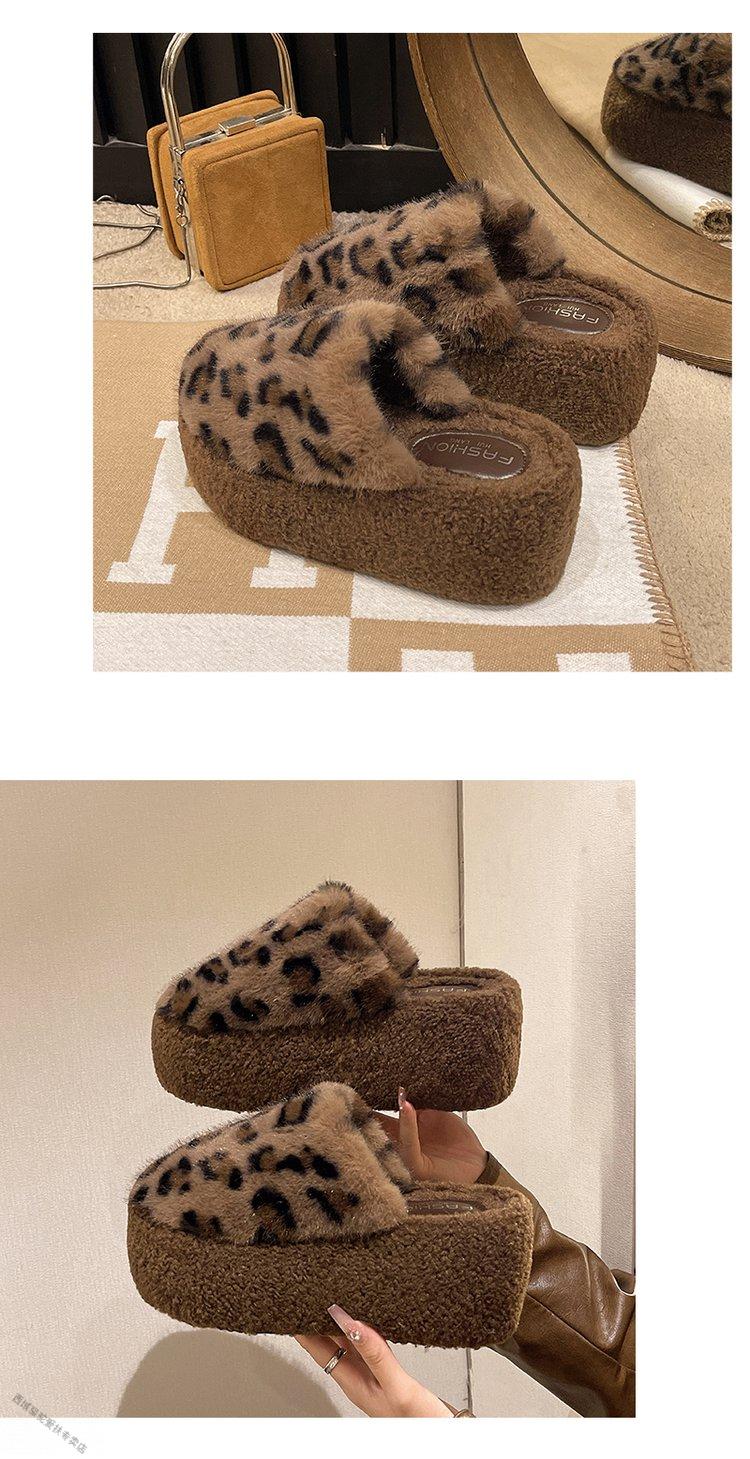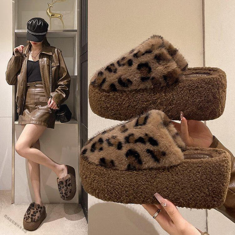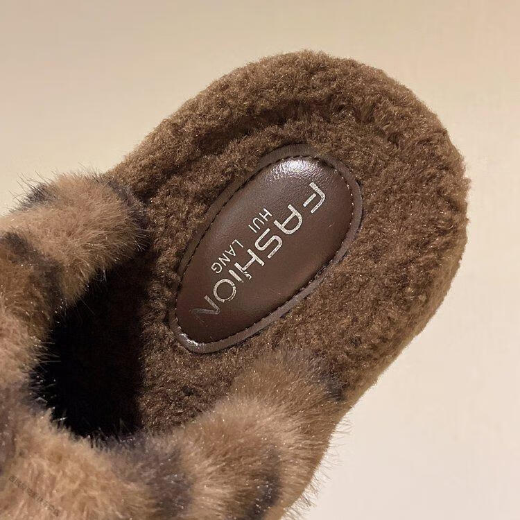 Western Camel Super High Heel Thick Soled Fur Slippers Women's Outerwear 2025 Autumn and Winter Platform Wedge Heel Plus Velvet Baotou Cotton Slippers Dark Brown One Size Small 34
