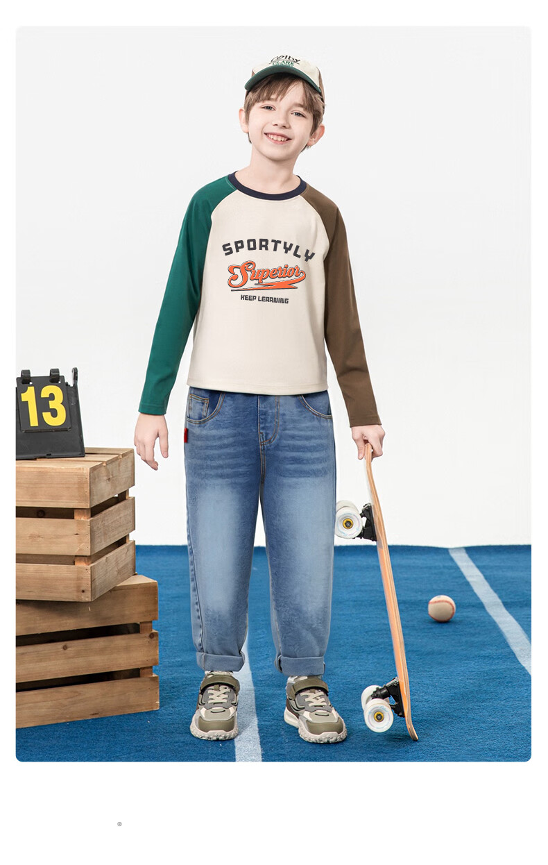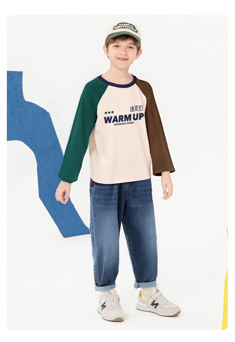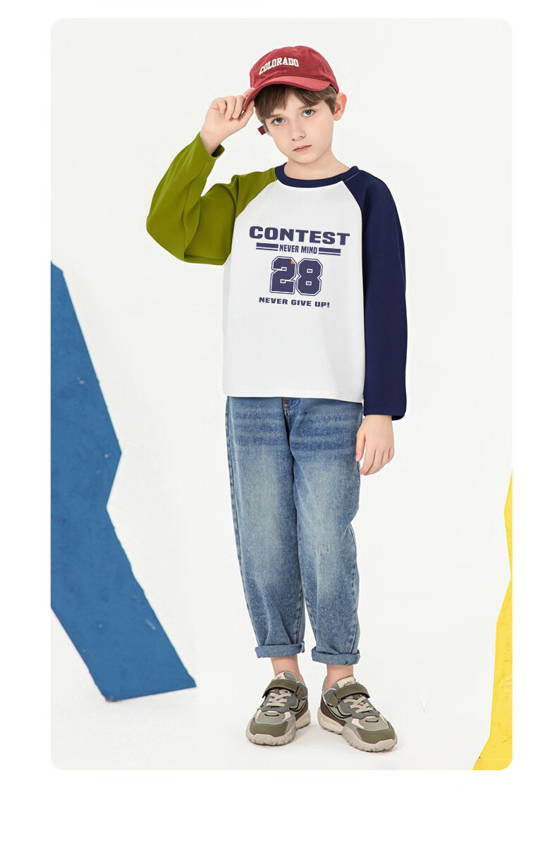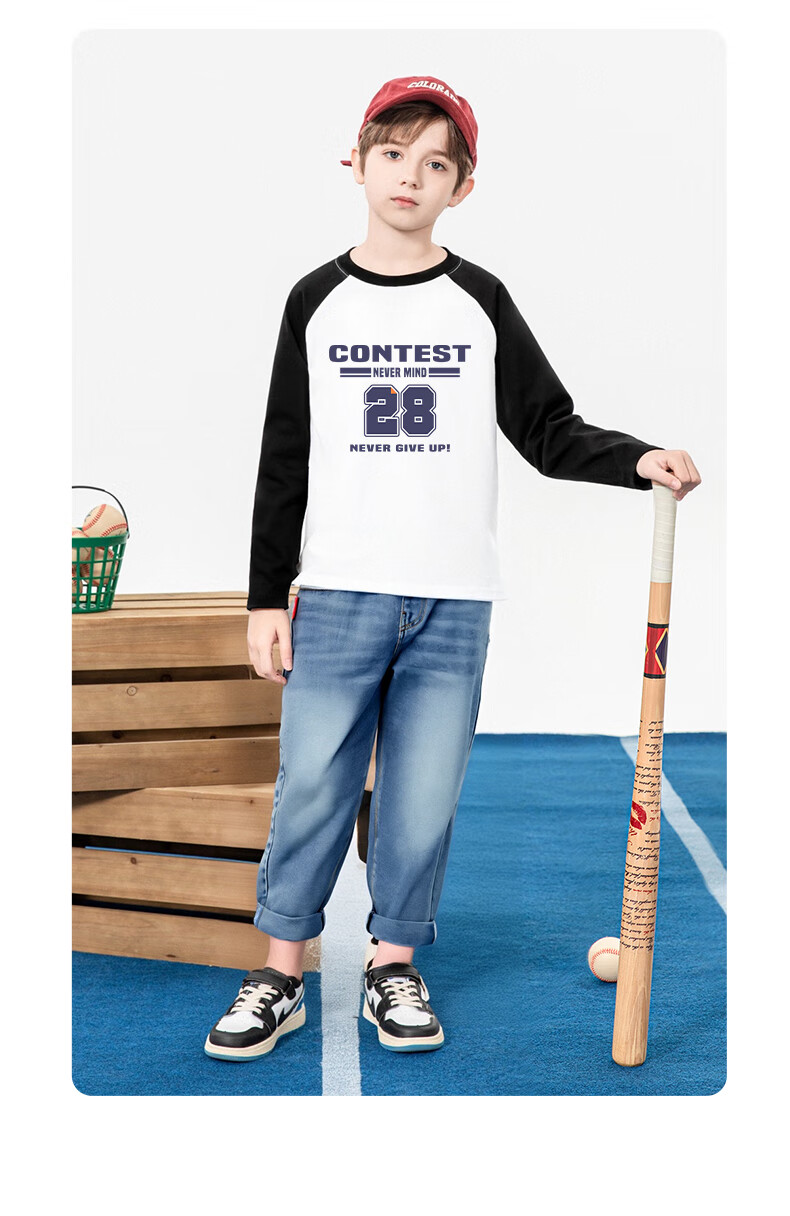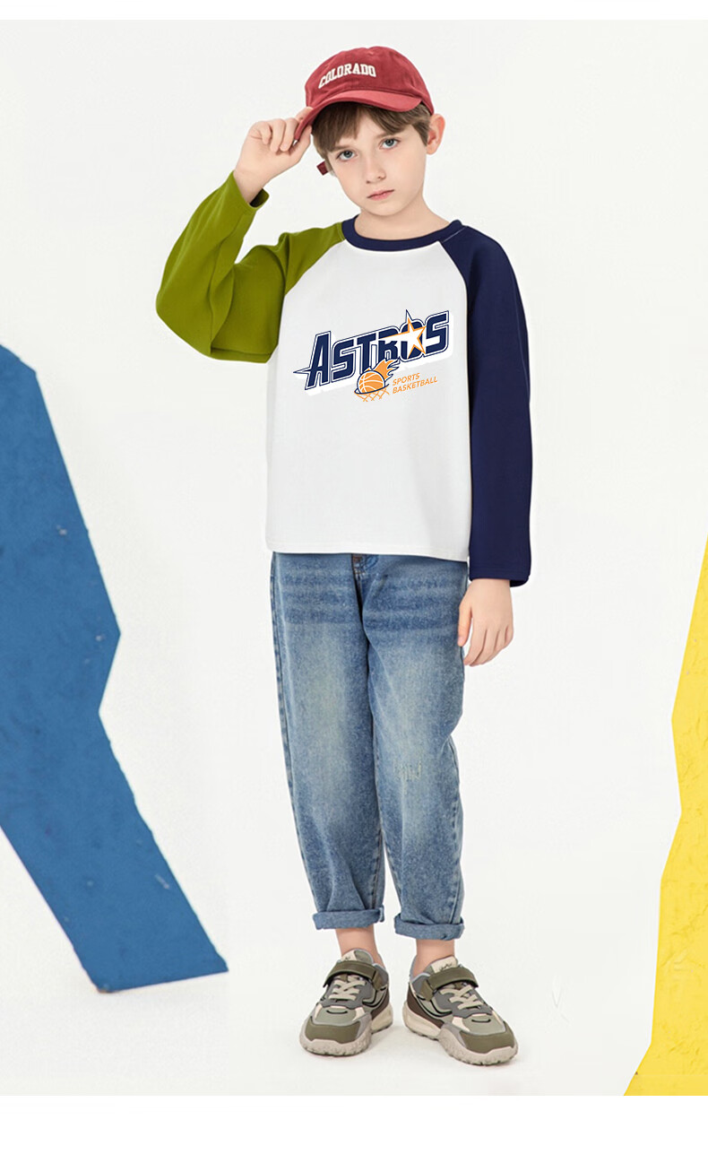 Baleno children's clothing children's T-shirt boys long-sleeved spring and autumn 2026 new medium and large children's bottoming shirt pure cotton color matching clothes white with green and blue BNL Basketball Fire 160
