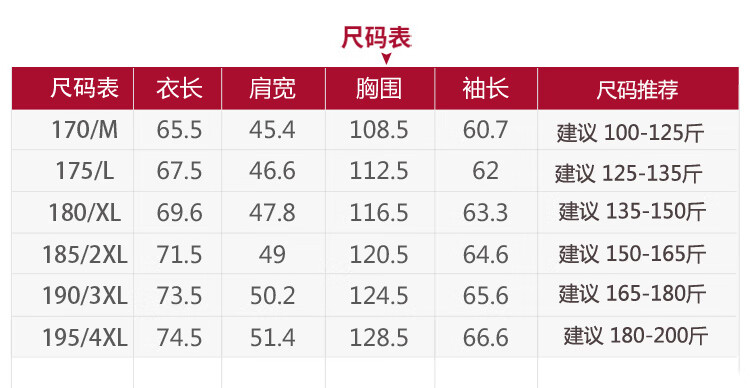 China (cm) 165 / 88-90 170 / 96-98 175 / 108-110 180 / 118-122 185 / 126-130