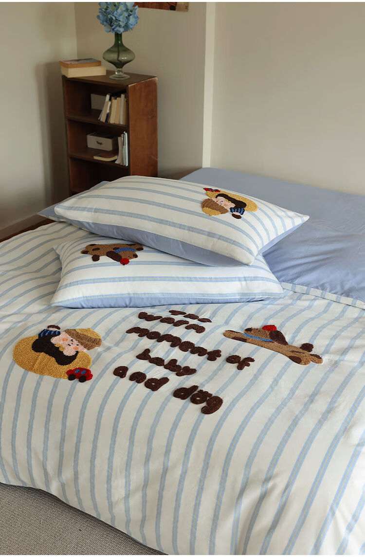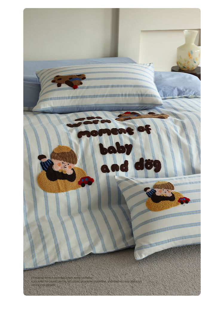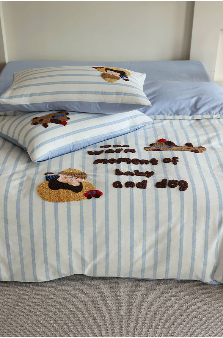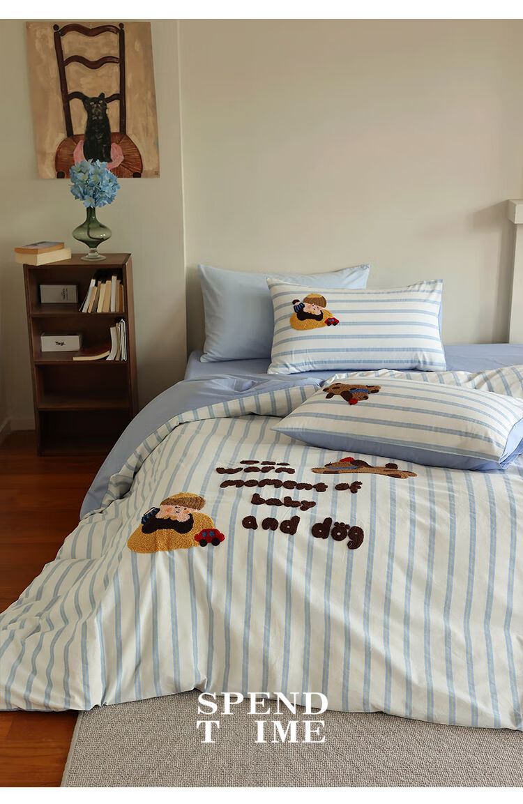 Spend Time Living Children's Cartoon Towel Embroidered Bedding Class A Washed Cotton Bed Sheet Quilt Cover Striped Four-piece Set Baby Puppy 1.5-1.8m Bed Sheet Style Quilt Cover 200X230cm