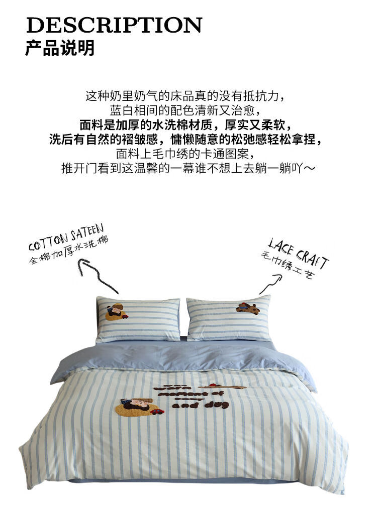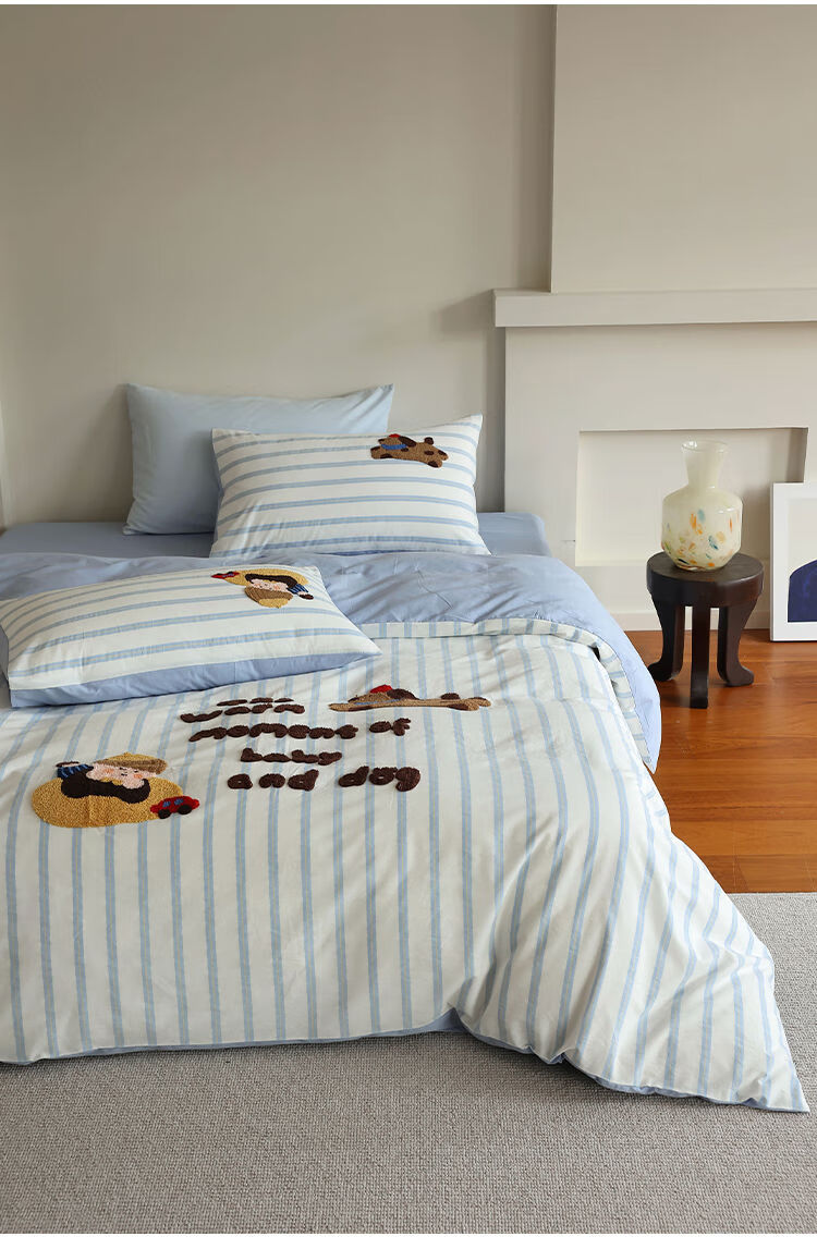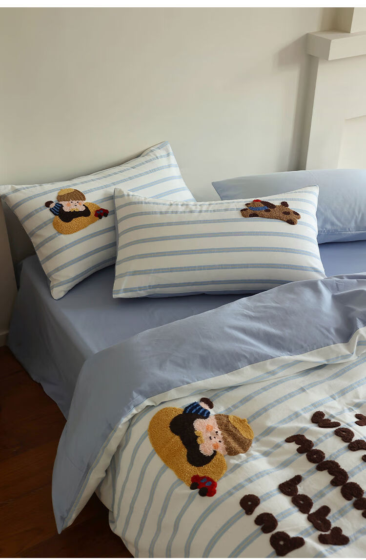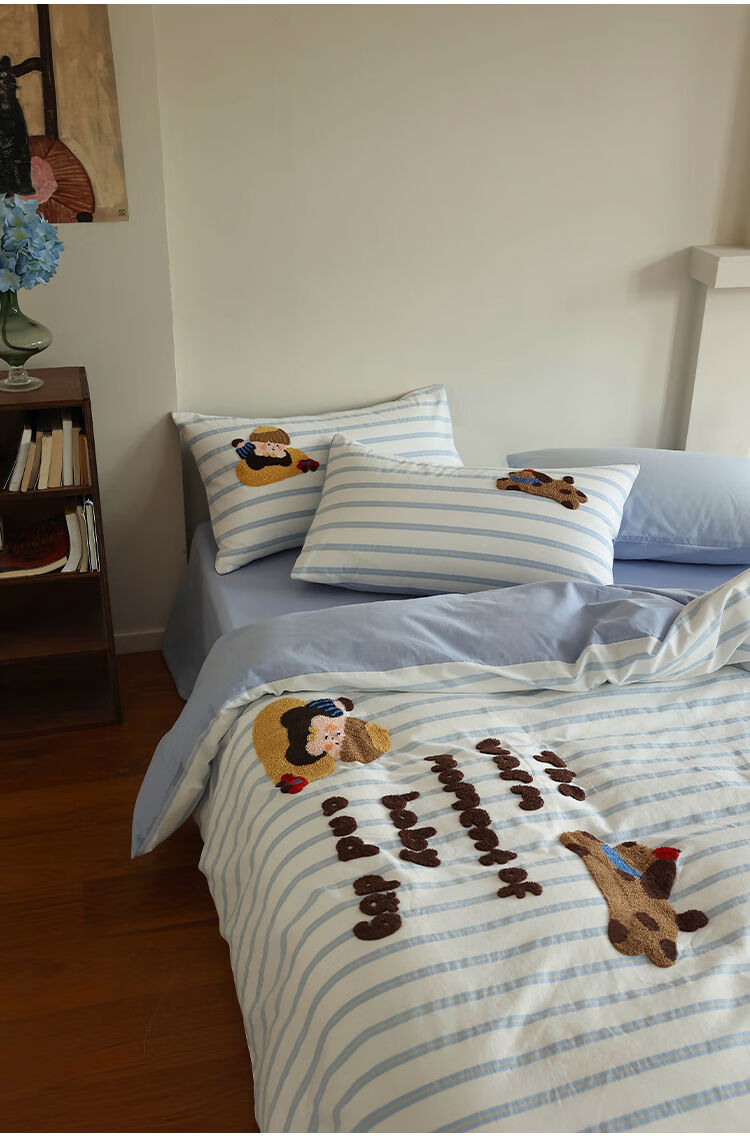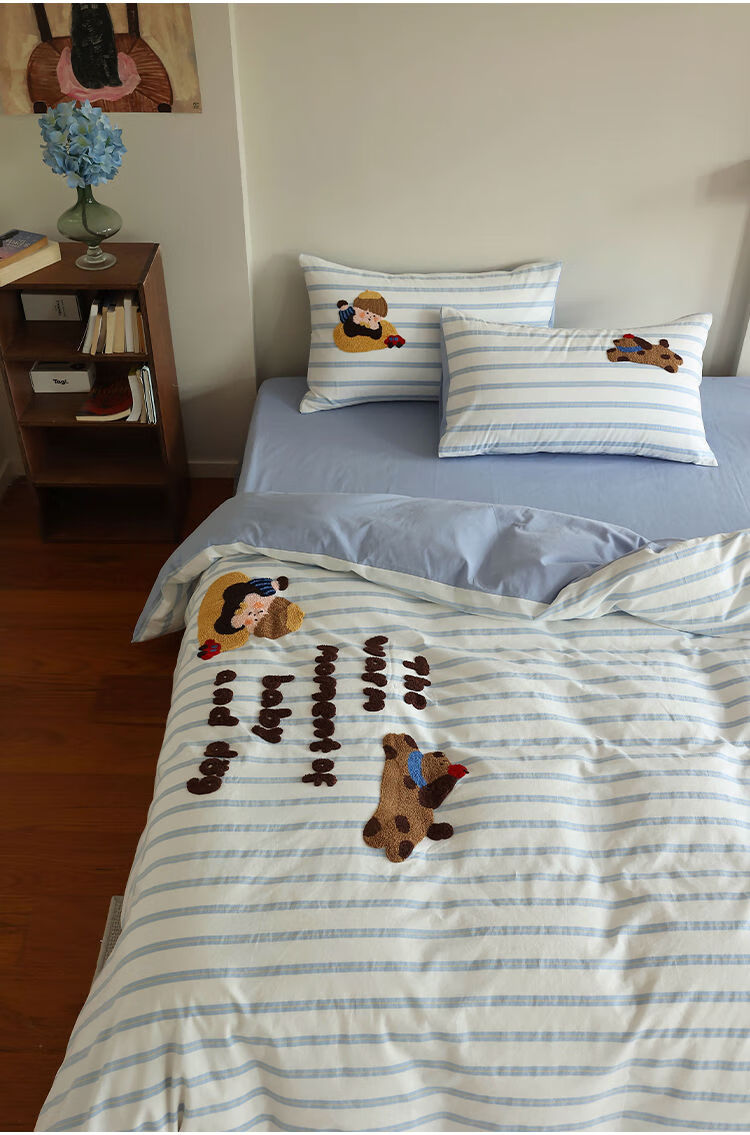 Spend Time Living Children's Cartoon Towel Embroidered Bedding Class A Washed Cotton Bed Sheet Quilt Cover Striped Four-piece Set Baby Puppy 1.5-1.8m Bed Sheet Style Quilt Cover 200X230cm