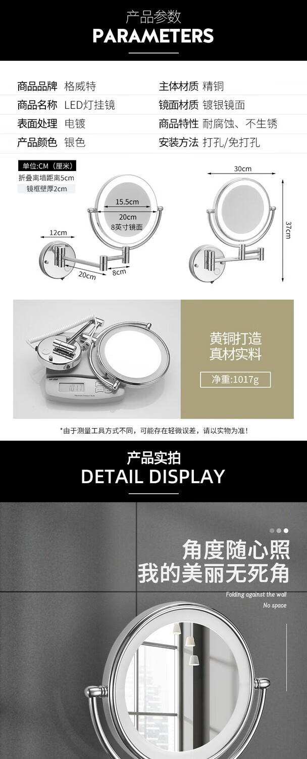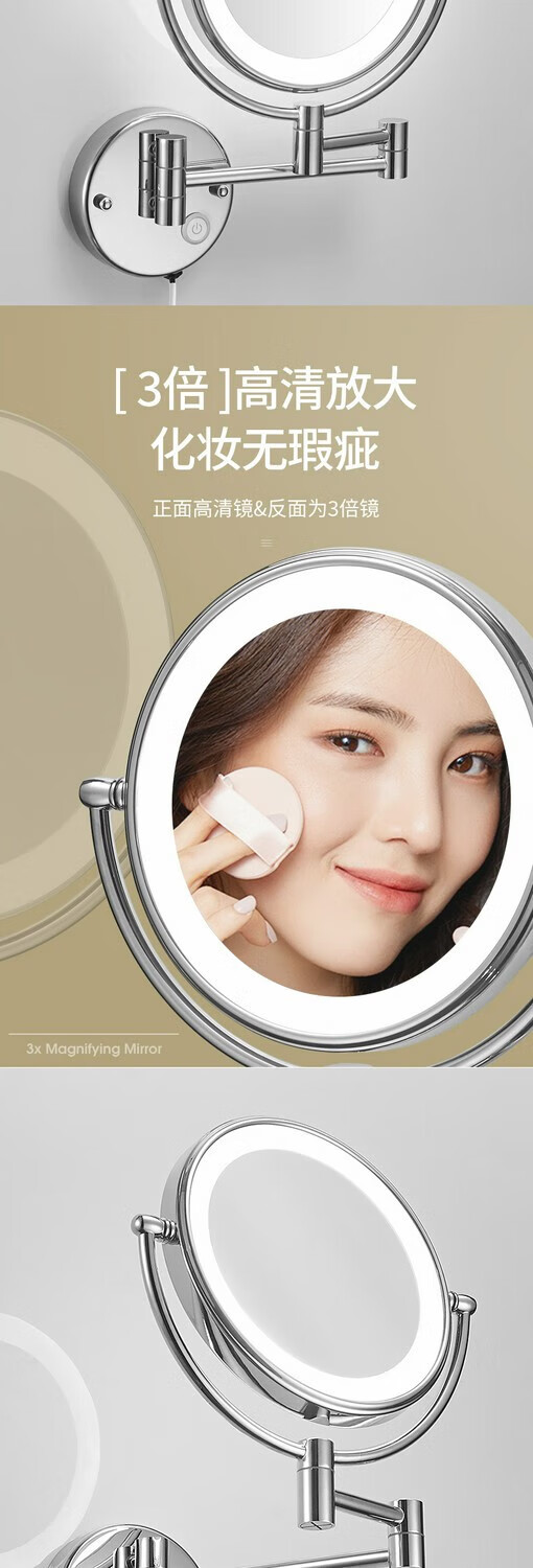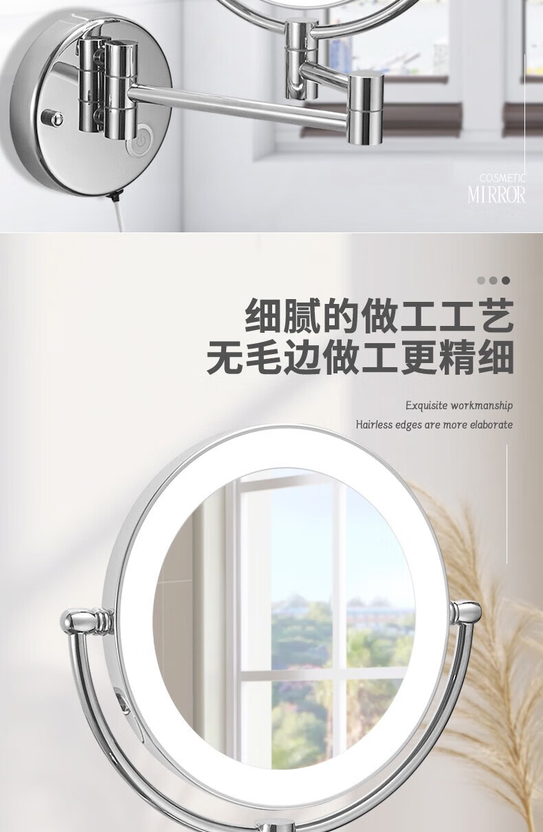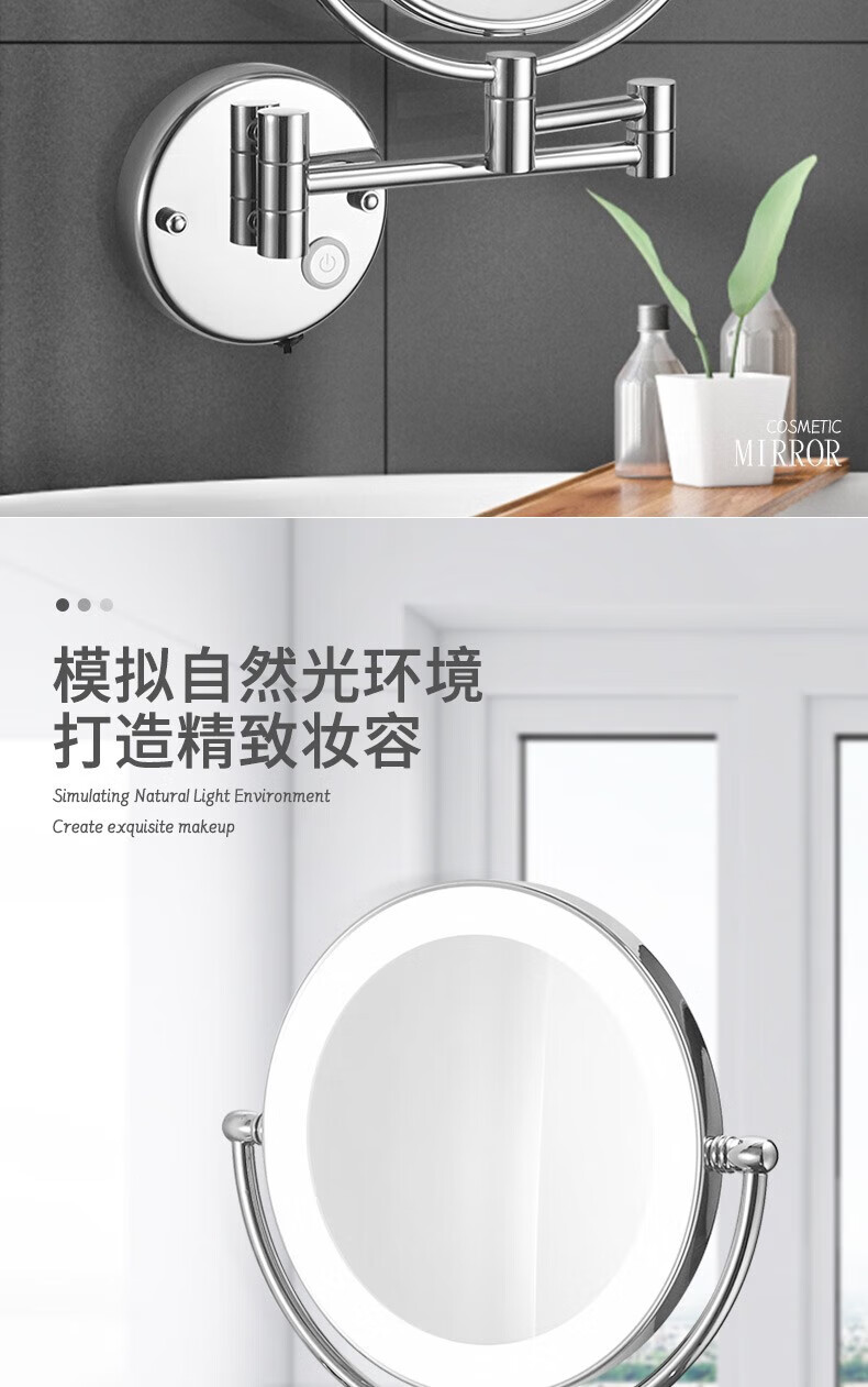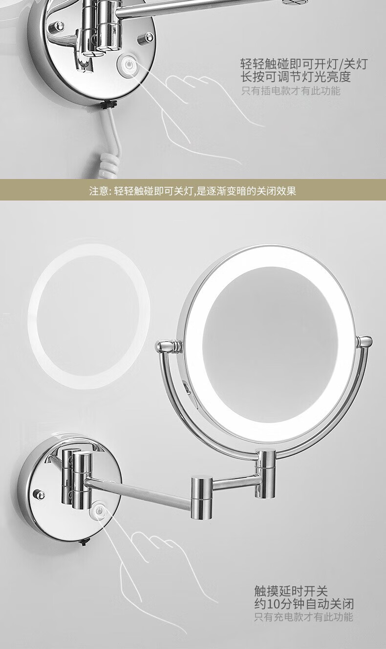 GWT telescopic makeup mirror with light, wall-mounted bathroom mirror, hotel bathroom hole-free folding double-sided LED light beauty mirror, appreciation brightness adjustment light mirror, silver plug style