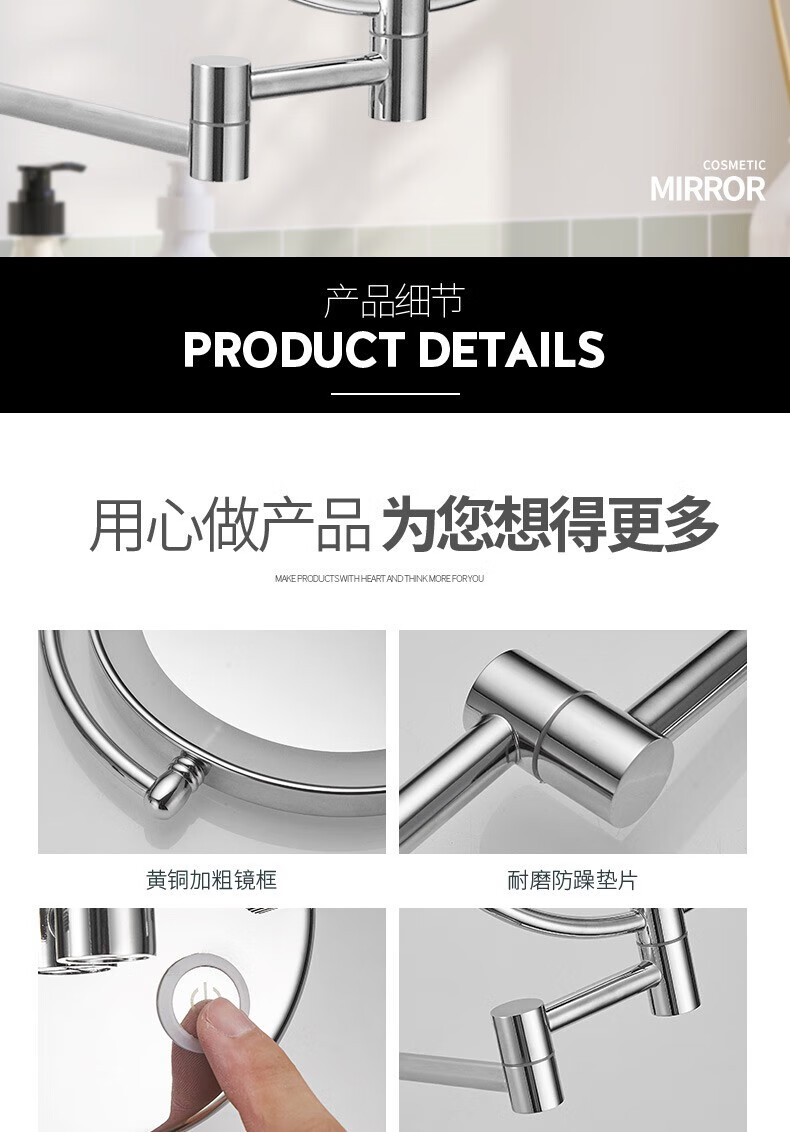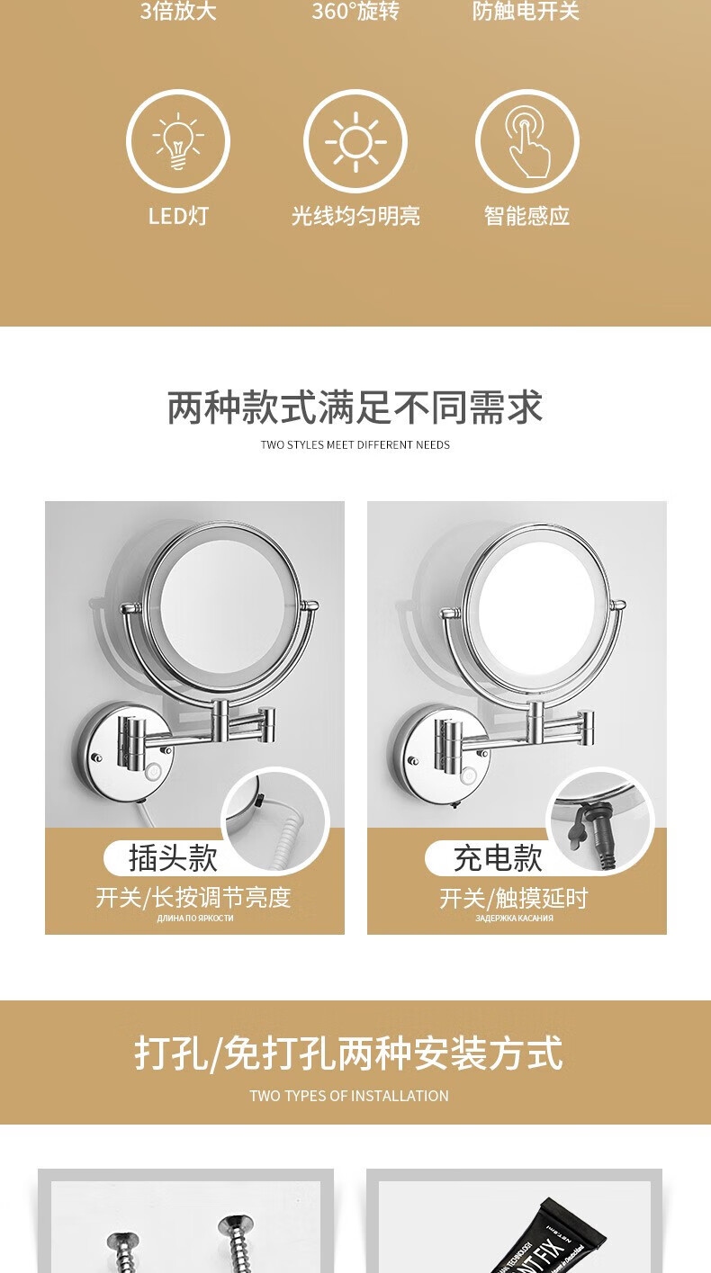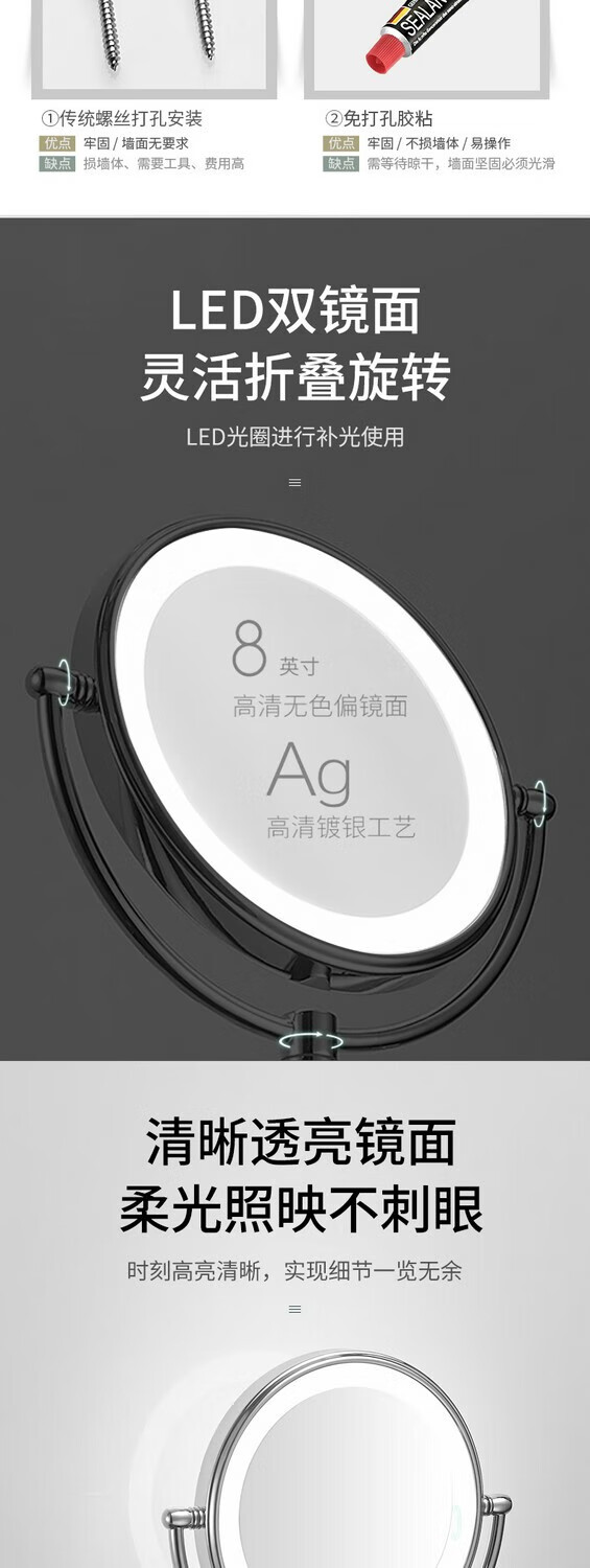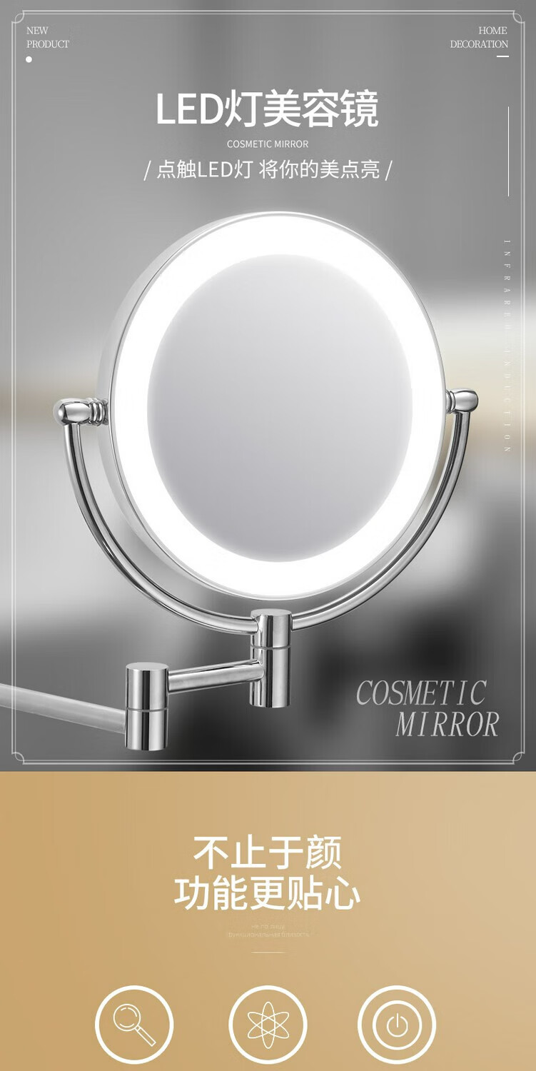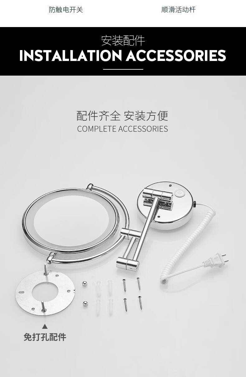 GWT telescopic makeup mirror with light, wall-mounted bathroom mirror, hotel bathroom hole-free folding double-sided LED light beauty mirror, appreciation brightness adjustment light mirror, silver plug style