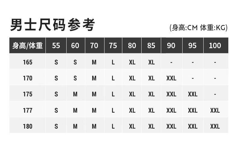 China (cm) 165 / 88-90 170 / 96-98 175 / 108-110 180 / 118-122 185 / 126-130