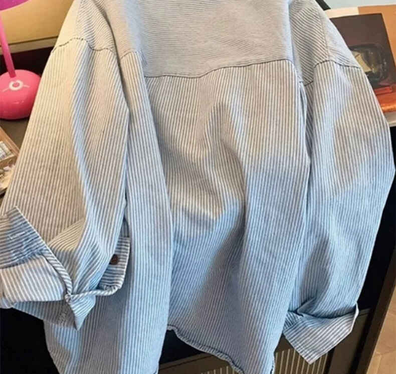 Xinnan blue striped long-sleeved shirt women's spring and autumn tops 2026 new loose design retro contrasting color coat shirt M size recommended 100-115 Jin Jin equals 0.5 kg