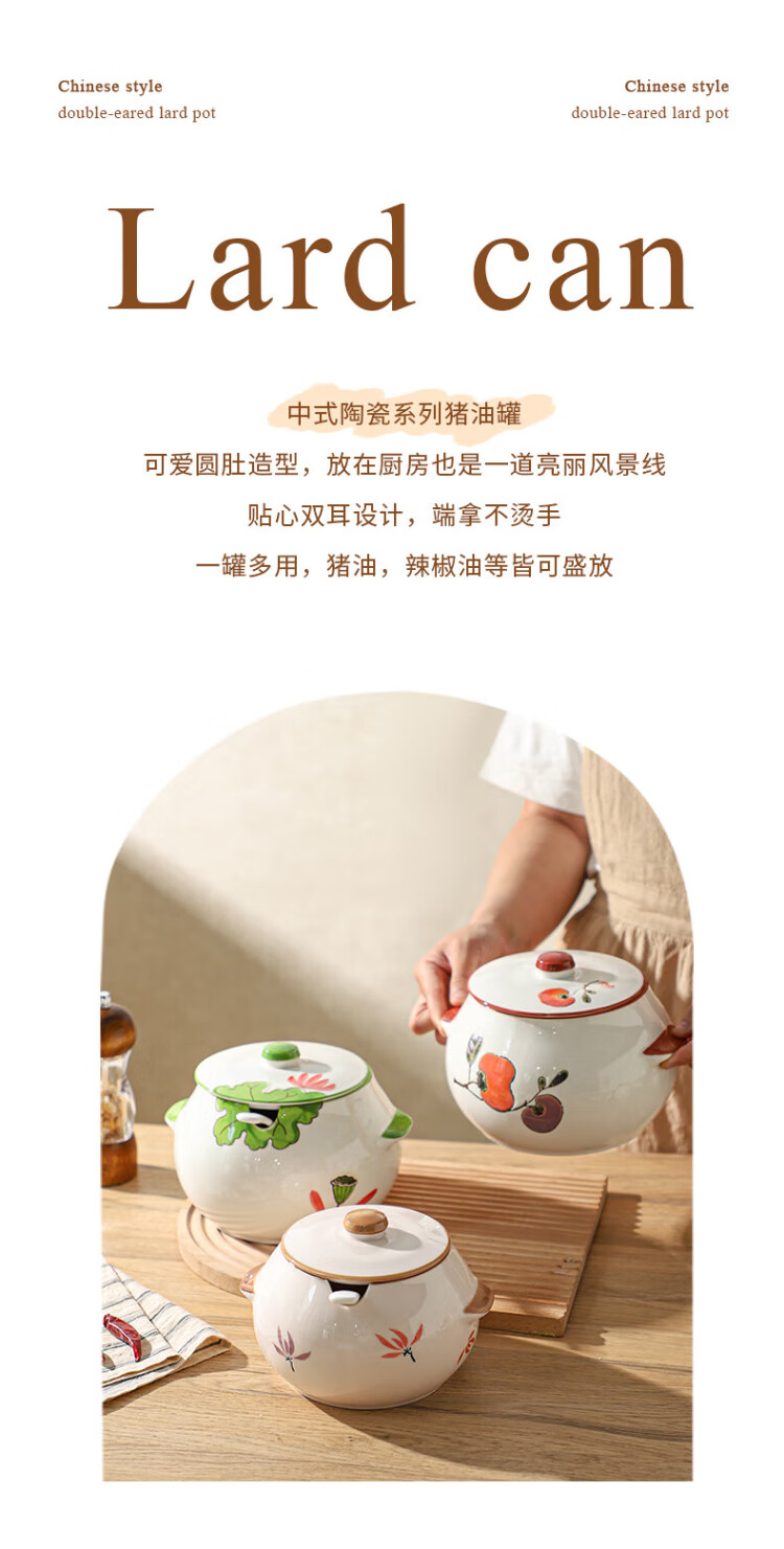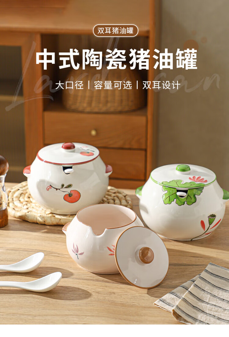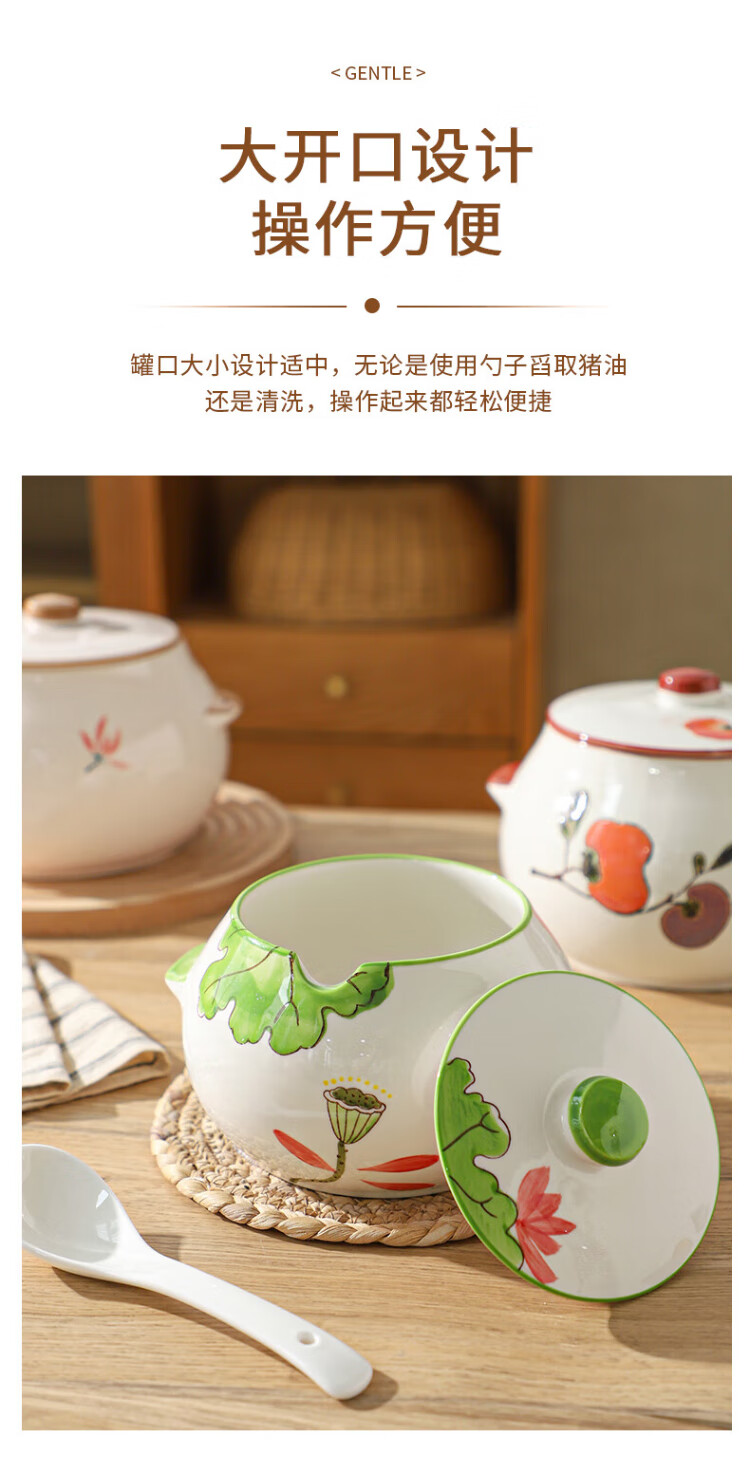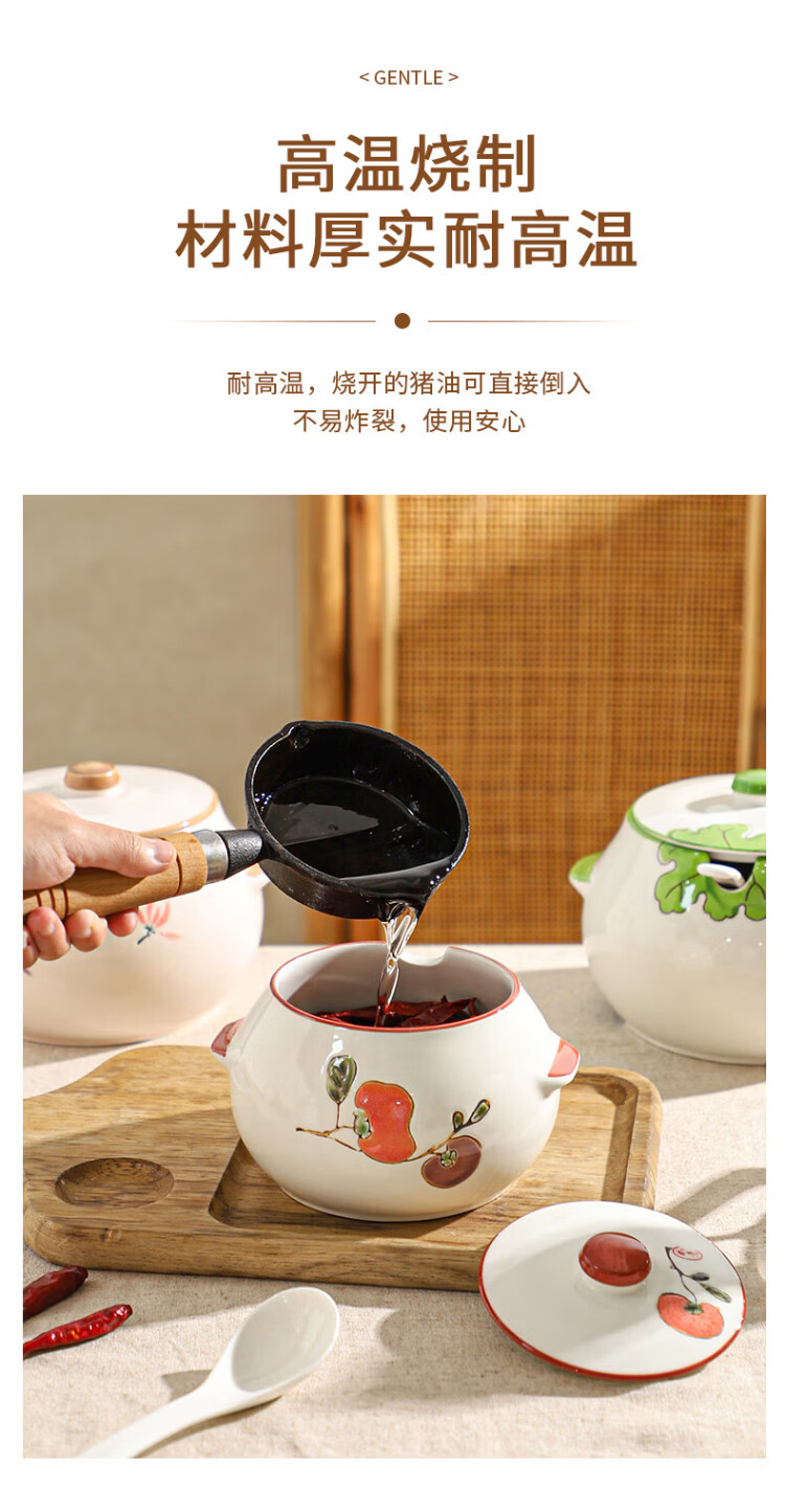 Sheli ceramic lard can with lid, high temperature resistance, household oil pot with lid, oil pot, seasoning jar, chili oil special medium lard pot 880ML - lotus style, with lid and spoon | can pour boiling oil