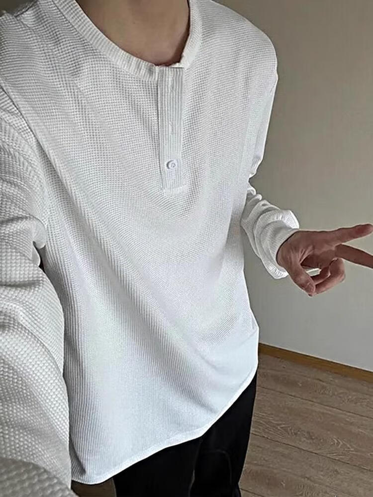 Katuchi American Henry collar long-sleeved T-shirt for men in summer, loose and thin waffle guard clothes, high-end inner layering shirt, black XL