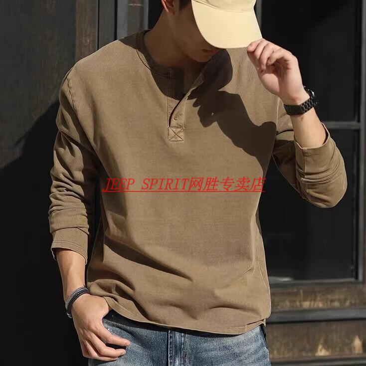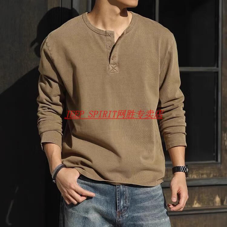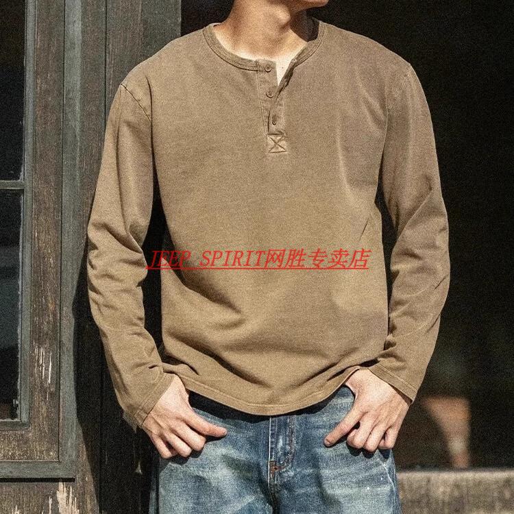 JEEP SPIRIT Jeep American retro men's henley shirt long-sleeved washed distressed t-shirt men's heavy henley collar top brown original M