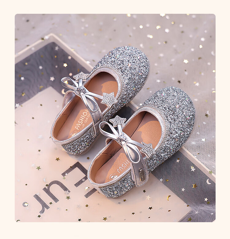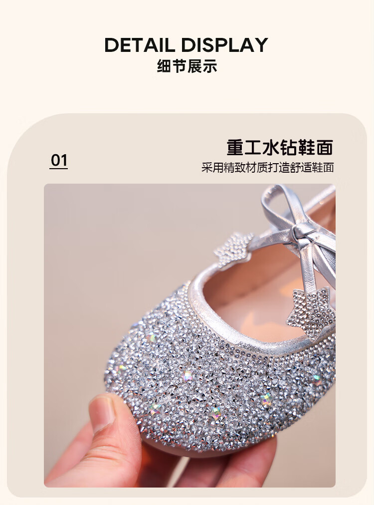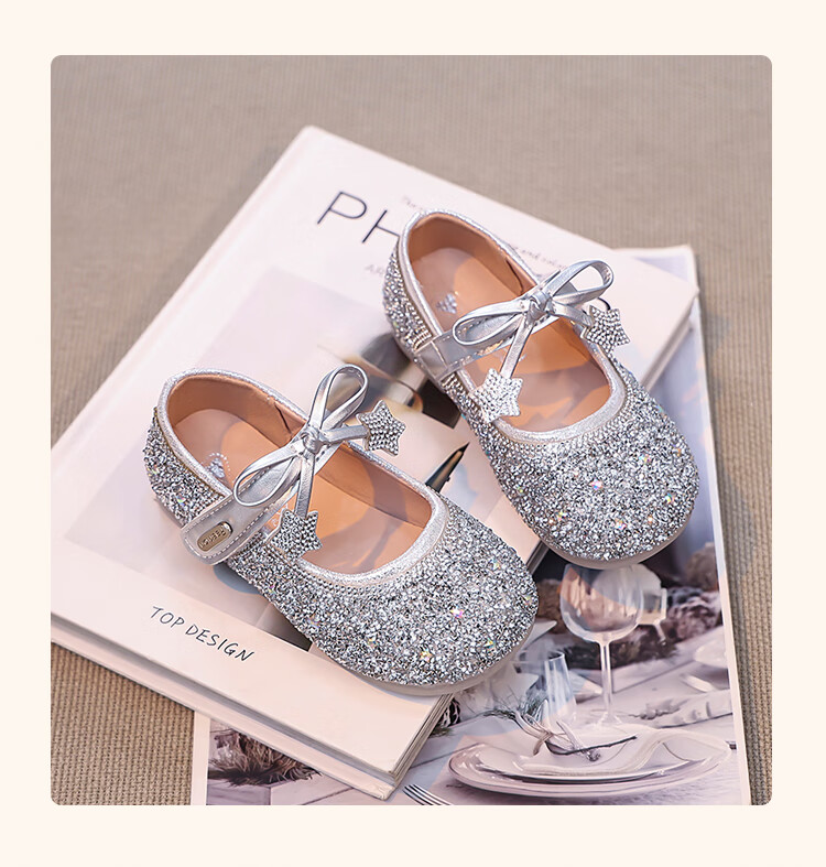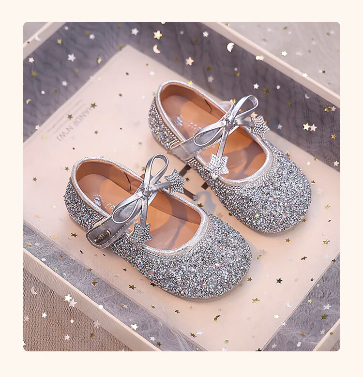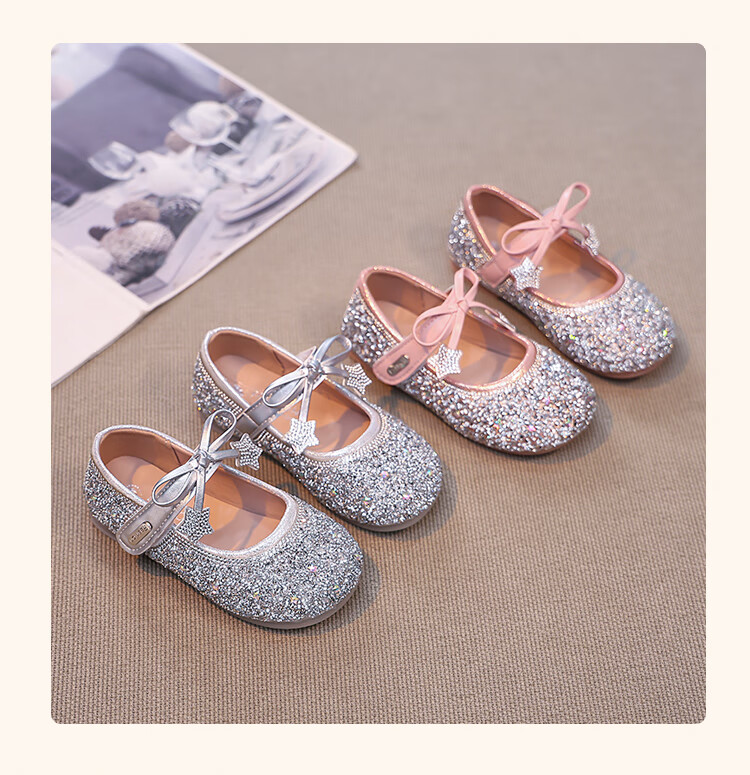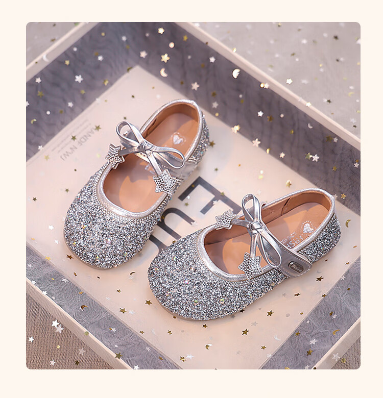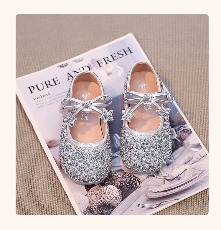 Girls Princess Shoes 2025 Spring and Autumn New Soft Sole Genuine Leather Children's Elsa Sparkling Crystal Shoes with Dress Shoes Silver 29
