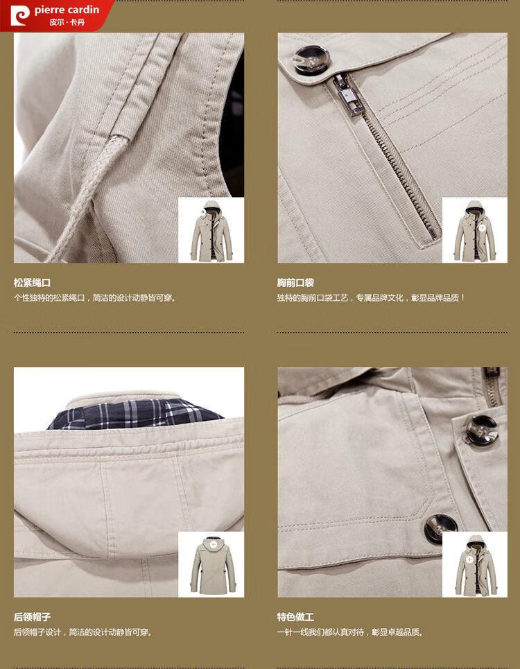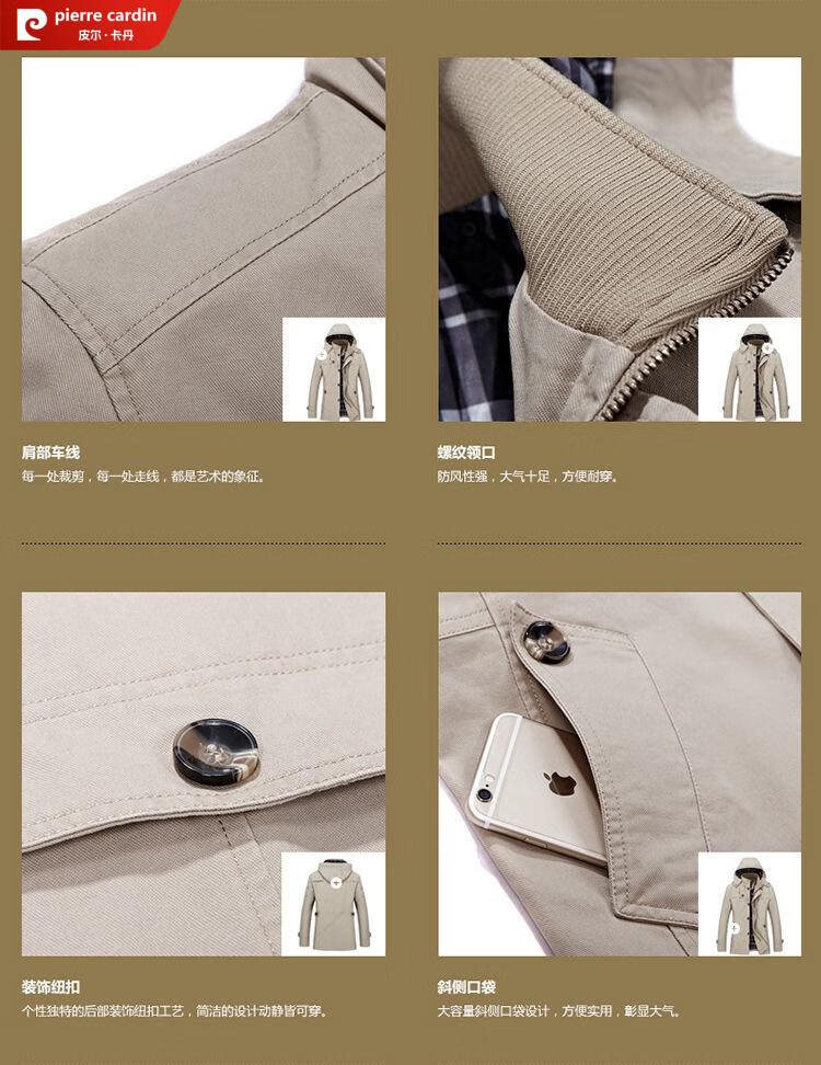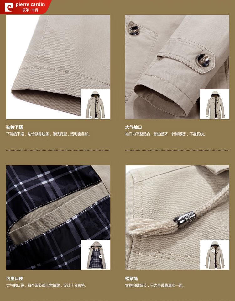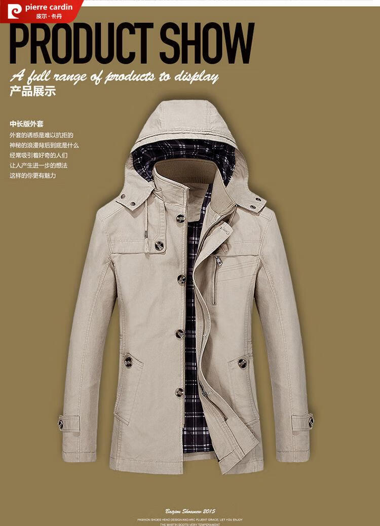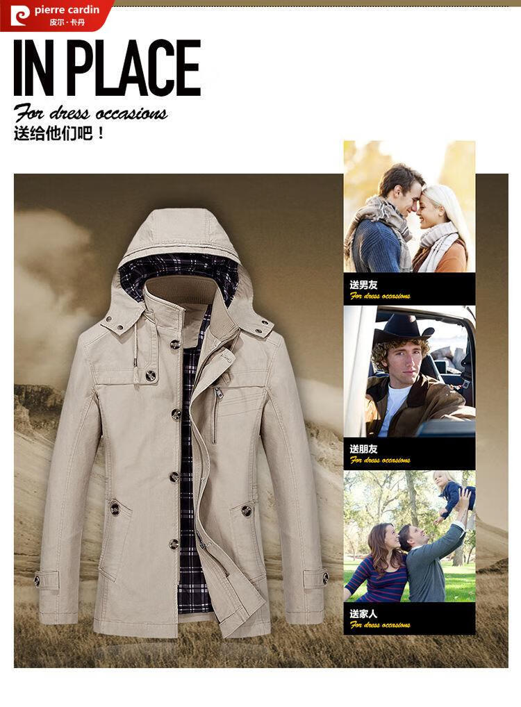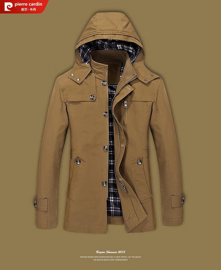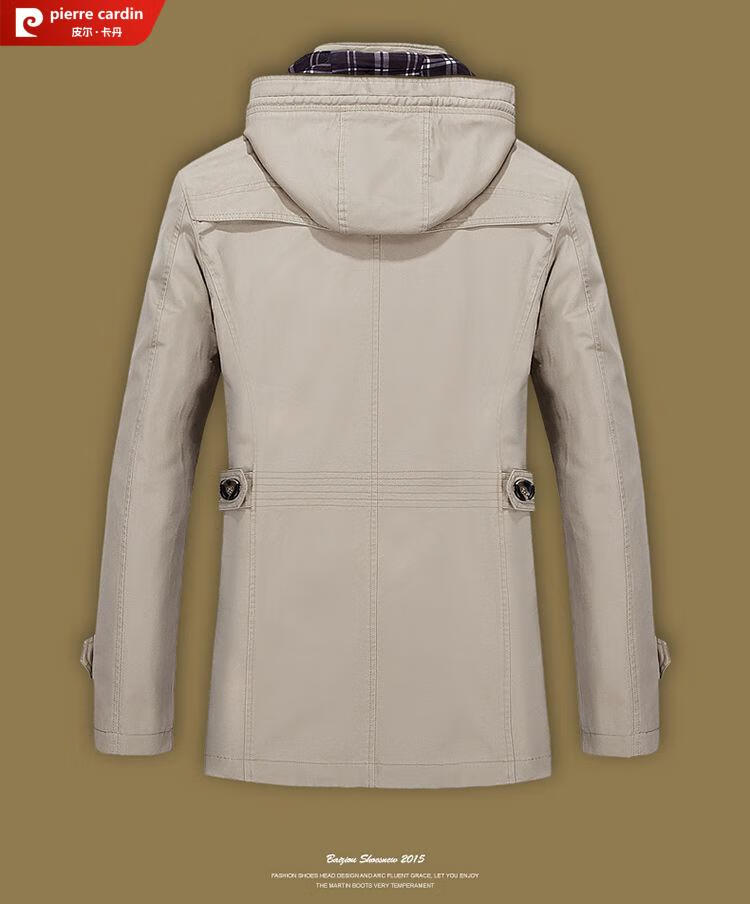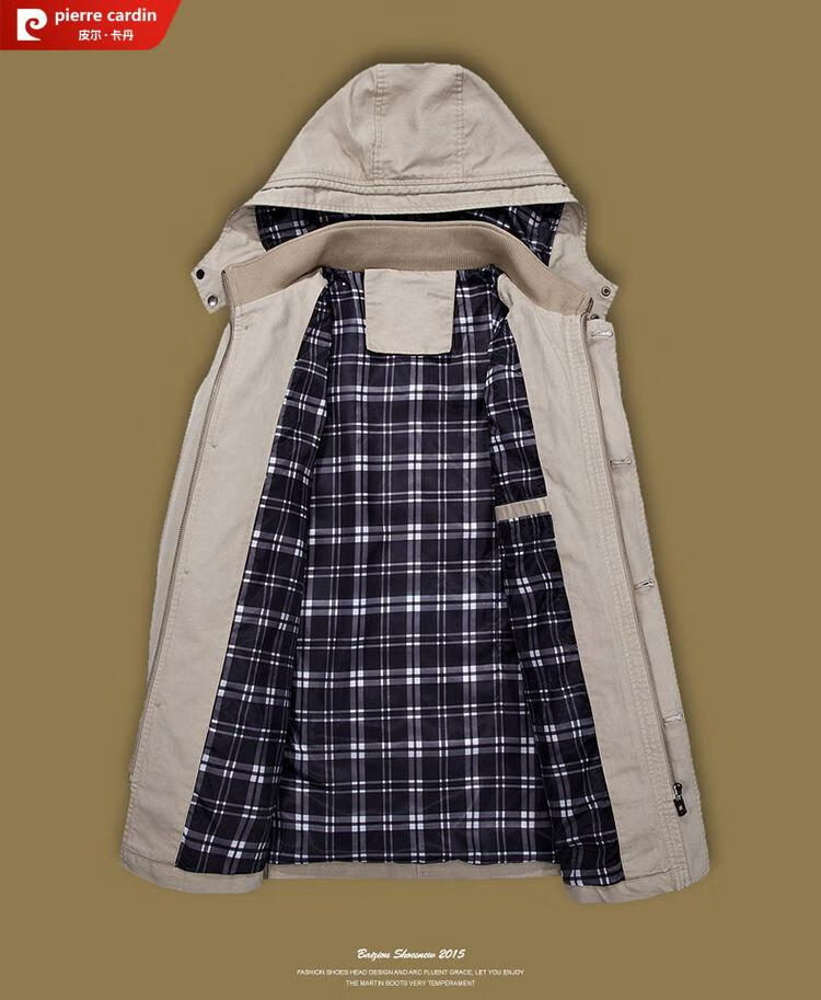 Pierre Cardin spring and autumn pure cotton mid-length windbreaker men's buttoned casual jacket middle-aged autumn coat coat outer hooded jacket light khaki A352-1311 jacket XL