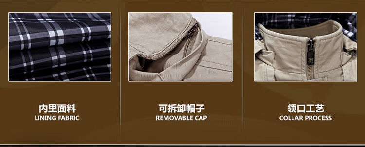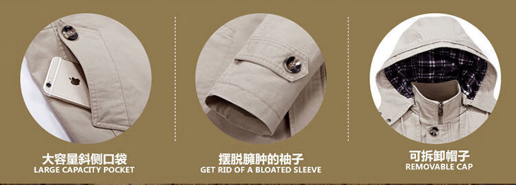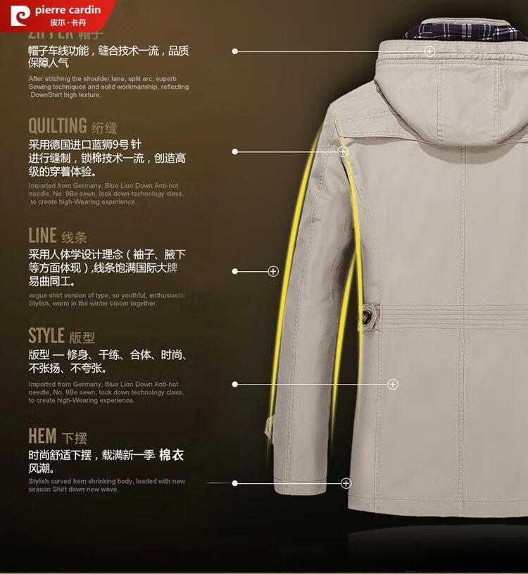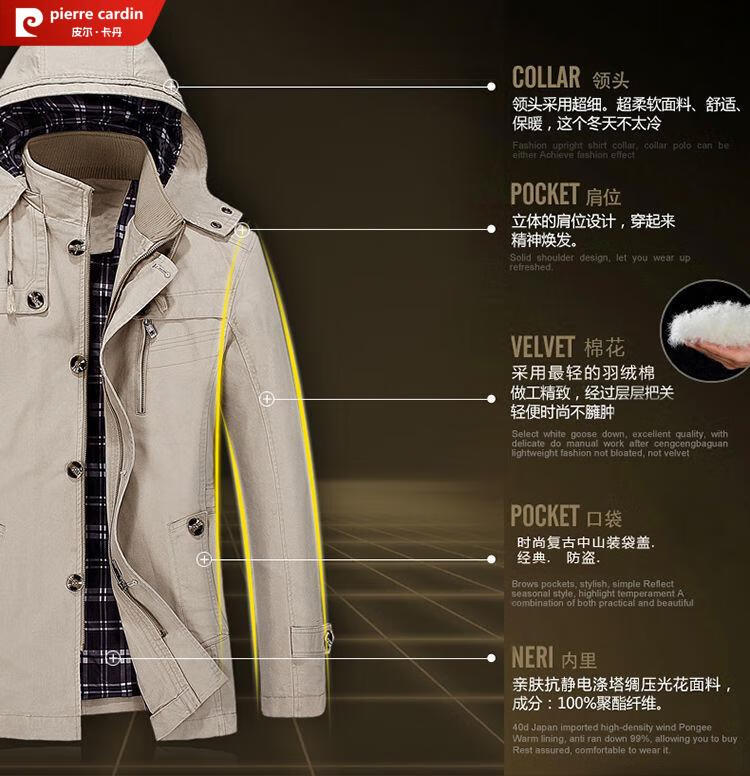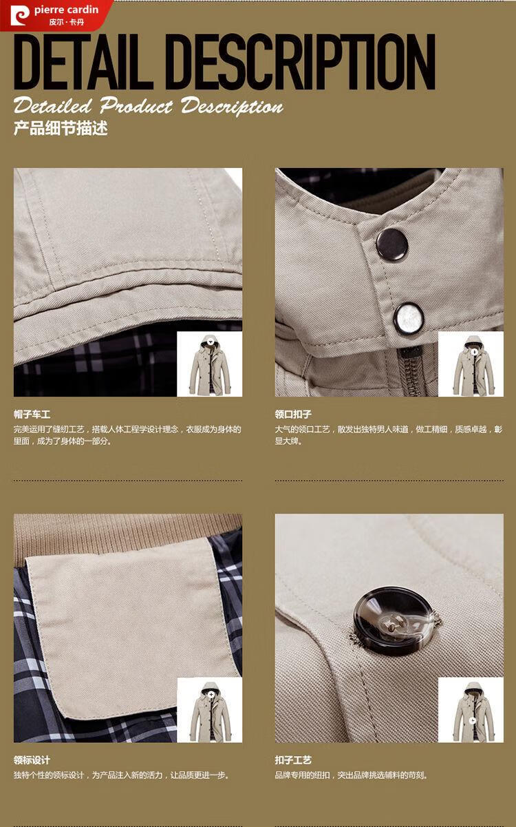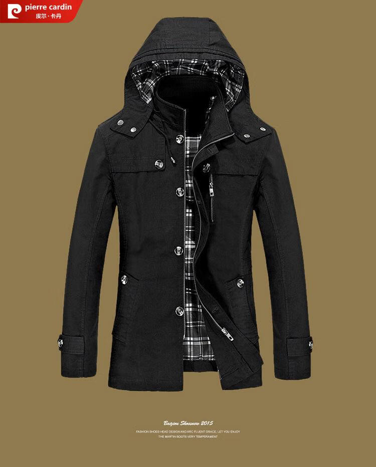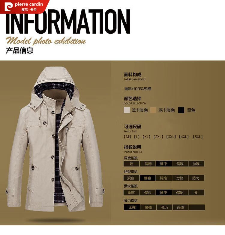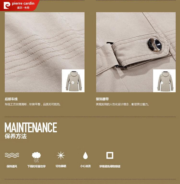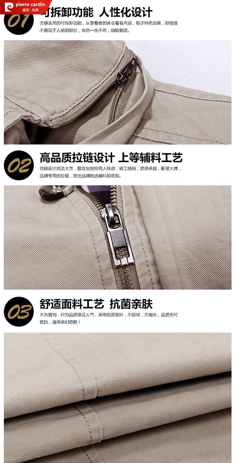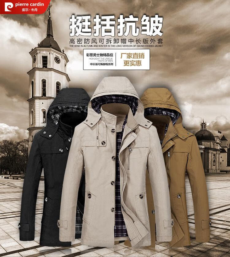 Pierre Cardin spring and autumn pure cotton mid-length windbreaker men's buttoned casual jacket middle-aged autumn coat coat outer hooded jacket light khaki A352-1311 jacket XL