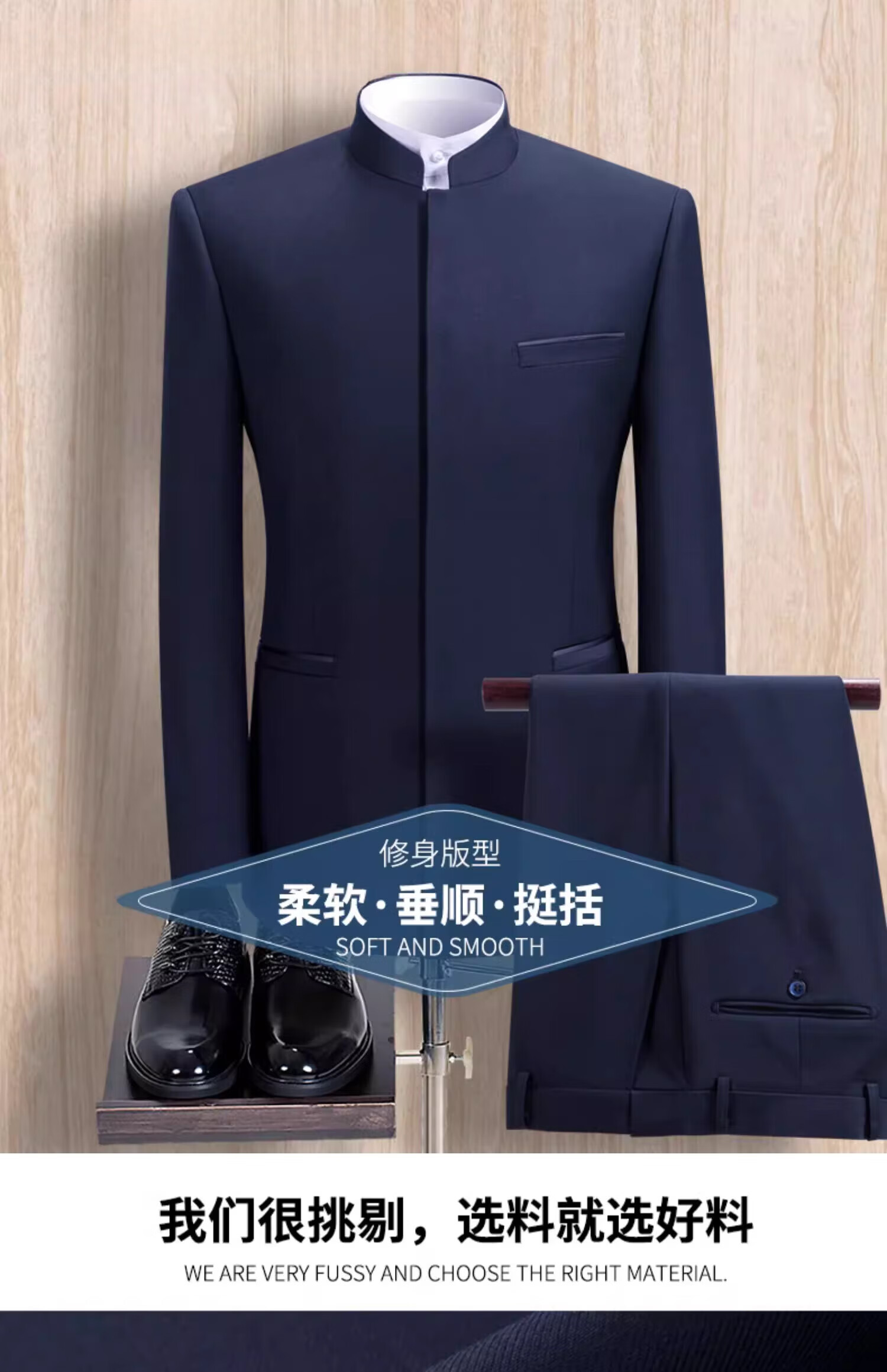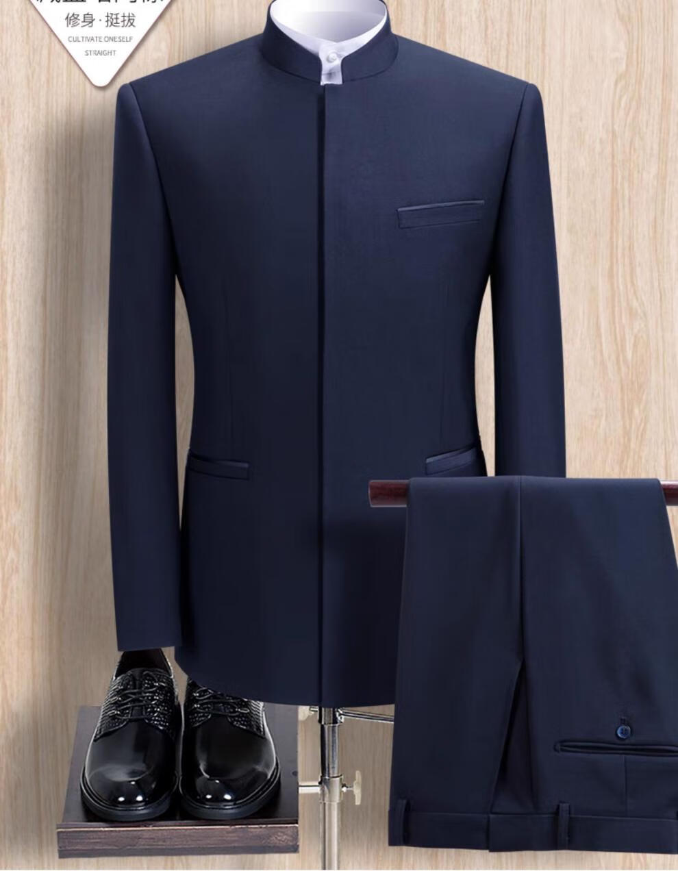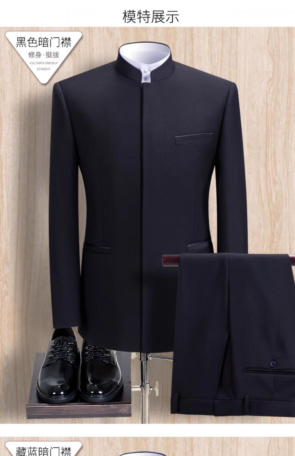 Luo Meng Chinese tunic suit for young men, slim fit Chinese stand-up collar suit, Chinese style trendy groom, Chinese wedding, black hidden button top and pants + gift bag 170A