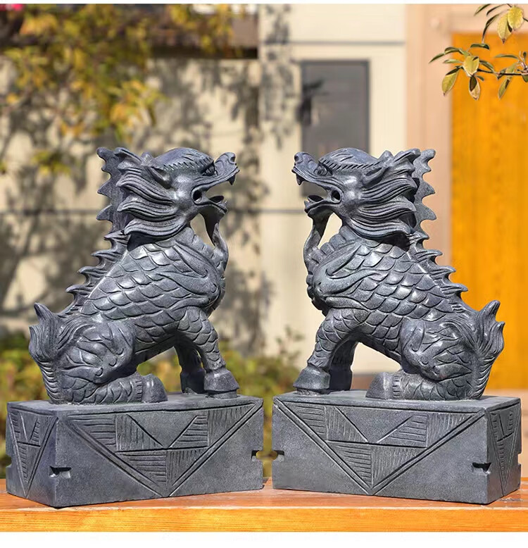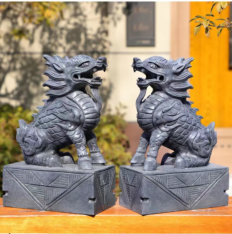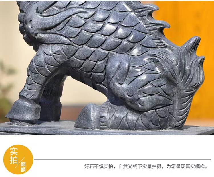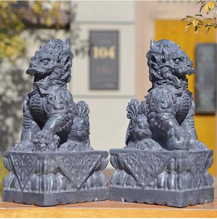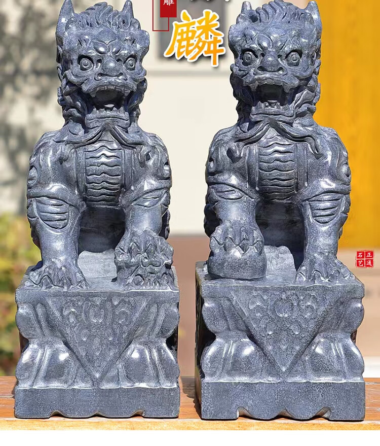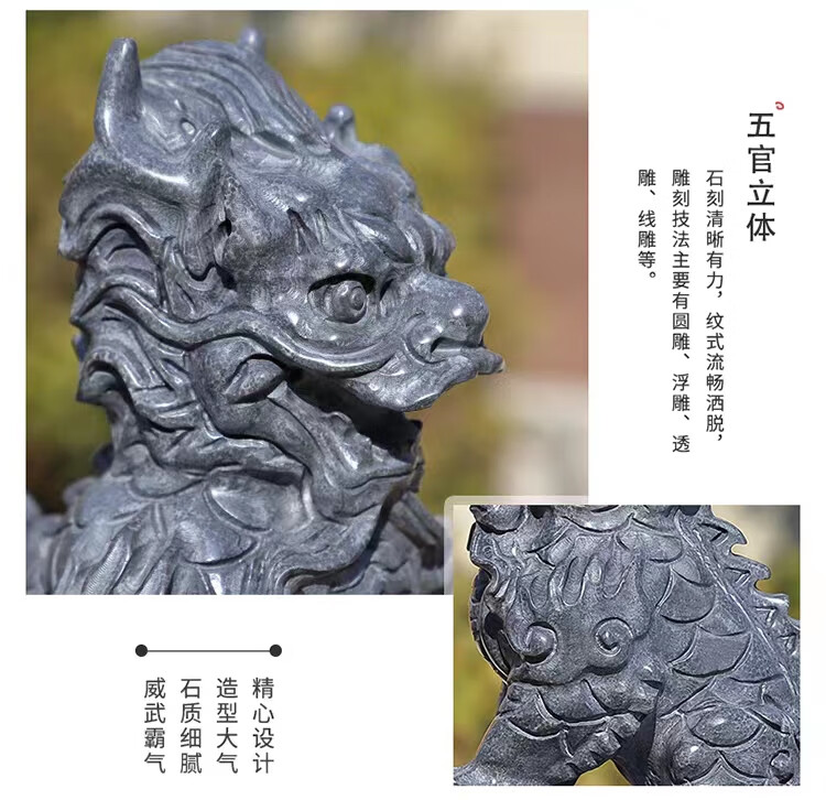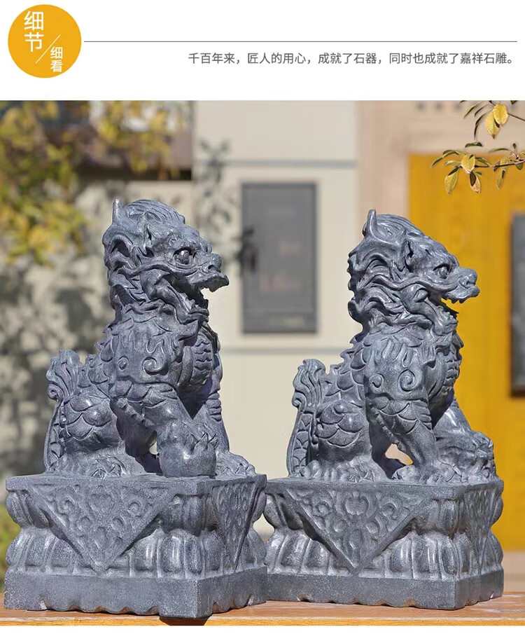 A pair of stone carvings and stone unicorns. A pair of bluestone carvings for town houses, home courtyards, outdoor fortune-seeking beasts, and villa entrance ornaments. Dragon claw unicorns are 75 meters long, 50 meters wide, and 15 meters high.