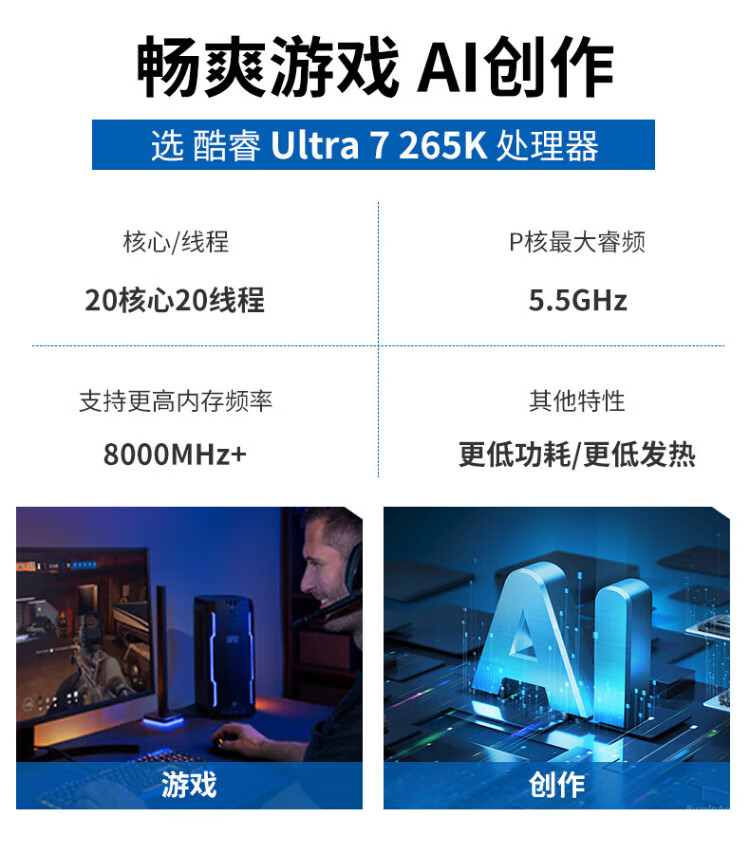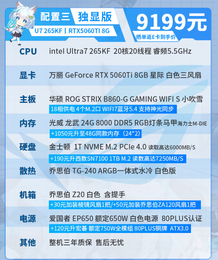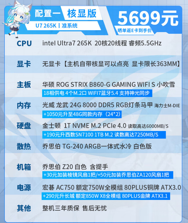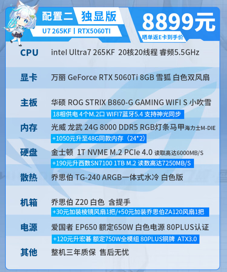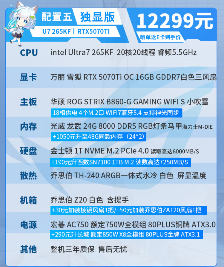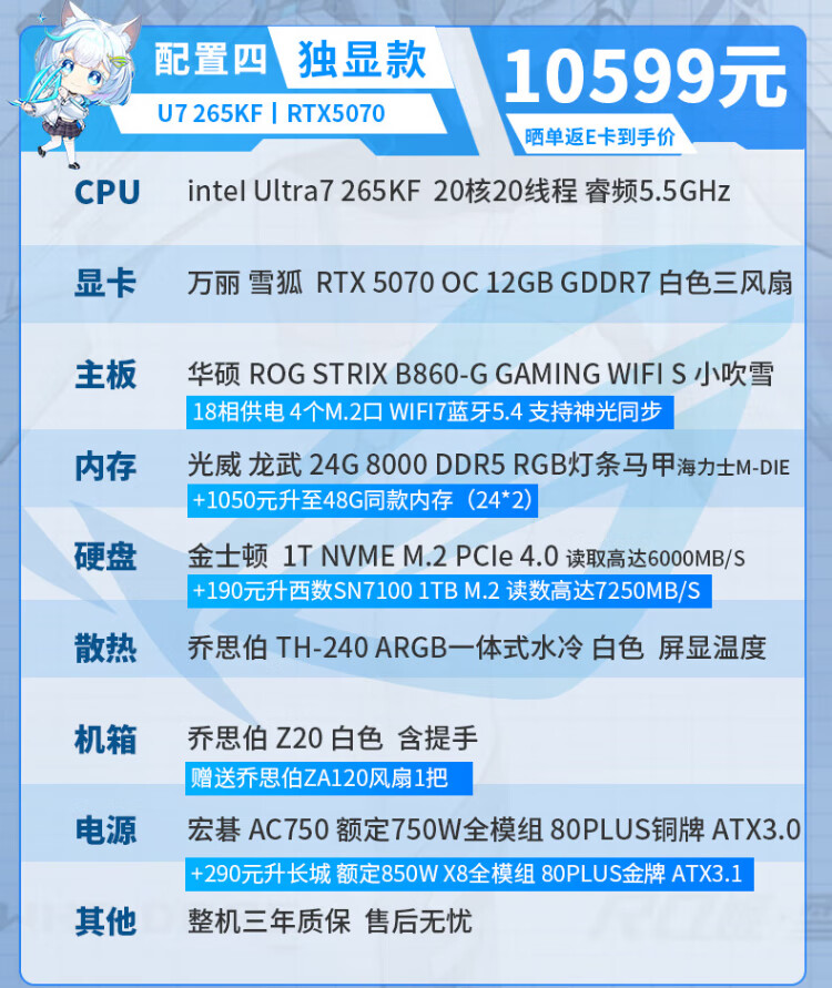 ASUS ROG Kobuki Snow intel Ultra7 265KF/RTX5080/5070TI/5060TI pure white mini ITX desktop assembly computer game console Qiao Sibo Z20 with six丨U7 265KF丨RTX5080