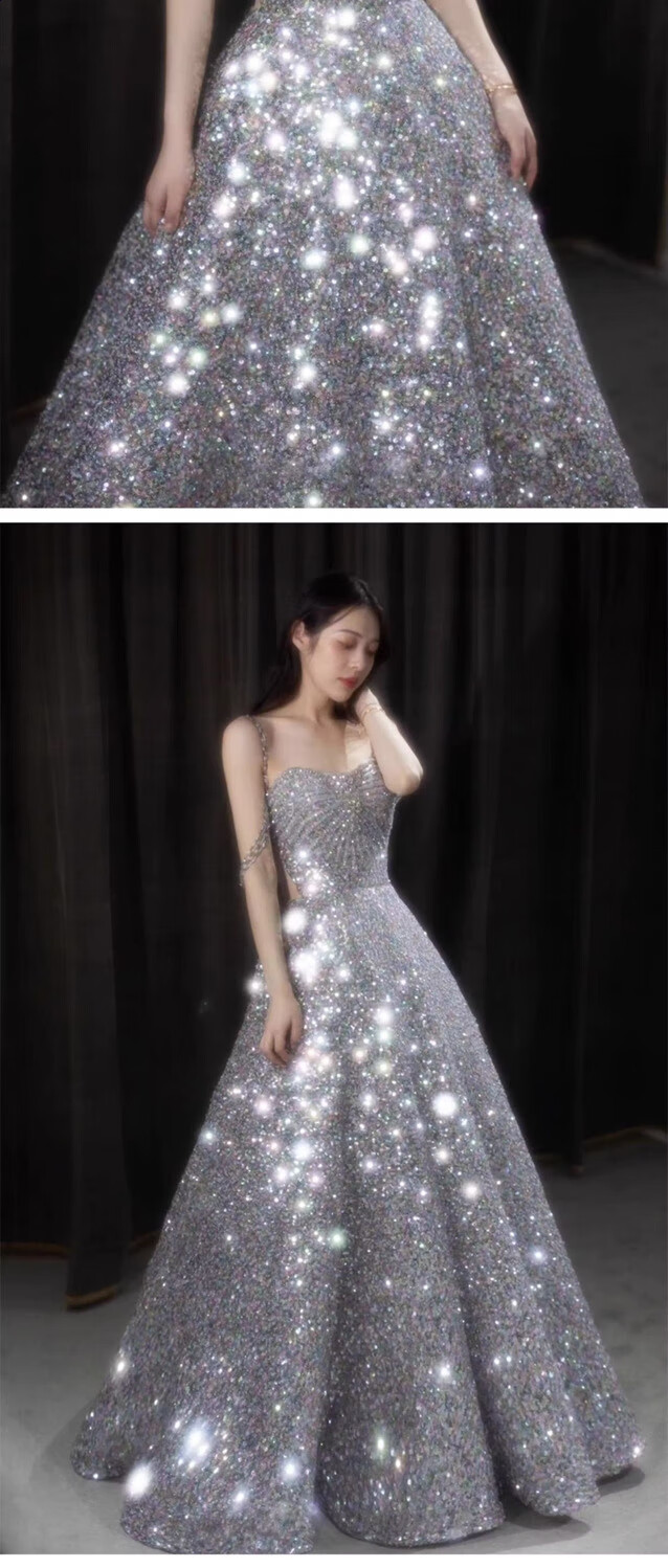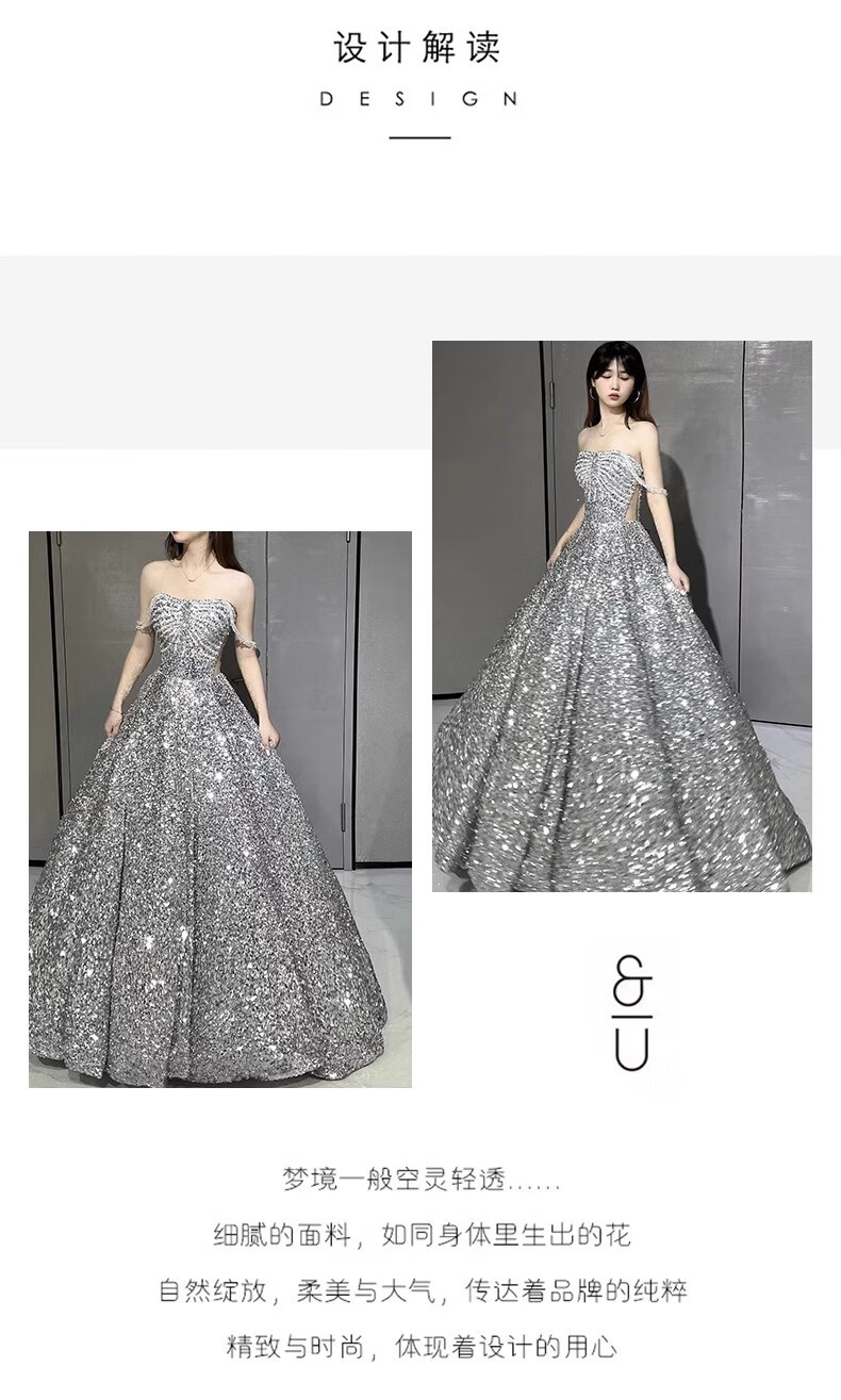 Mei Anjia starry sky sequined evening dress with light luxury temperament annual meeting host engagement wedding dress toasting dress bride silver sequin style XL