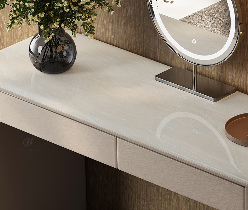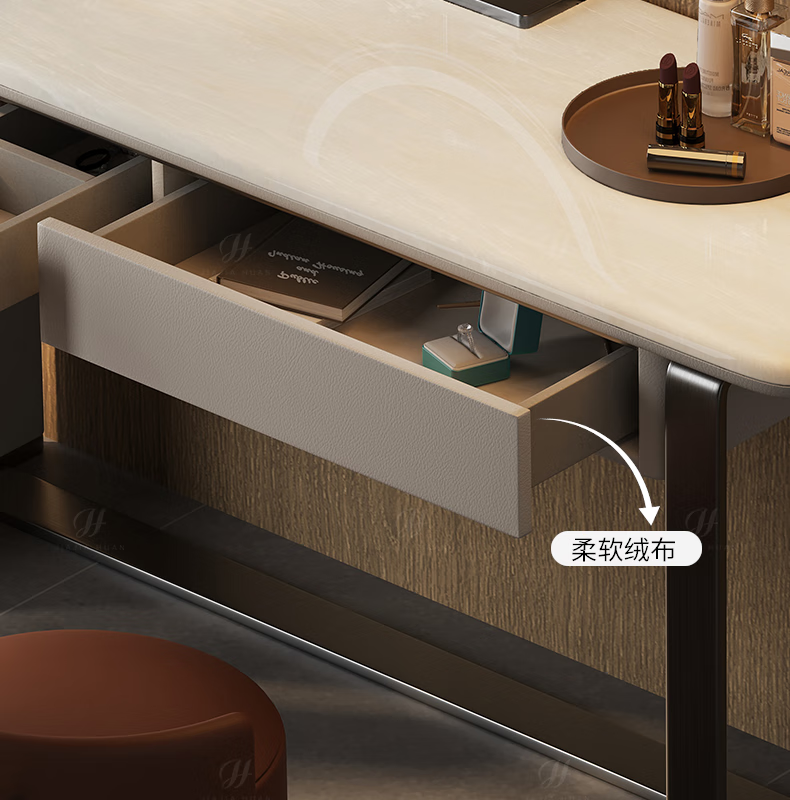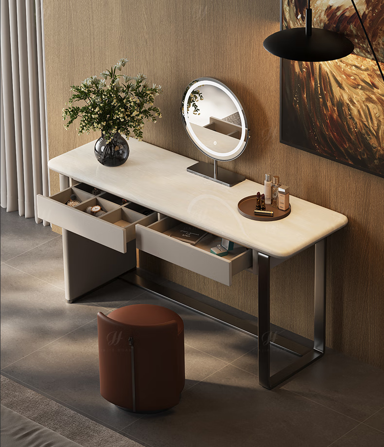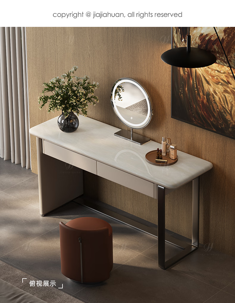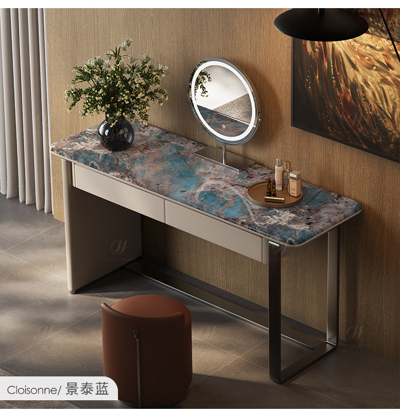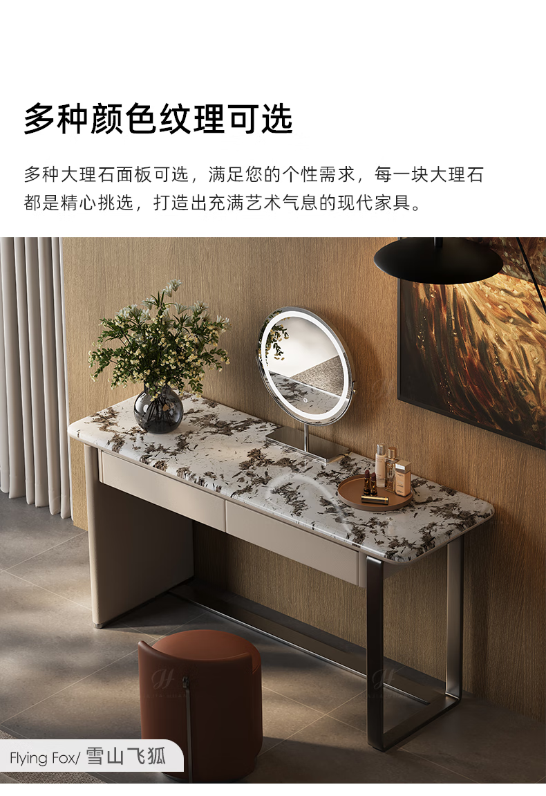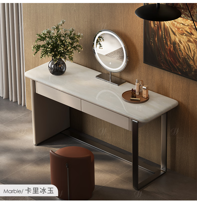 Jiajiahuan 2025 new Italian minimalist master bedroom dressing table with mirror marble bedroom high-end light luxury dressing table 0.8 meter dressing table + stool + mirror / Kari ice jade / gray titanium