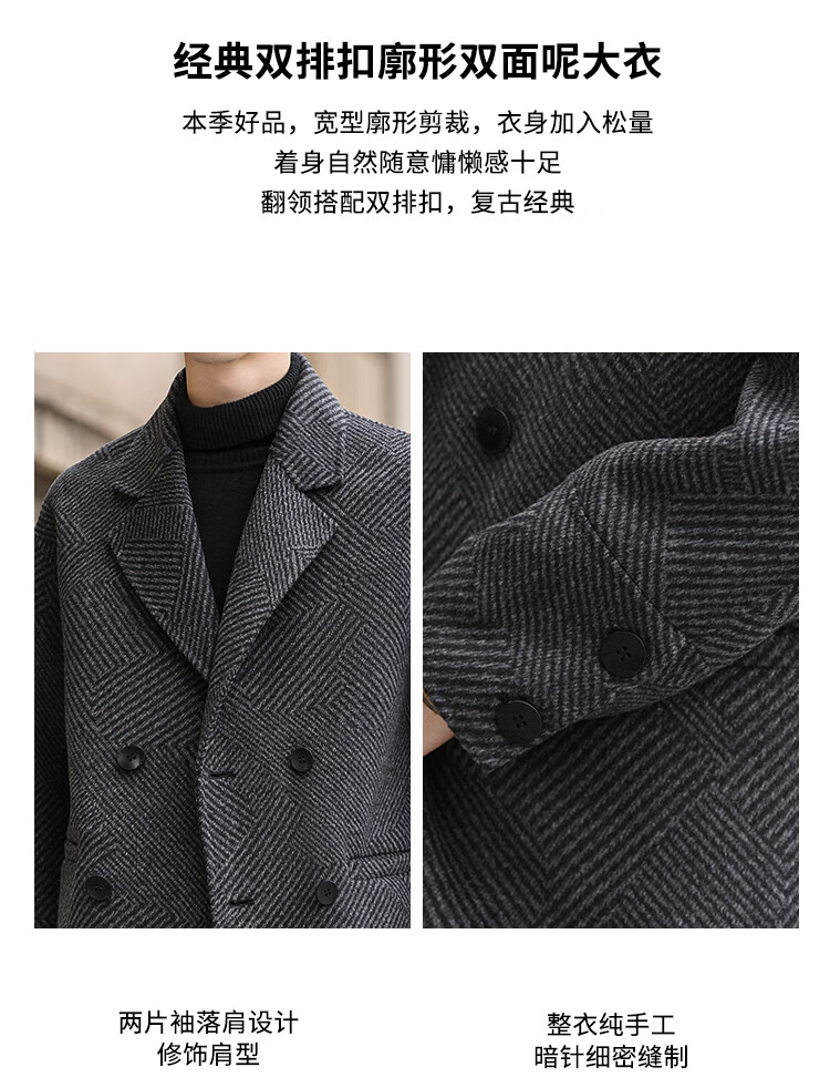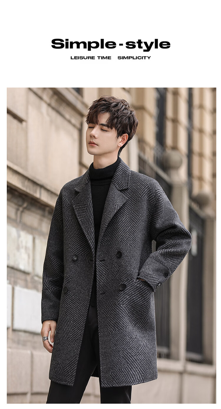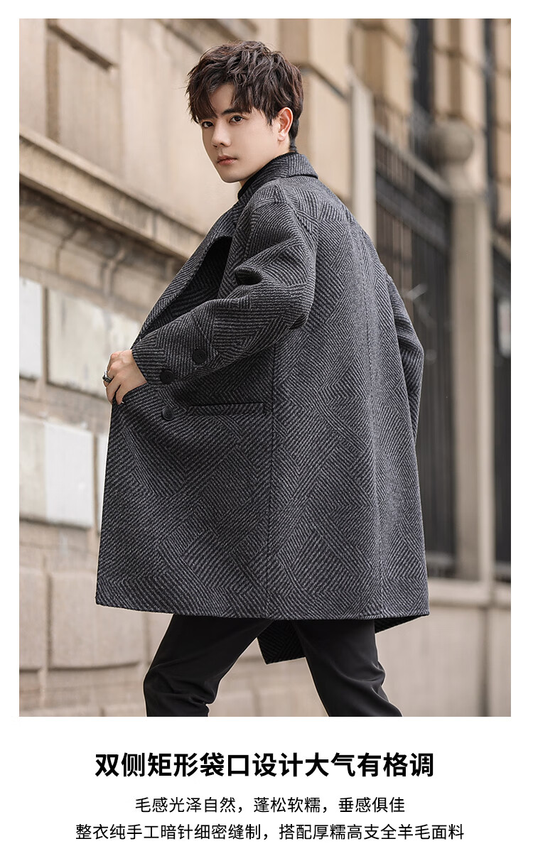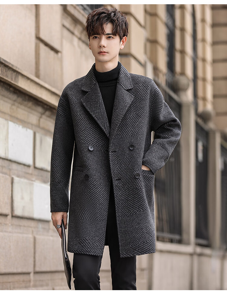 ROMON men's double-sided woolen coat 2025 mid-length autumn and winter woolen coat woolen windbreaker men's rhombus gray XL 180 recommended 140-155 Jin Jin equals 0.5 kg