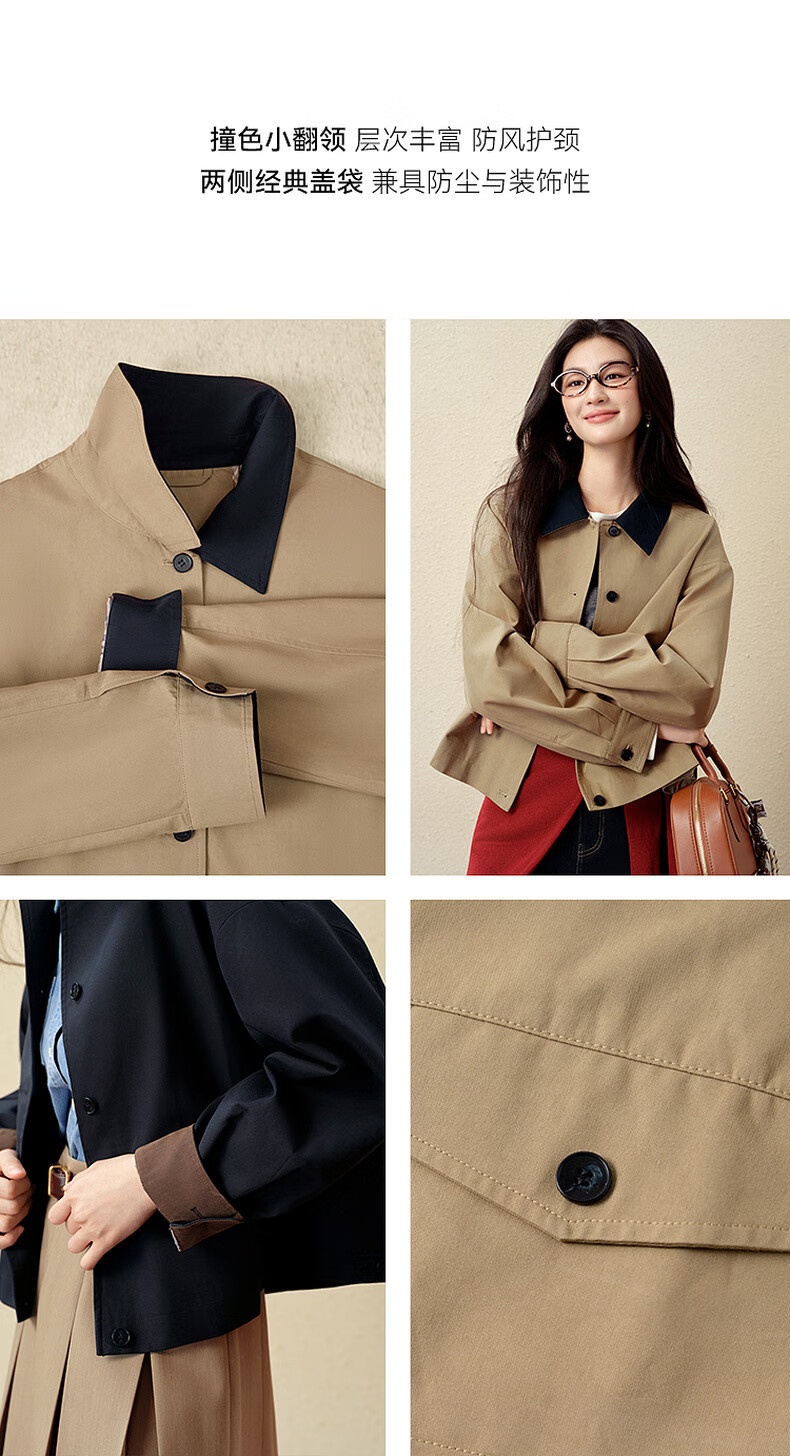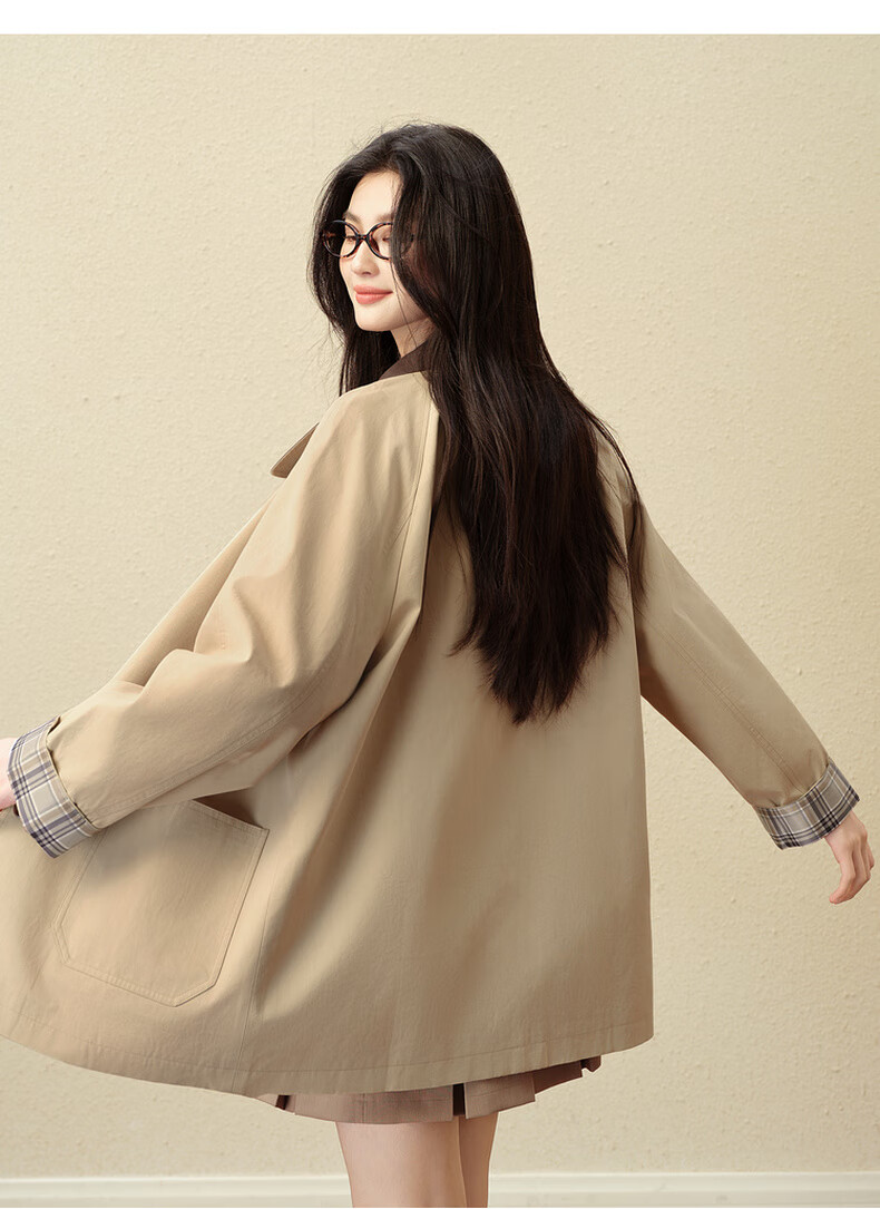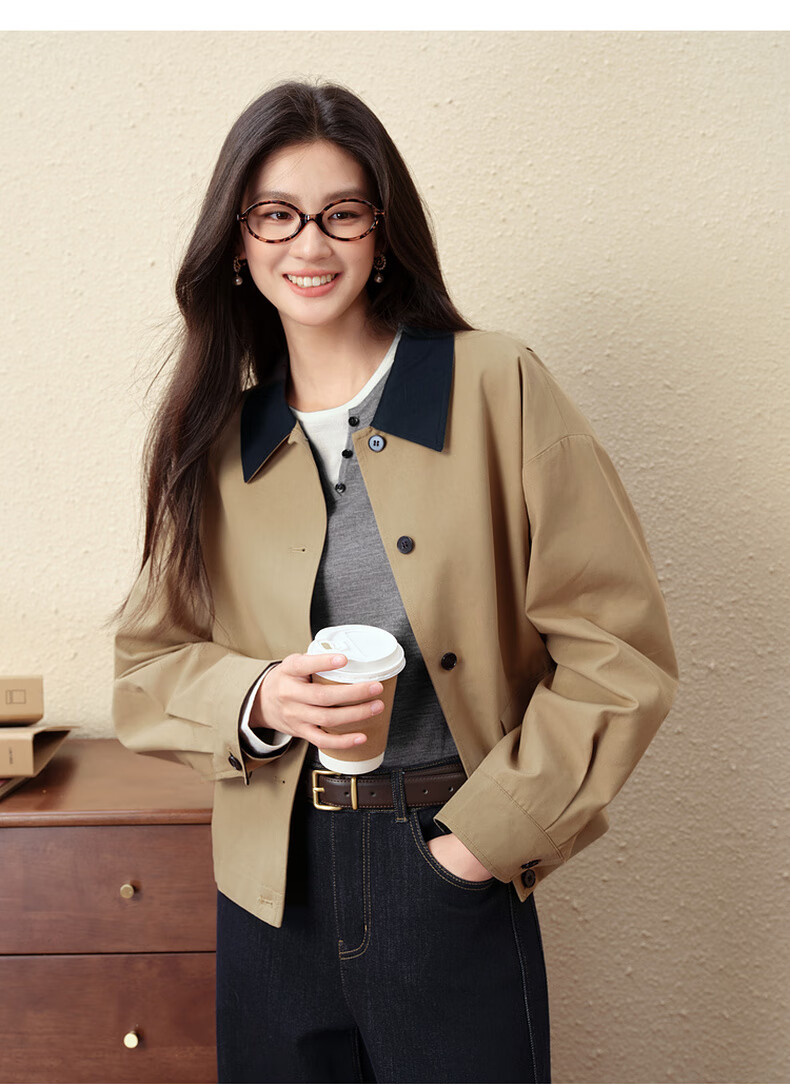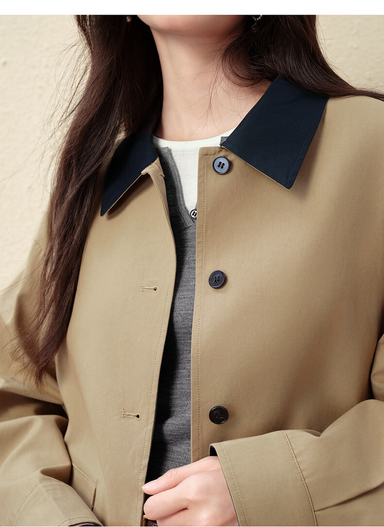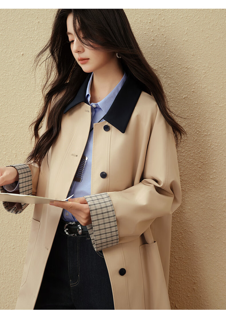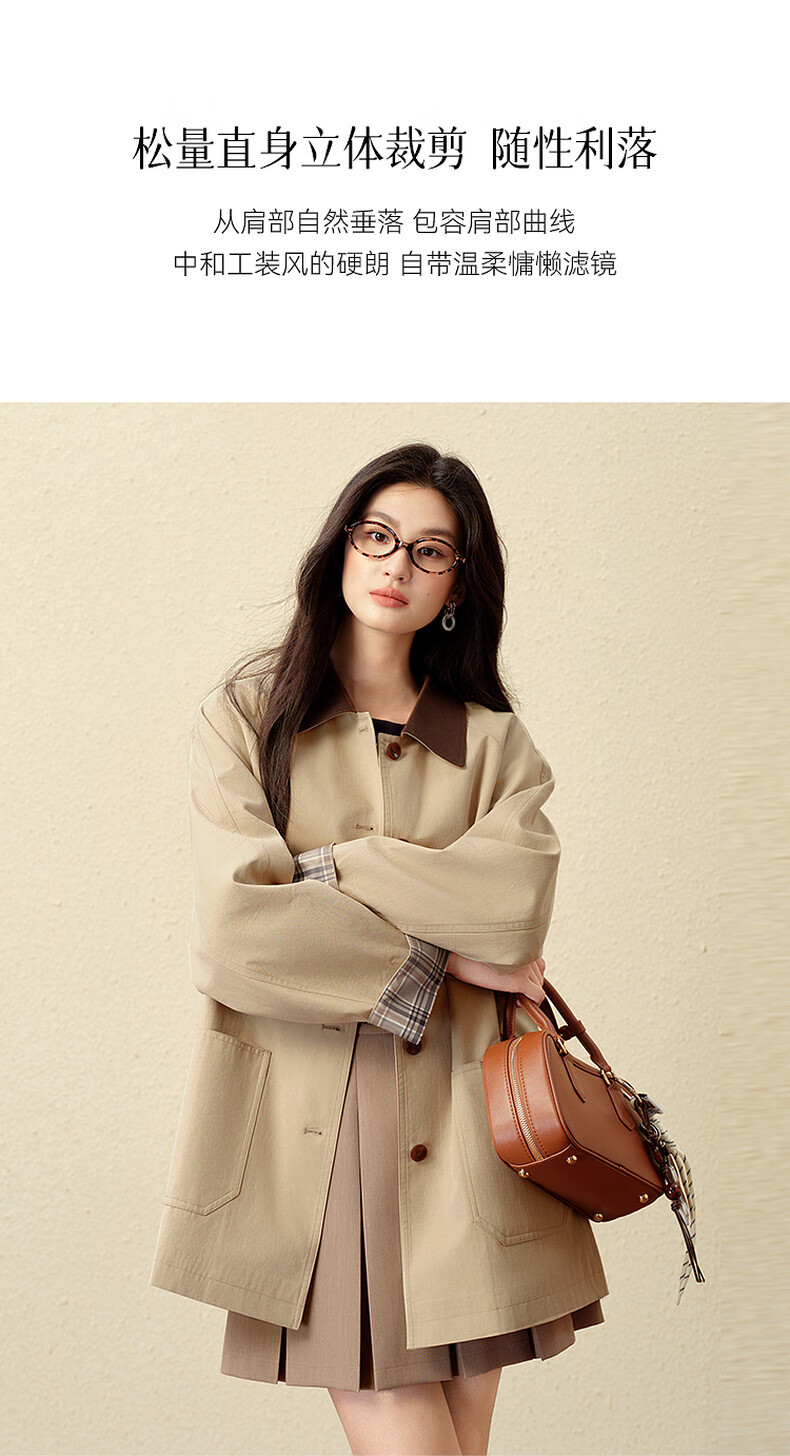 Shifanli Classic Barn Style Contrast Color Lapel Windbreaker 2025 Autumn New Style British Style Loose Casual Jacket Women Light Khaki M