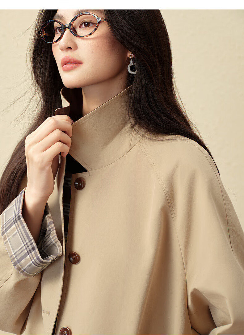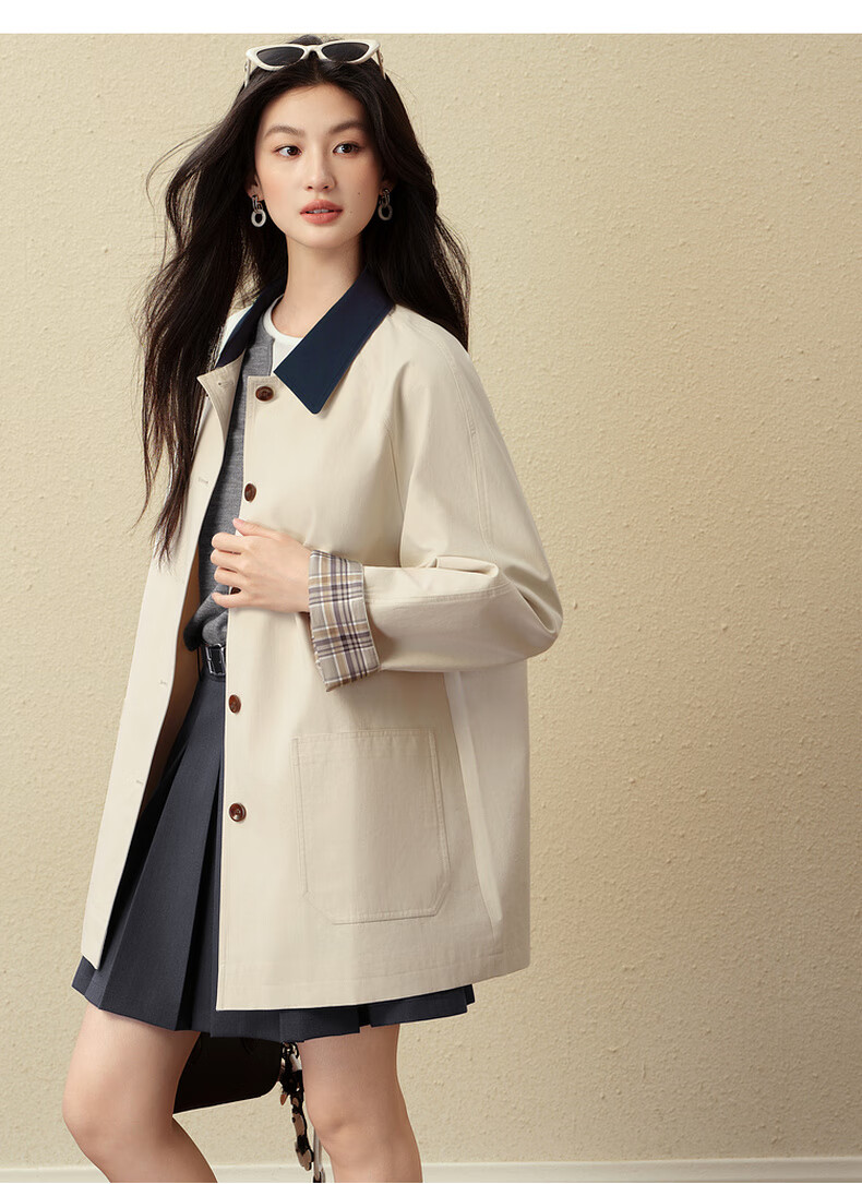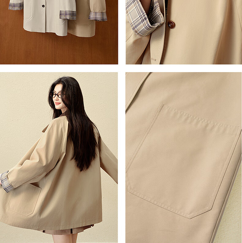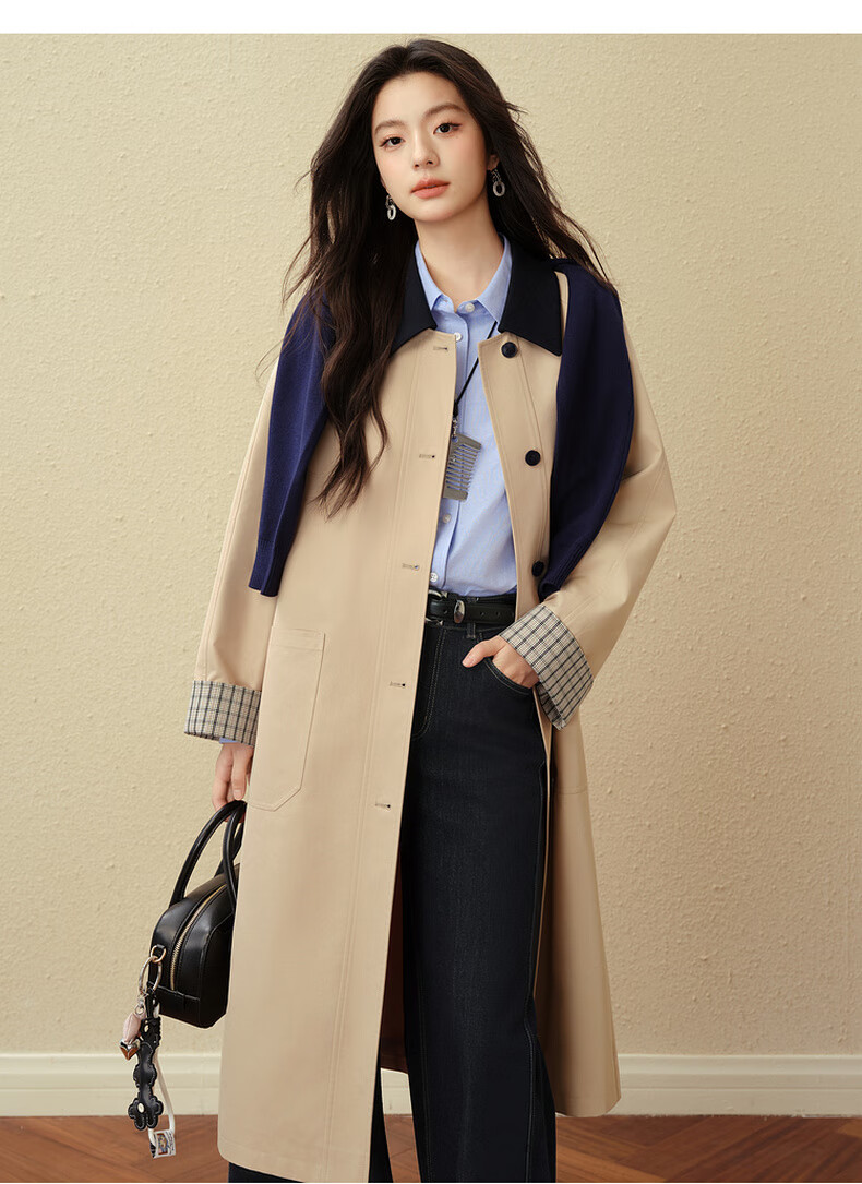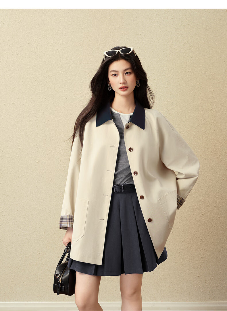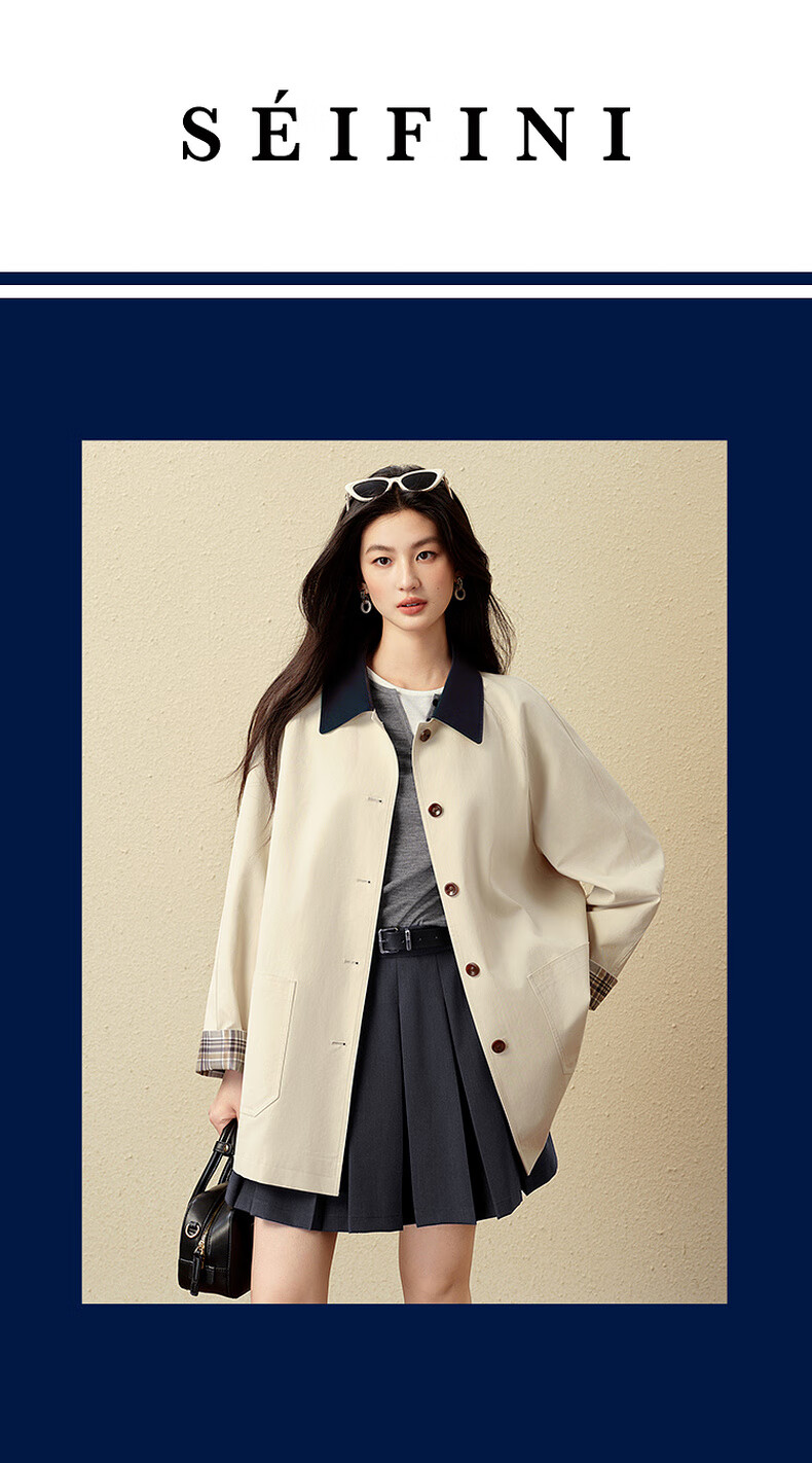 Shifanli Classic Barn Style Contrast Color Lapel Windbreaker 2025 Autumn New Style British Style Loose Casual Jacket Women Light Khaki M