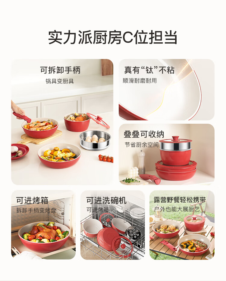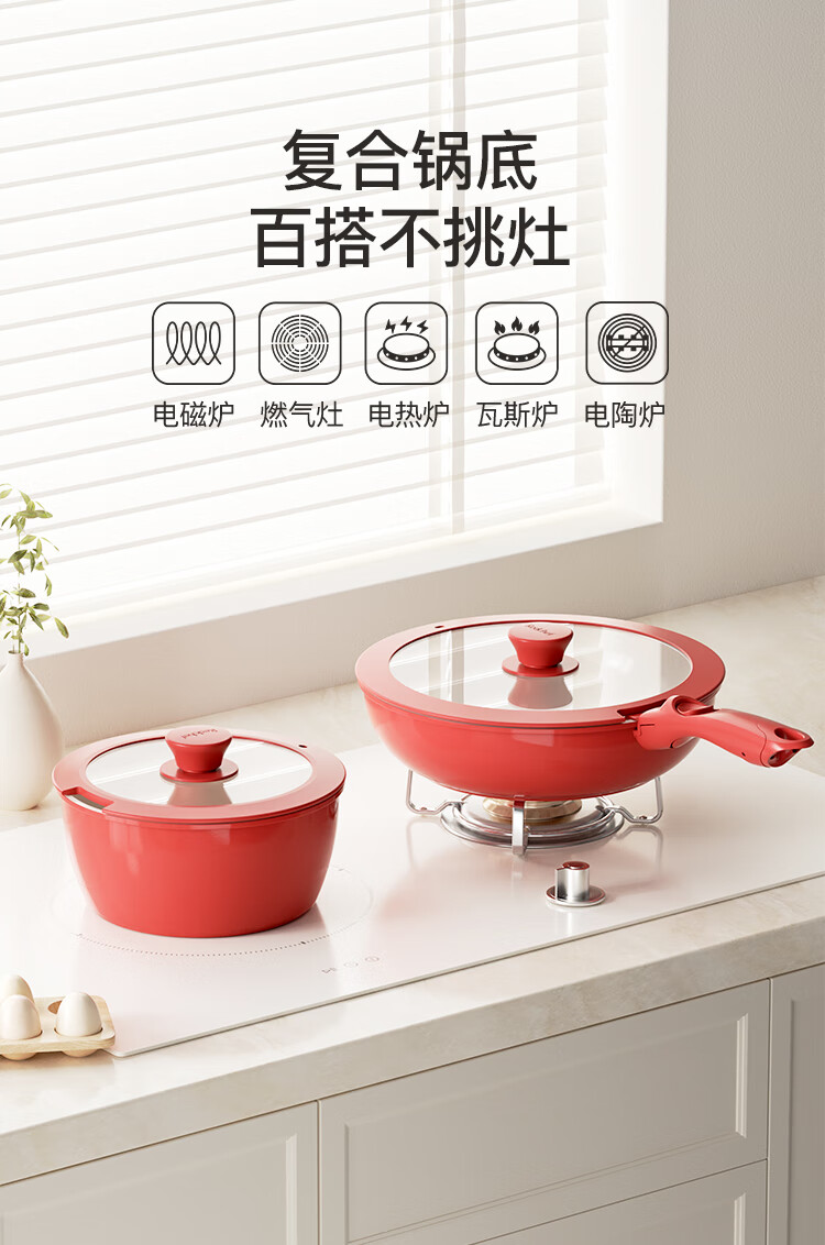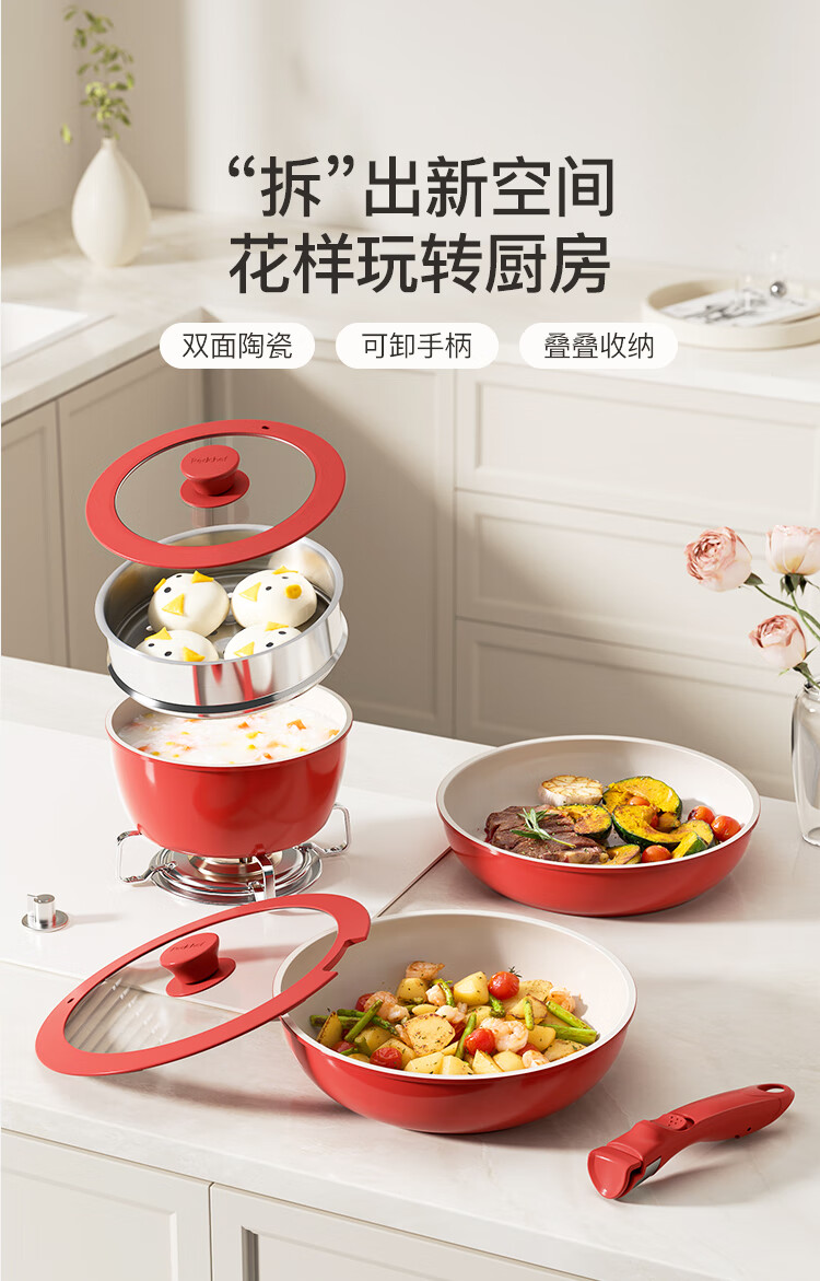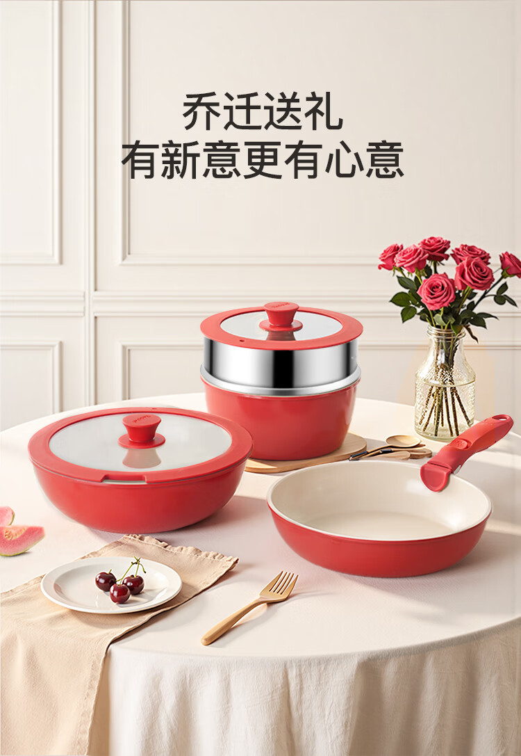 Hongchu ceramic removable handle pot household pot set non-stick pot full set soup milk pot wok frying pan gas universal wok + frying pan + milk pot red 7-piece set
